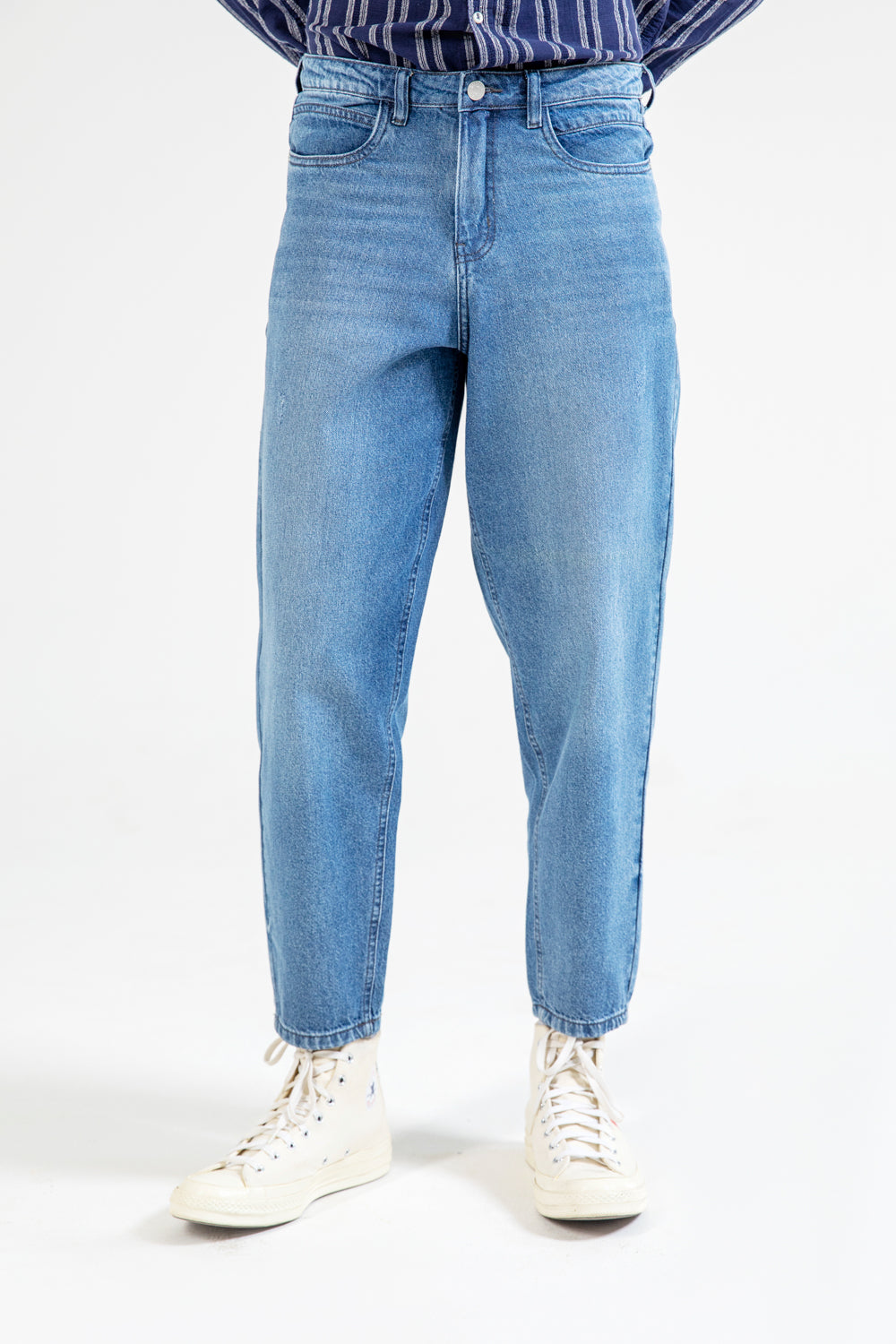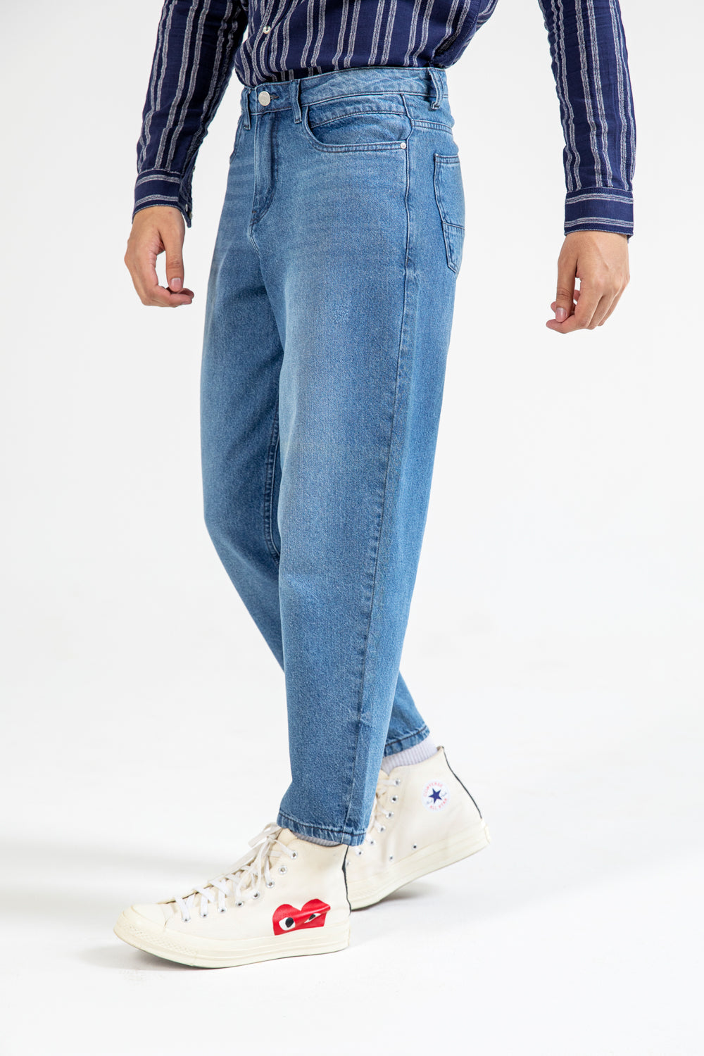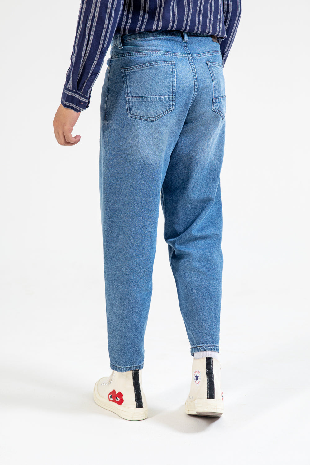 Blue denim with a loose cropped fit that gives a laid-back modern shape.
