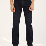 Dark blue slim relaxed fit denim with a clean silhouette.