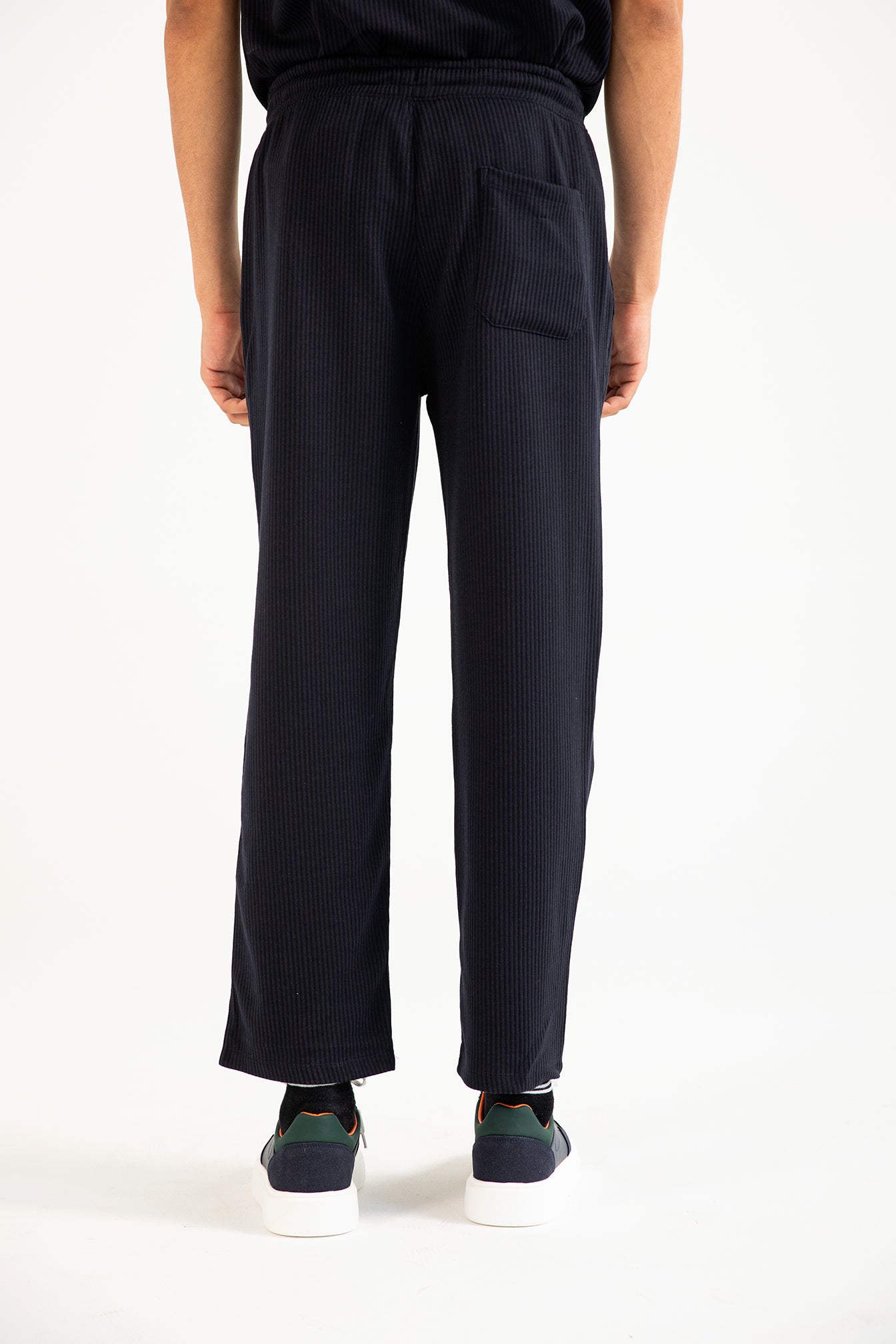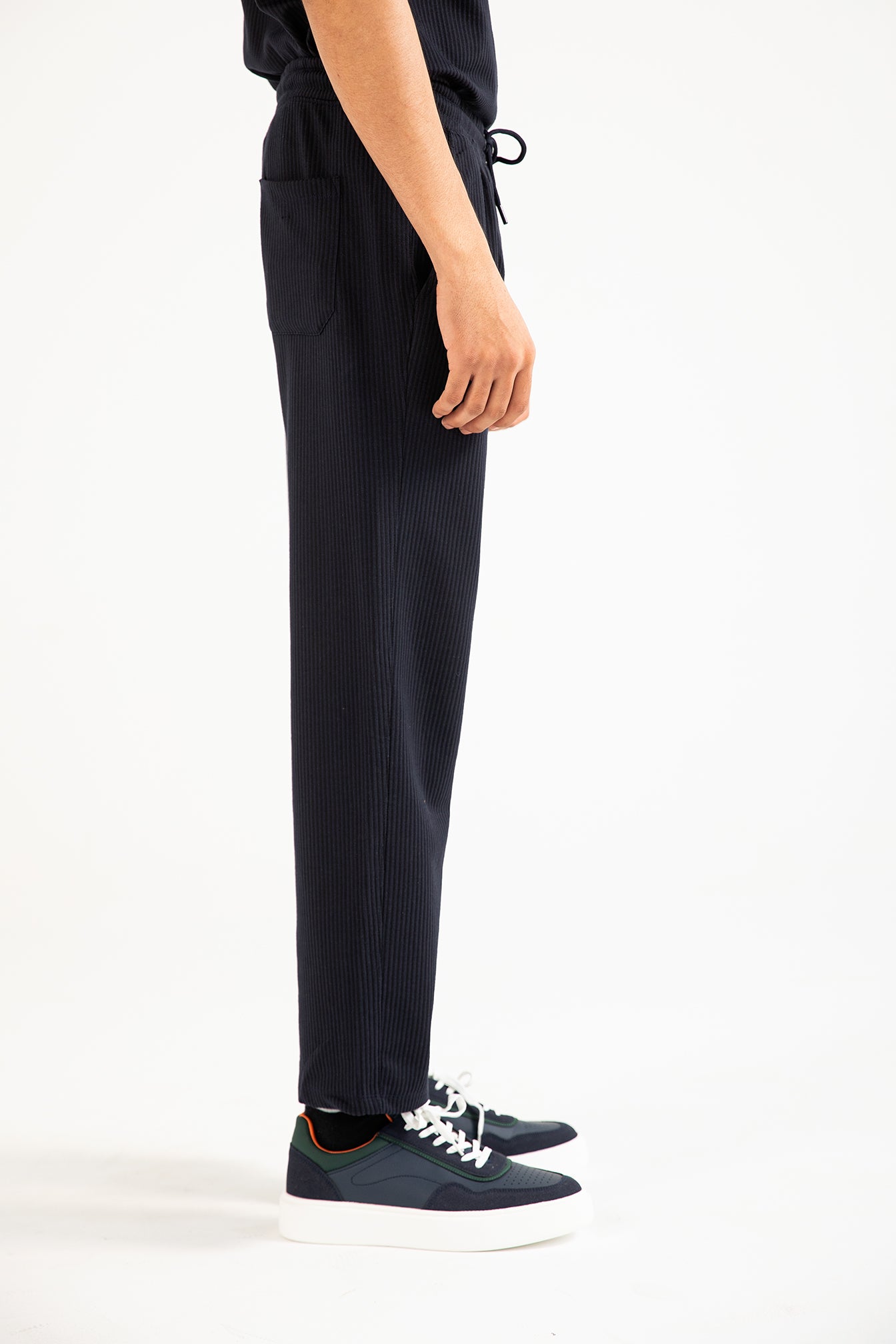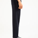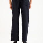 Navy knit trouser in a cotton synthetic blend, featuring an elasticated drawstring waist, textured finish, and a single back pocket.