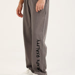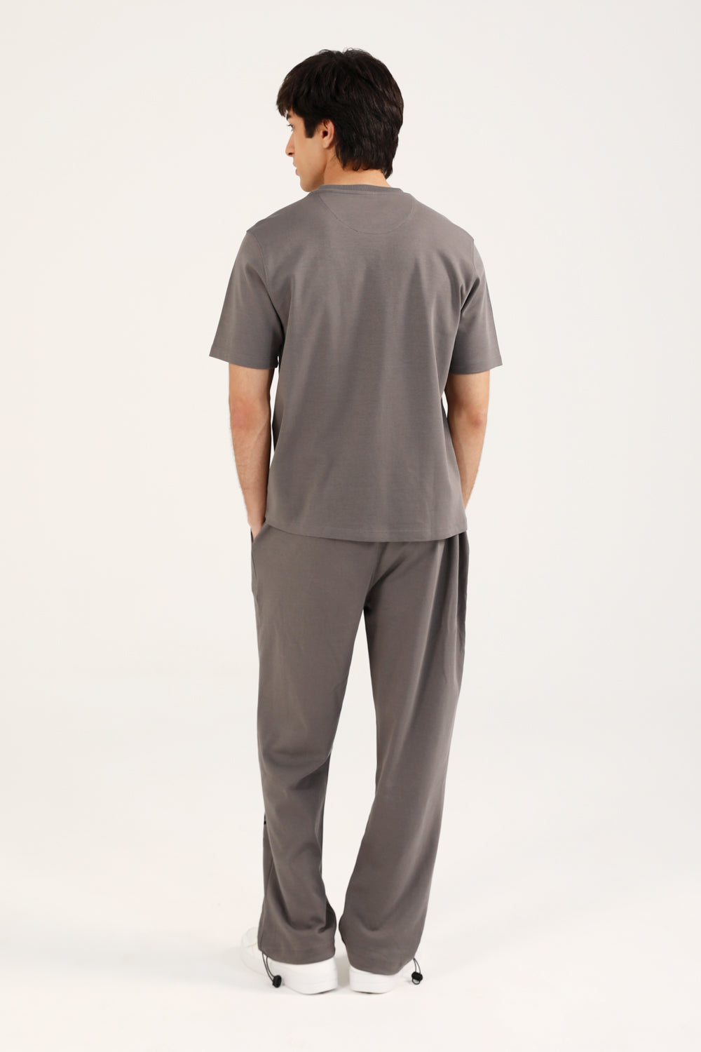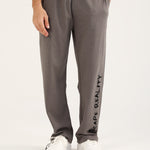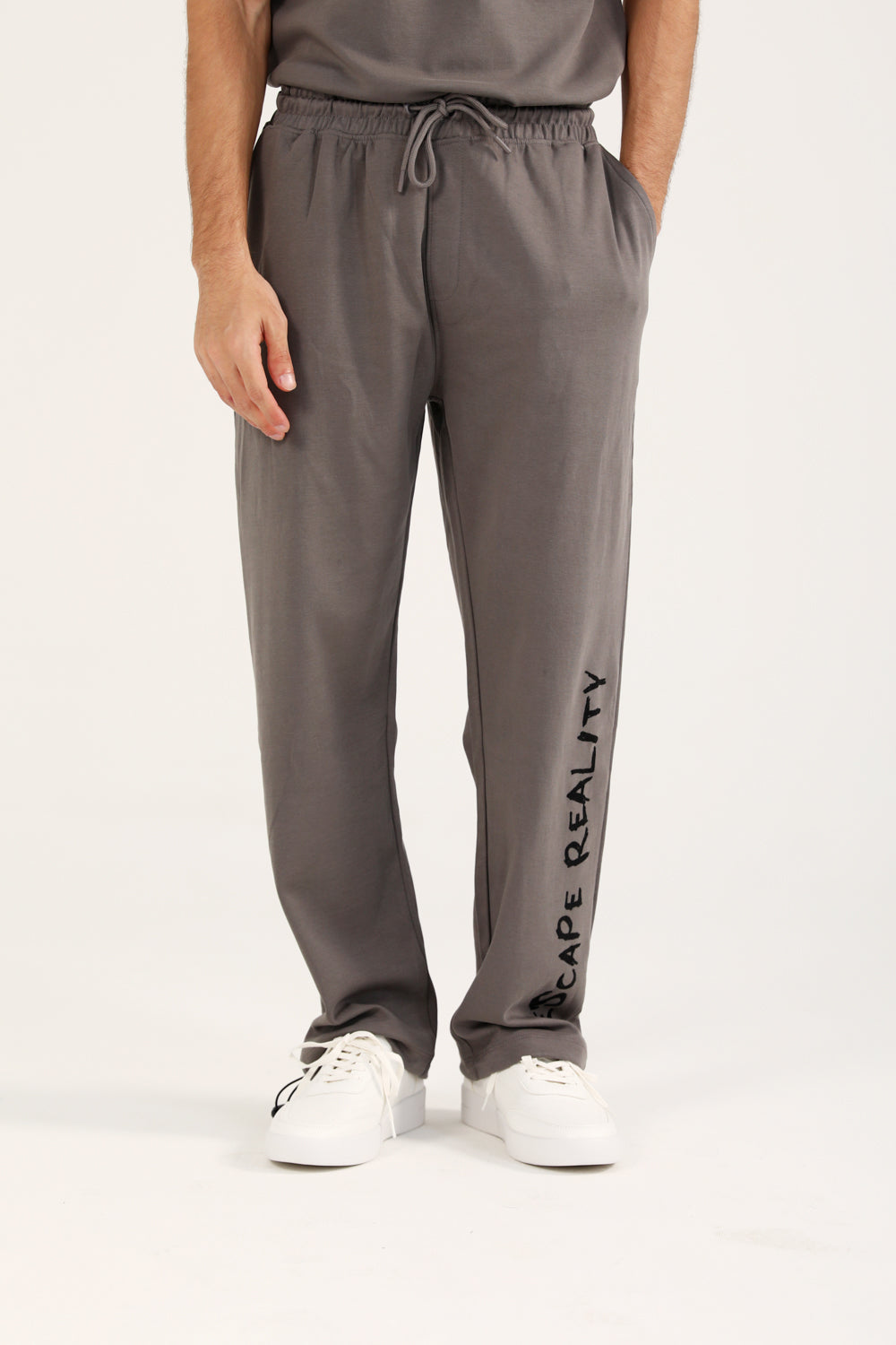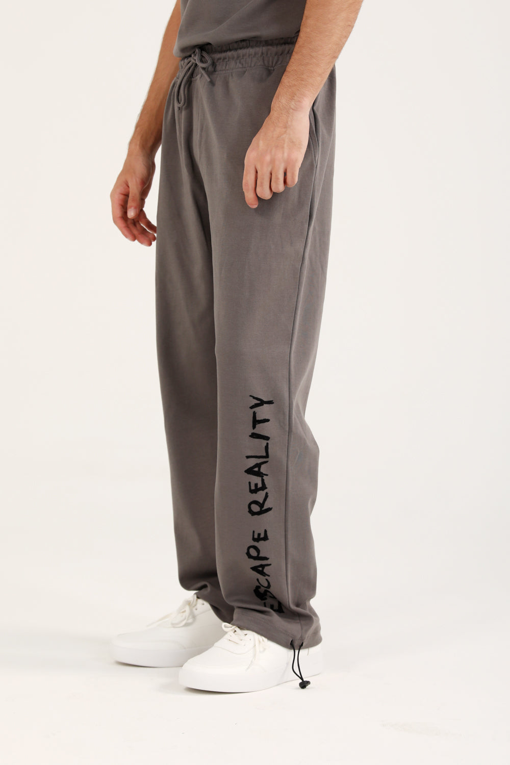 Stone colored knit trousers in soft cotton with an elasticated drawstring waistband and print on the left side.