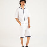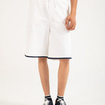 Crisp white cotton shorts with a baggy fit, finished with an elasticated drawstring waist and contrasting trim along the hems.