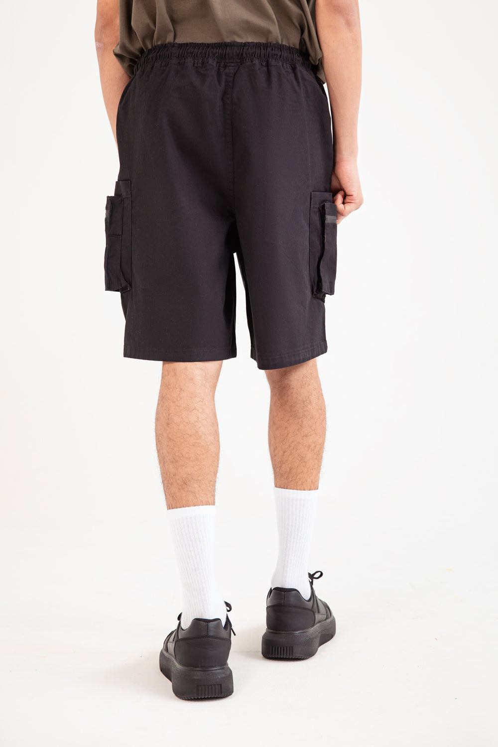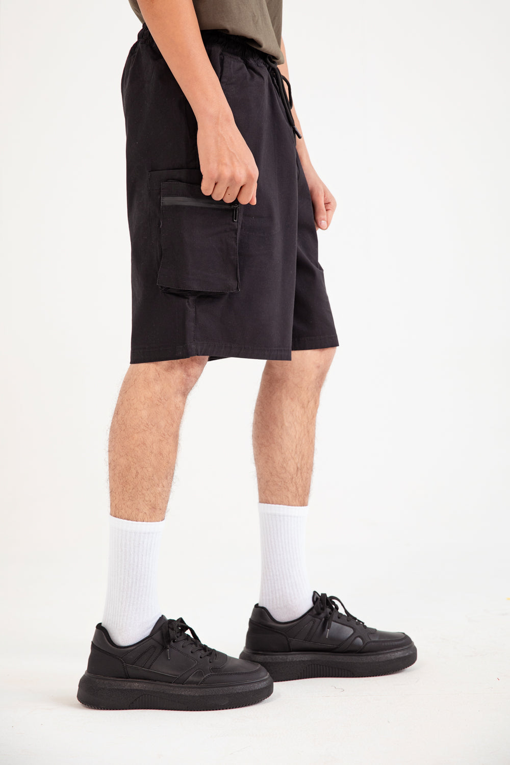 Baggy fit cargo shorts in black with a cotton blend finish and roomy cargo pockets with zippers.