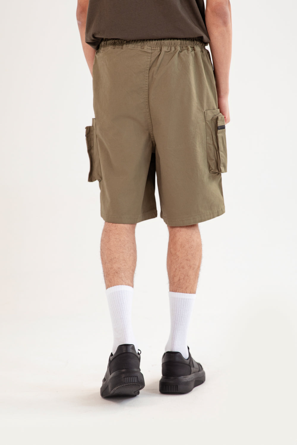 Baggy fit cargo shorts in olive with a cotton blend finish and roomy cargo pockets with zippers.