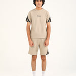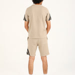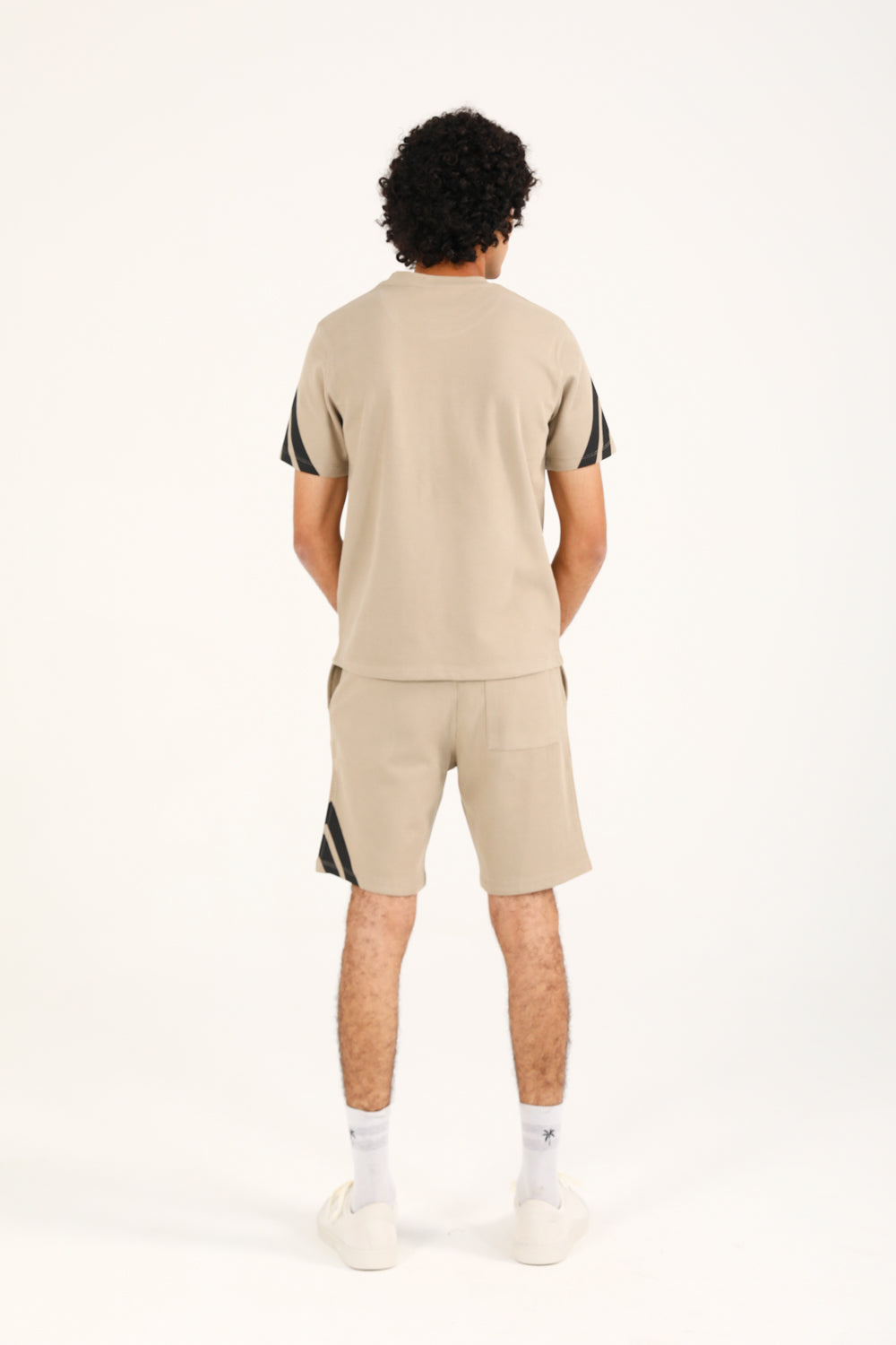 Sand toned knitted shorts in cotton with a drawstring waist and printed stripes near the hem that add an athletic touch.
