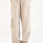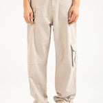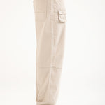 Stone-toned cotton cargos in a relaxed baggy fit, featuring scattered cargo pockets and panel detailing.