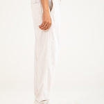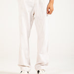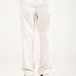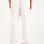 Straight fit off-white cotton trousers with a textured finish, an elasticated drawstring waist, and two back pockets.