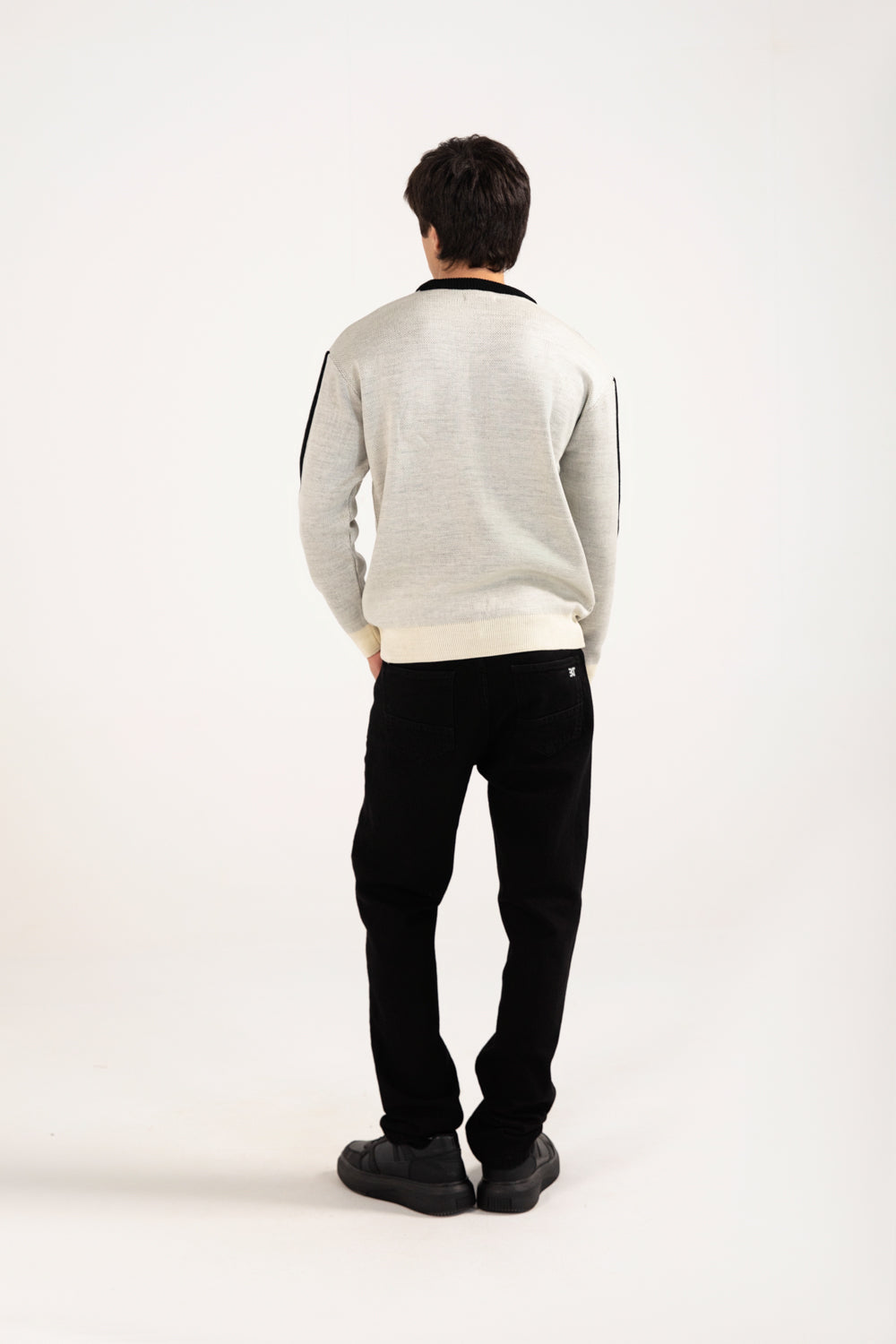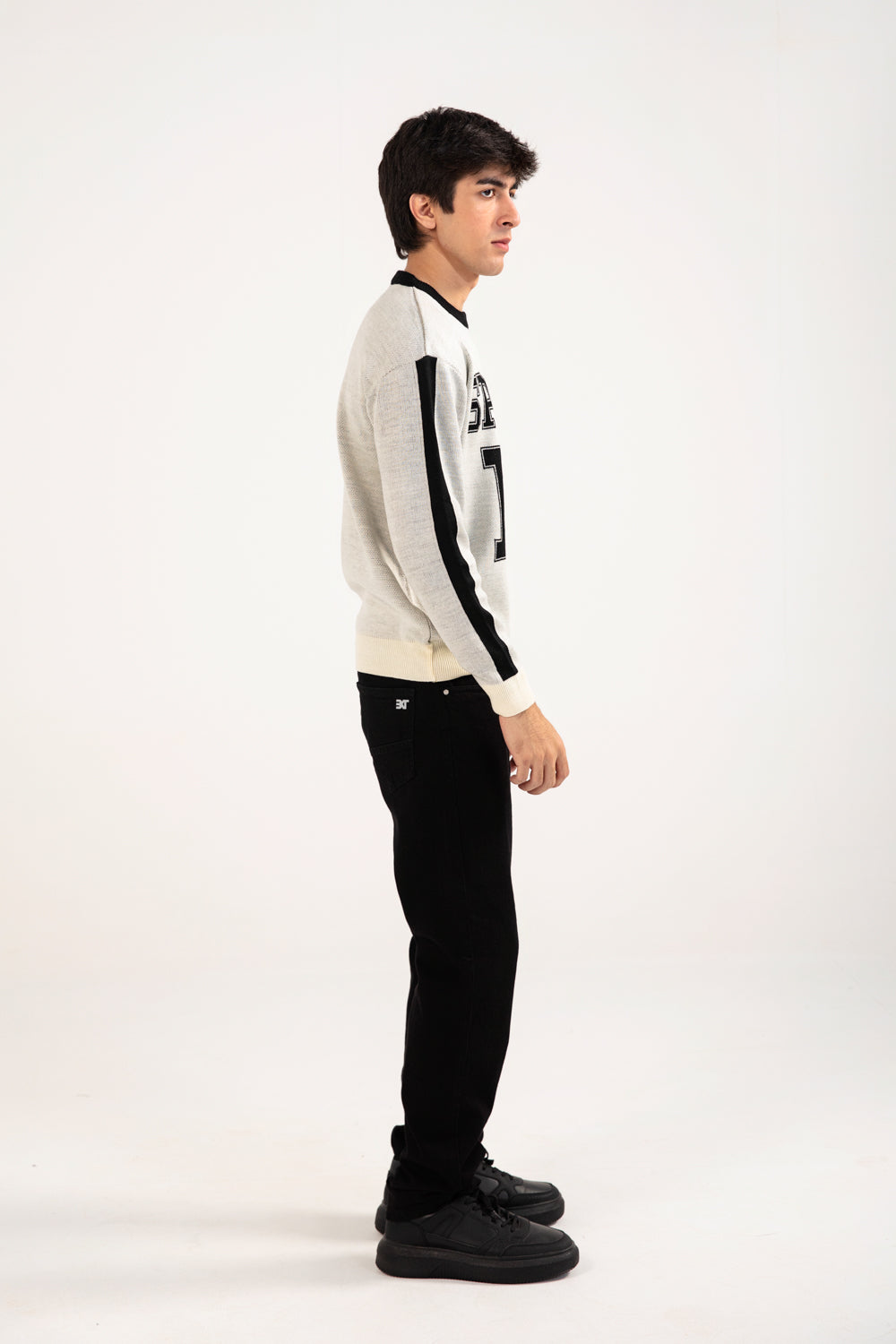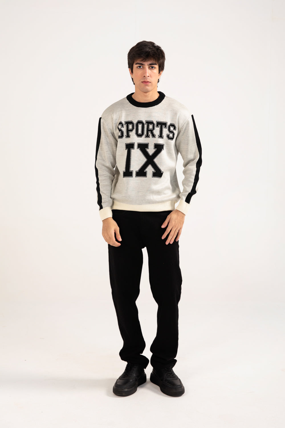 A grey crew neck sweater detailed with contrasting stripes along the sleeves for a sporty finish.