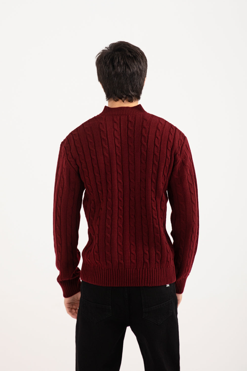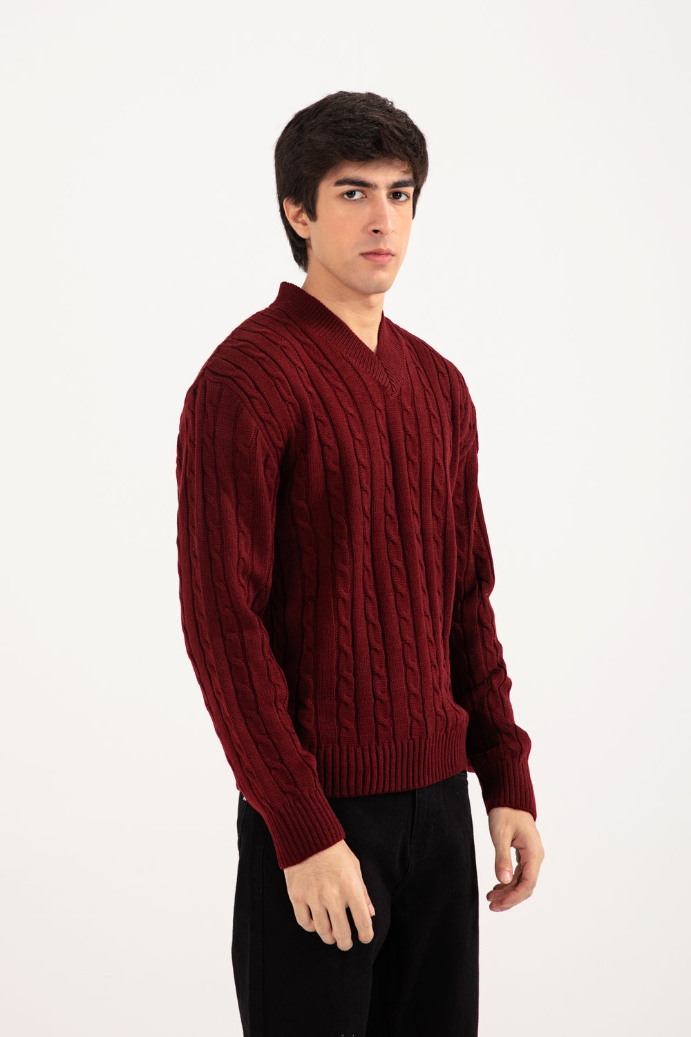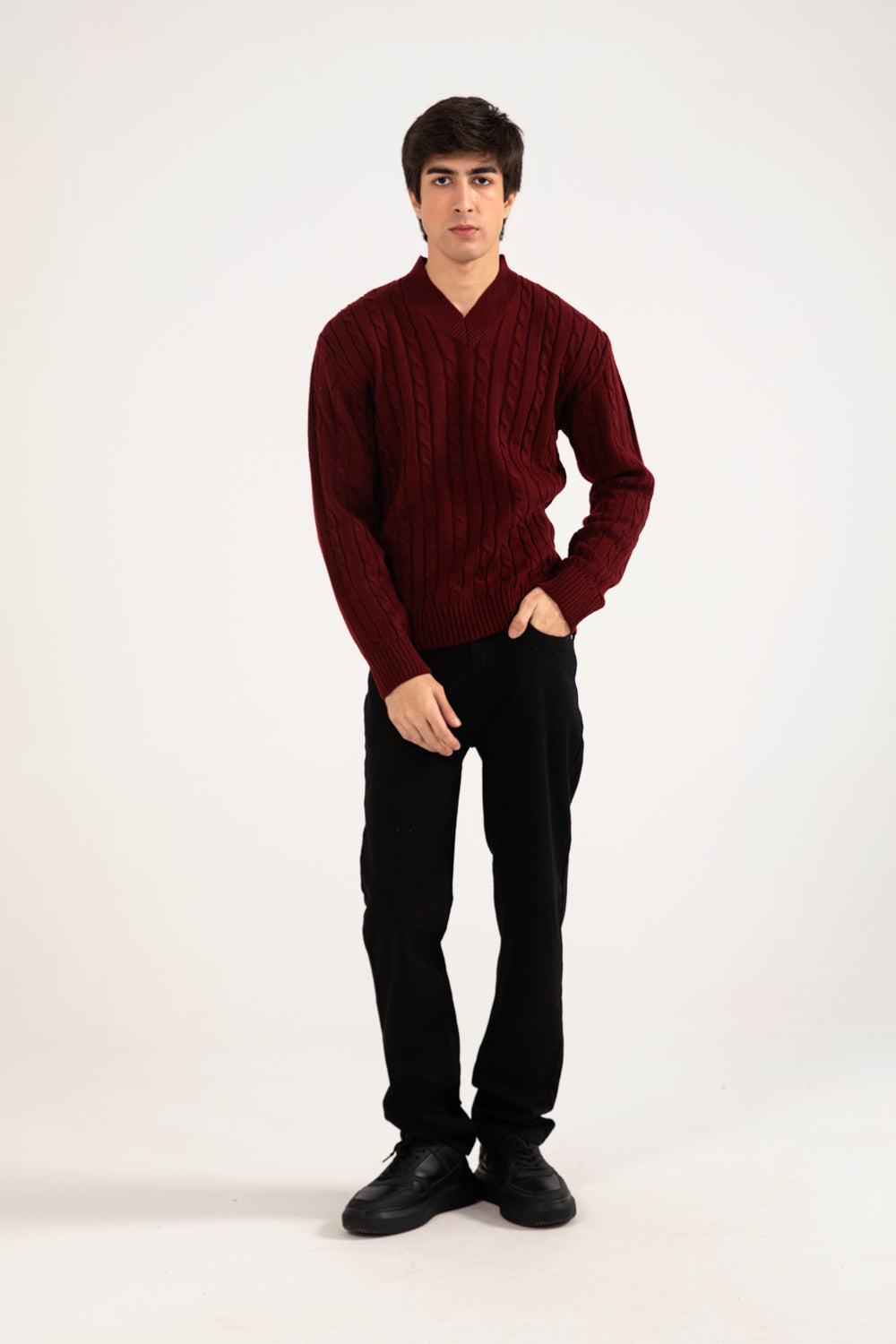 A burgundy relaxed fit cable knit sweater with a V neckline and a textured classic feel.