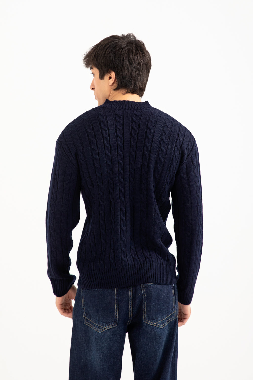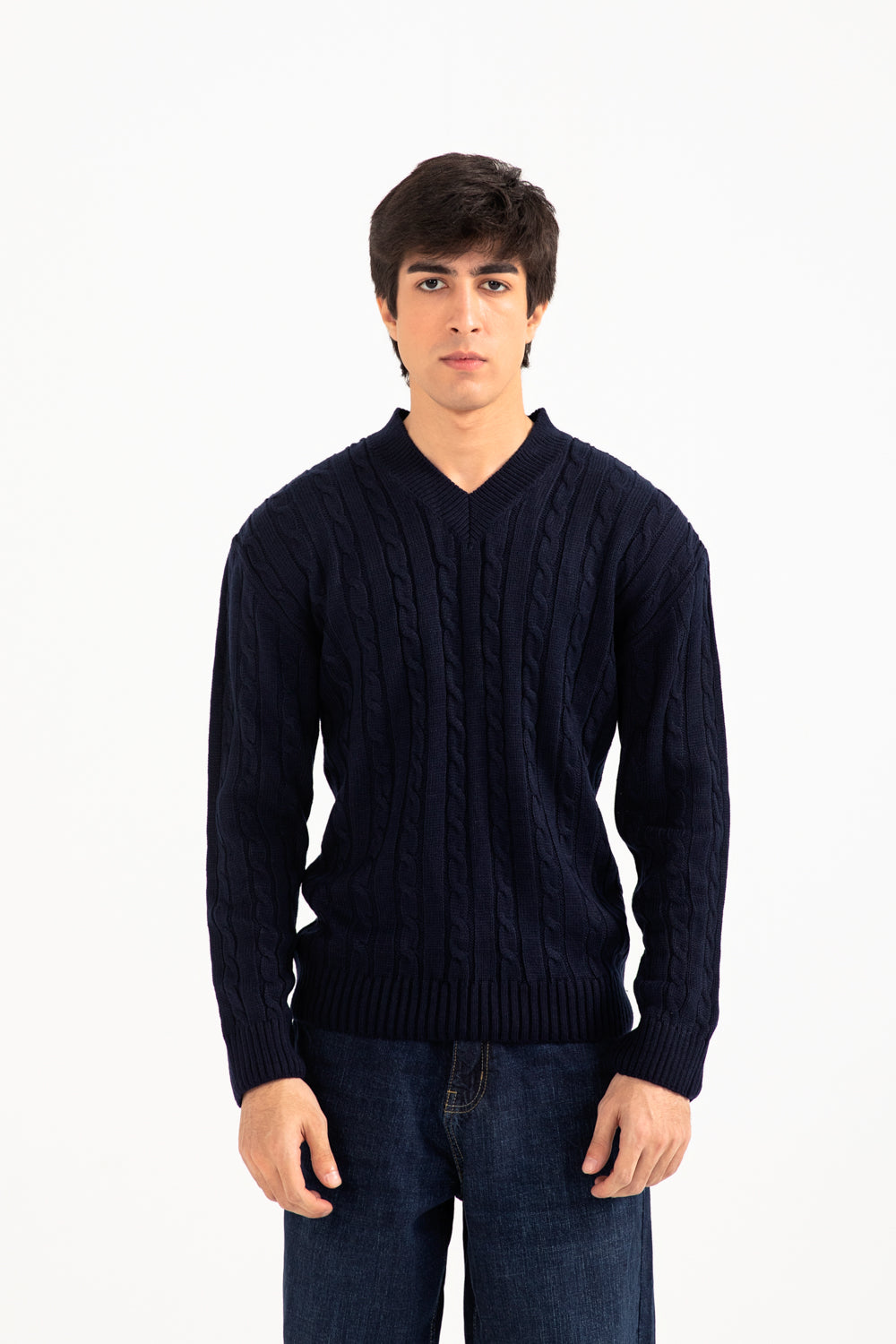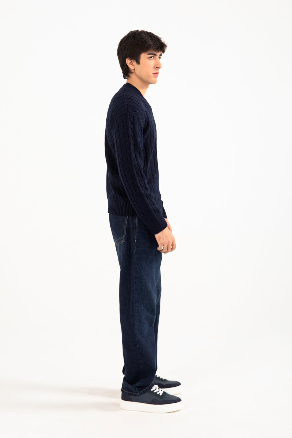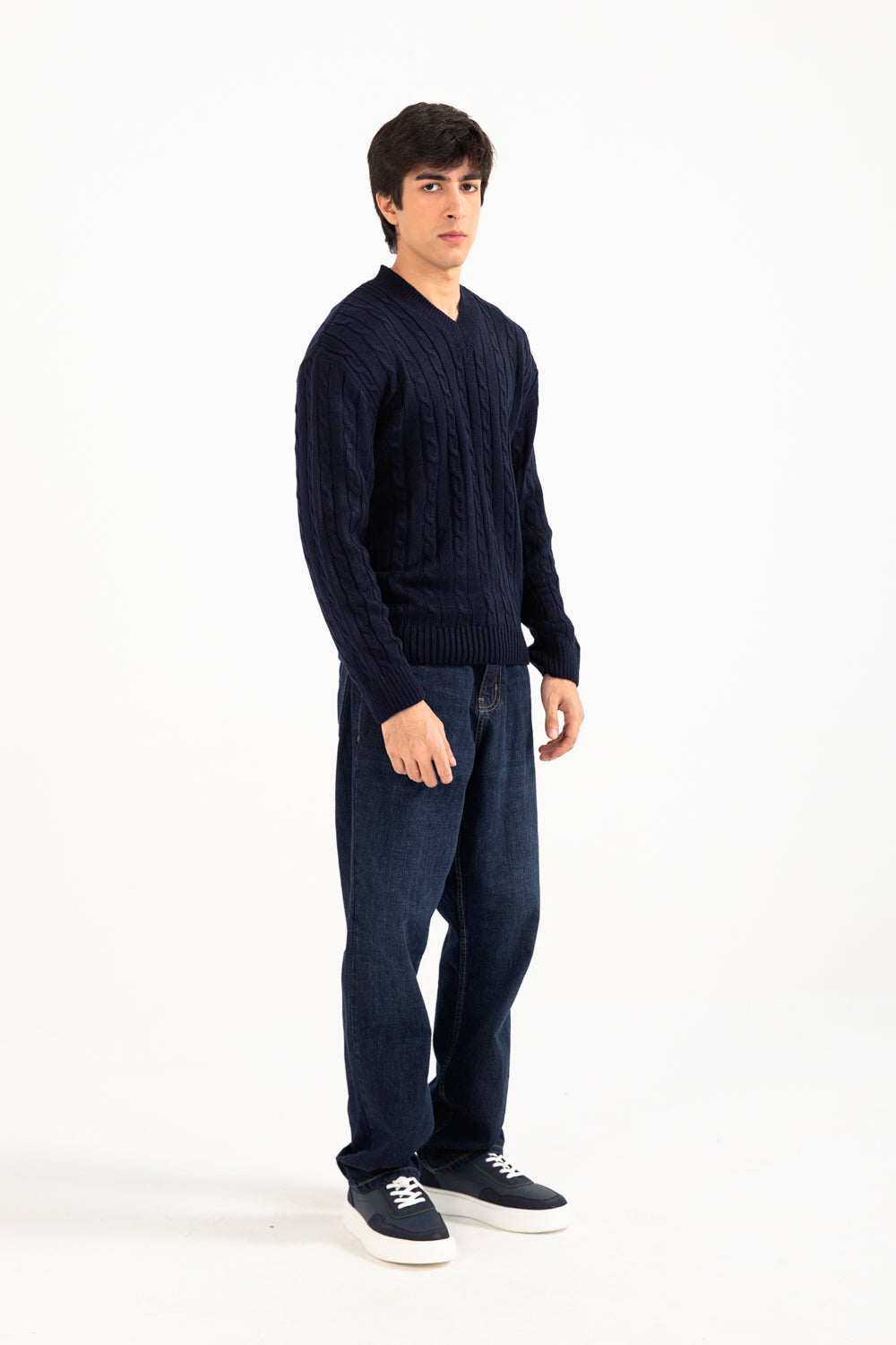 A navy relaxed fit cable knit sweater with a V neckline and a textured classic feel.