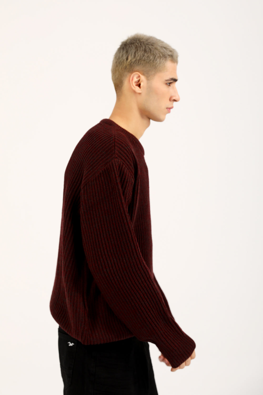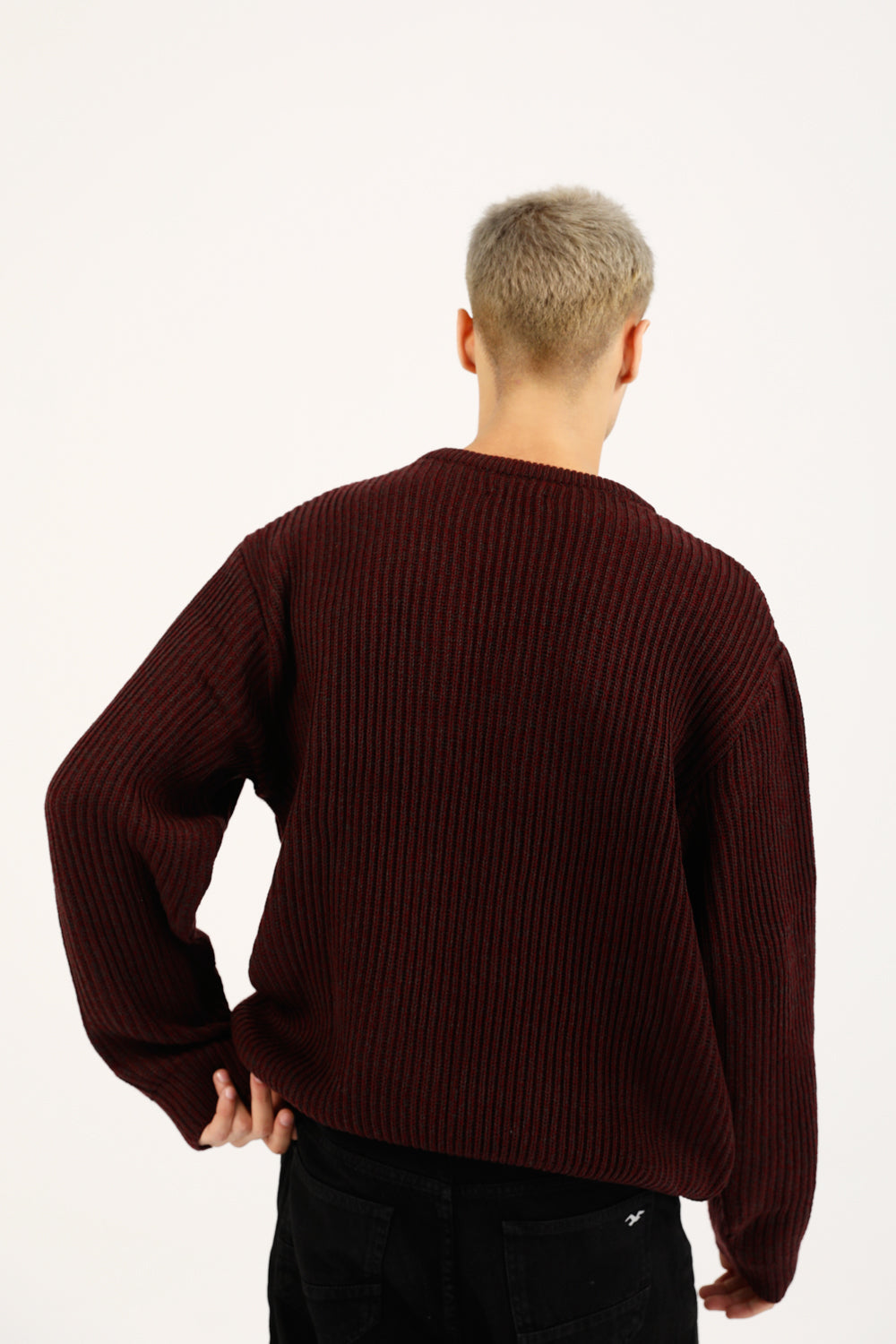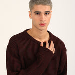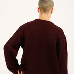 Boxy fit burgundy half cardigan knit sweater with full length oversized sleeves.