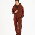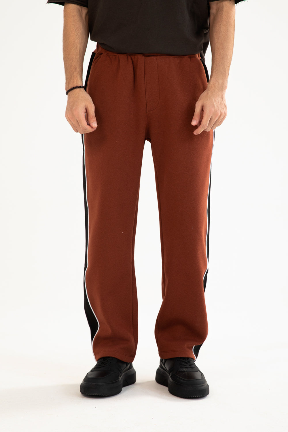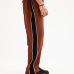 Baggy fit trouser in rust made from a cotton blend with contrasting side strips, an elasticated waistband, and a single back pocket.