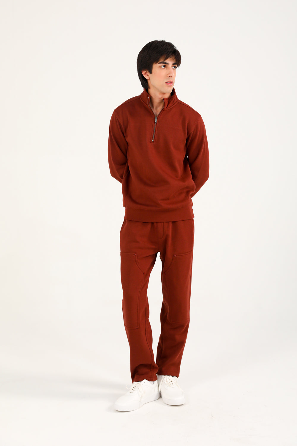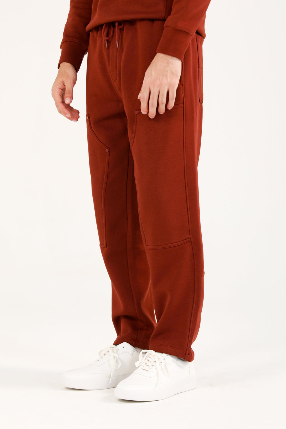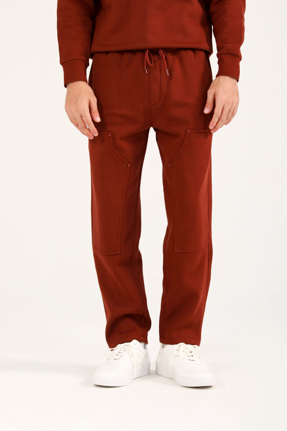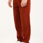 Rust colored knit trousers with a drawstring waist and a clean shape.