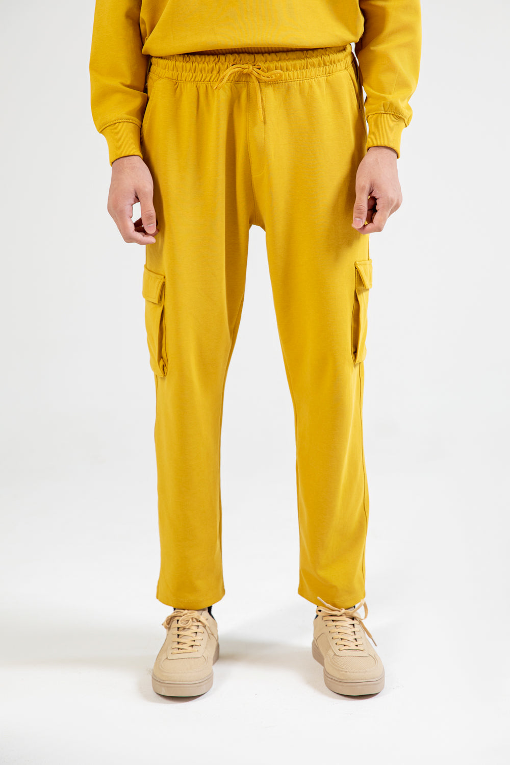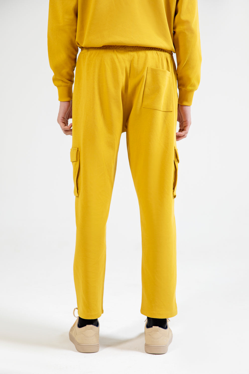 Mustard cotton cargo trousers with a baggy fit, featuring an elasticated drawstring waistband and roomy cargo pockets.