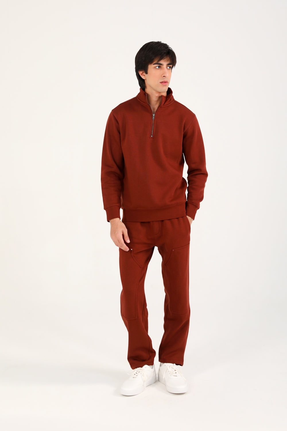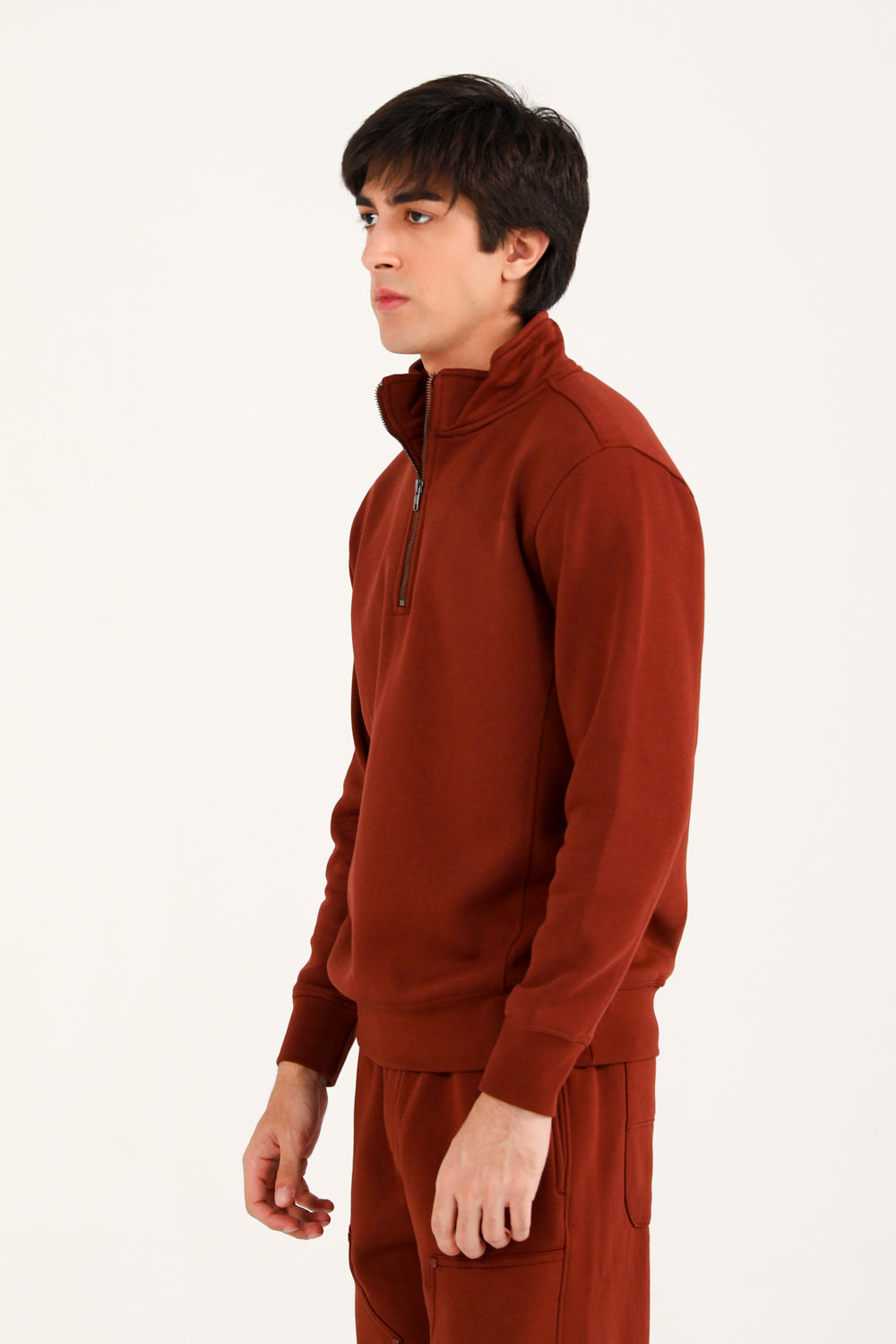 A rust colored mock neck top in a soft cotton blend with a half zip detail.