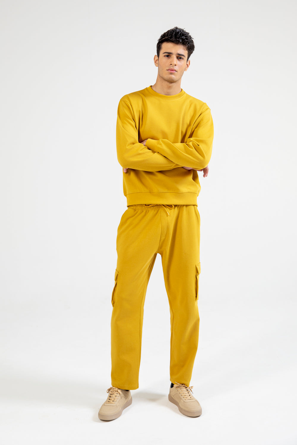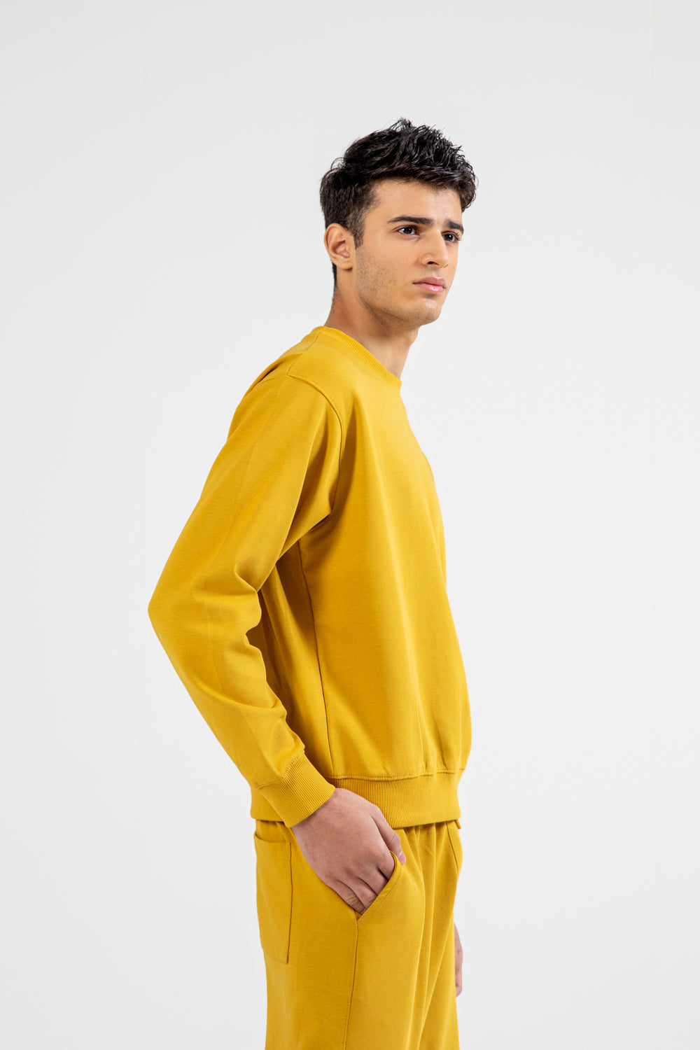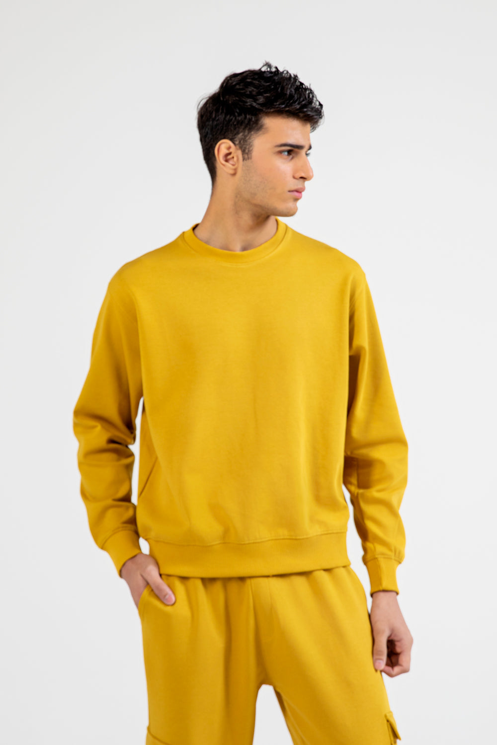 A mustard sweatshirt in cotton with a boxy fit and a clean, plain design.