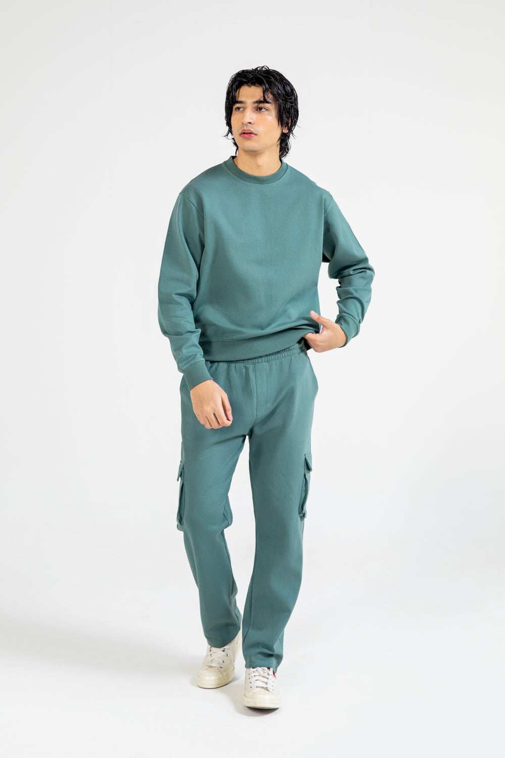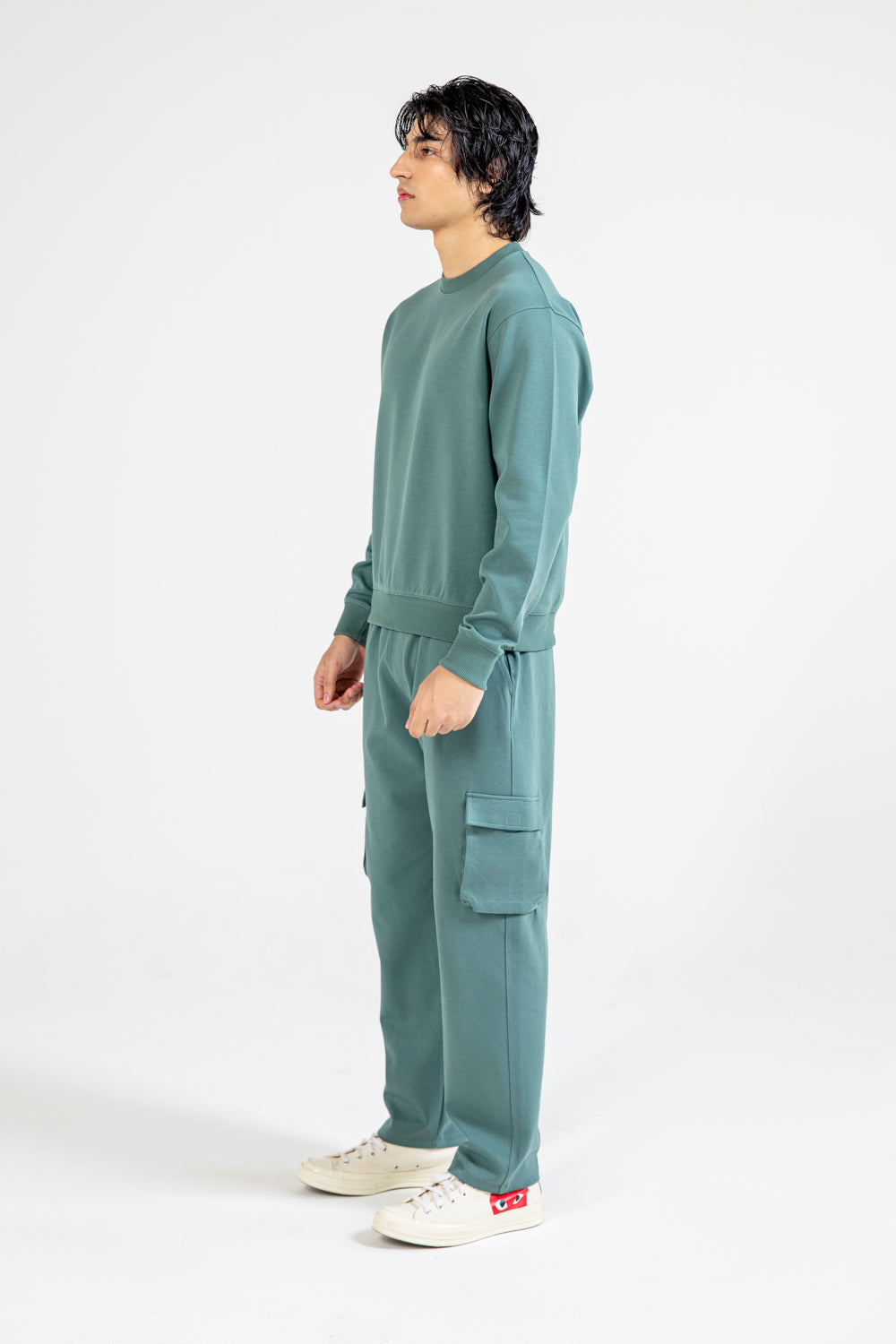 A teal green sweatshirt in cotton with a boxy fit and a clean, plain design.