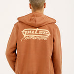 Camel colored zip-up hoodie featuring a regular fit, zipper closure, large graphic on the back, and a smaller one on the front.