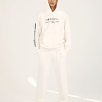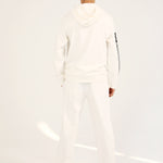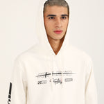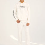 White pullover hoodie with a statement graphic on the front and an additional print running down one sleeve.