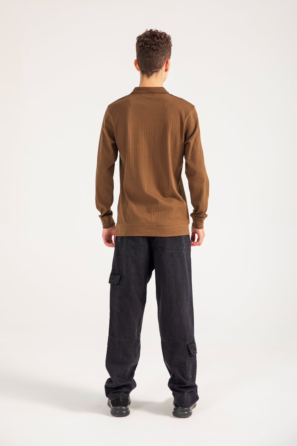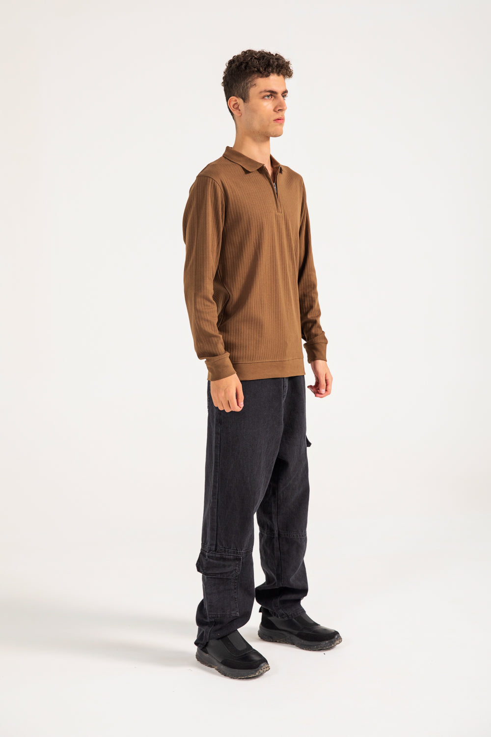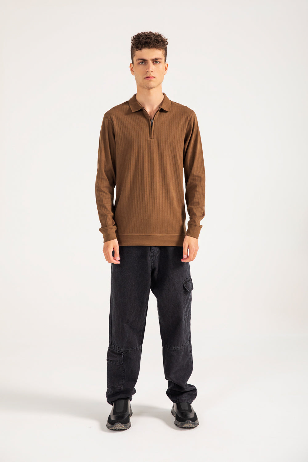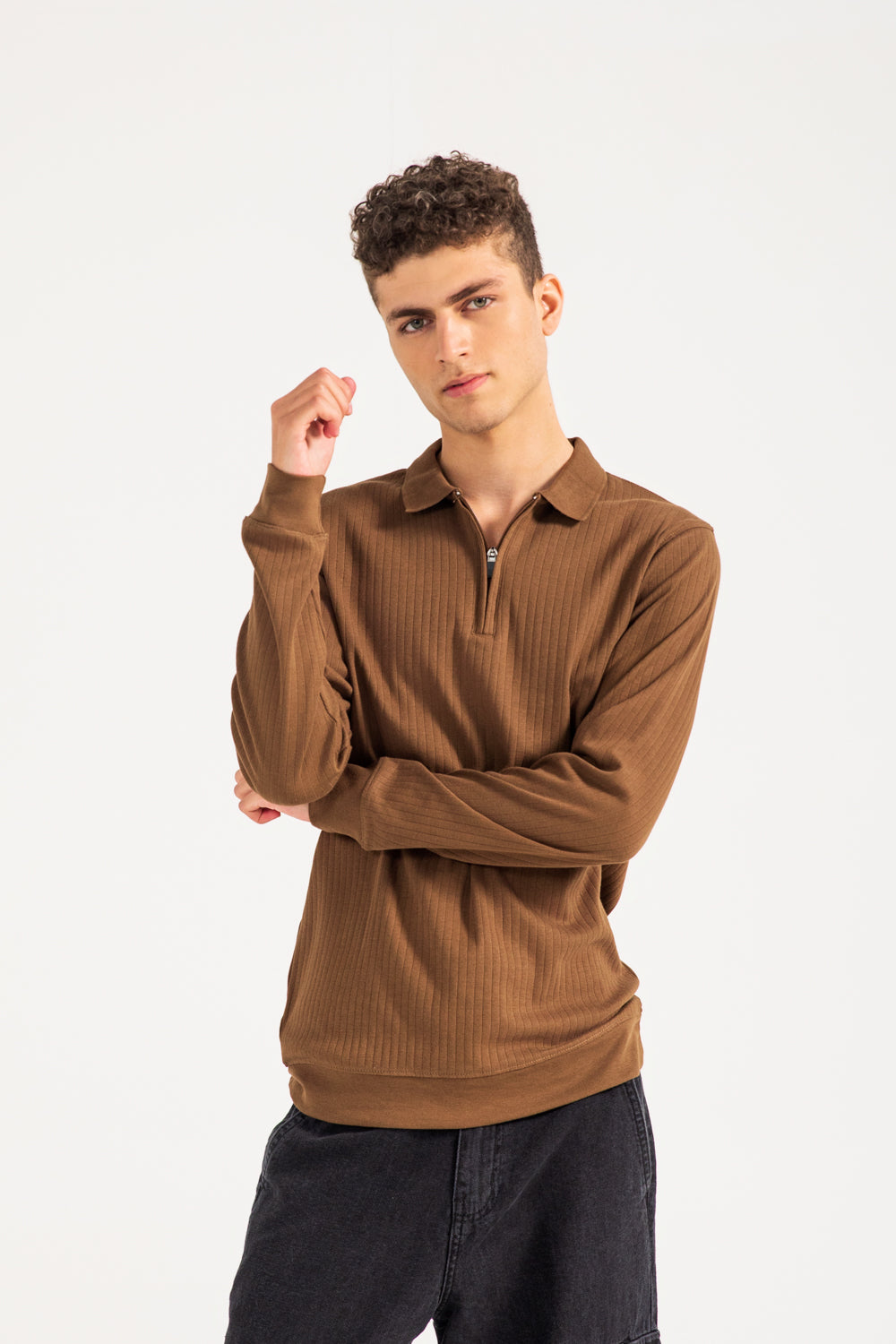 Textured polo in a breathable cotton synthetic summer blend featuring a zip-up front and full length sleeves.