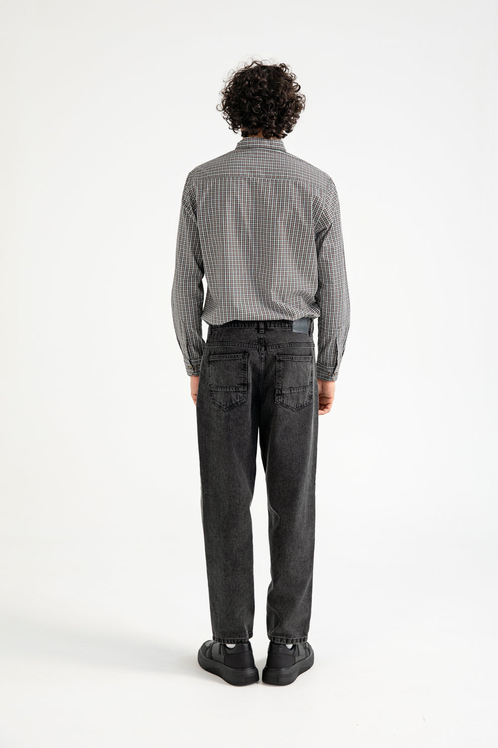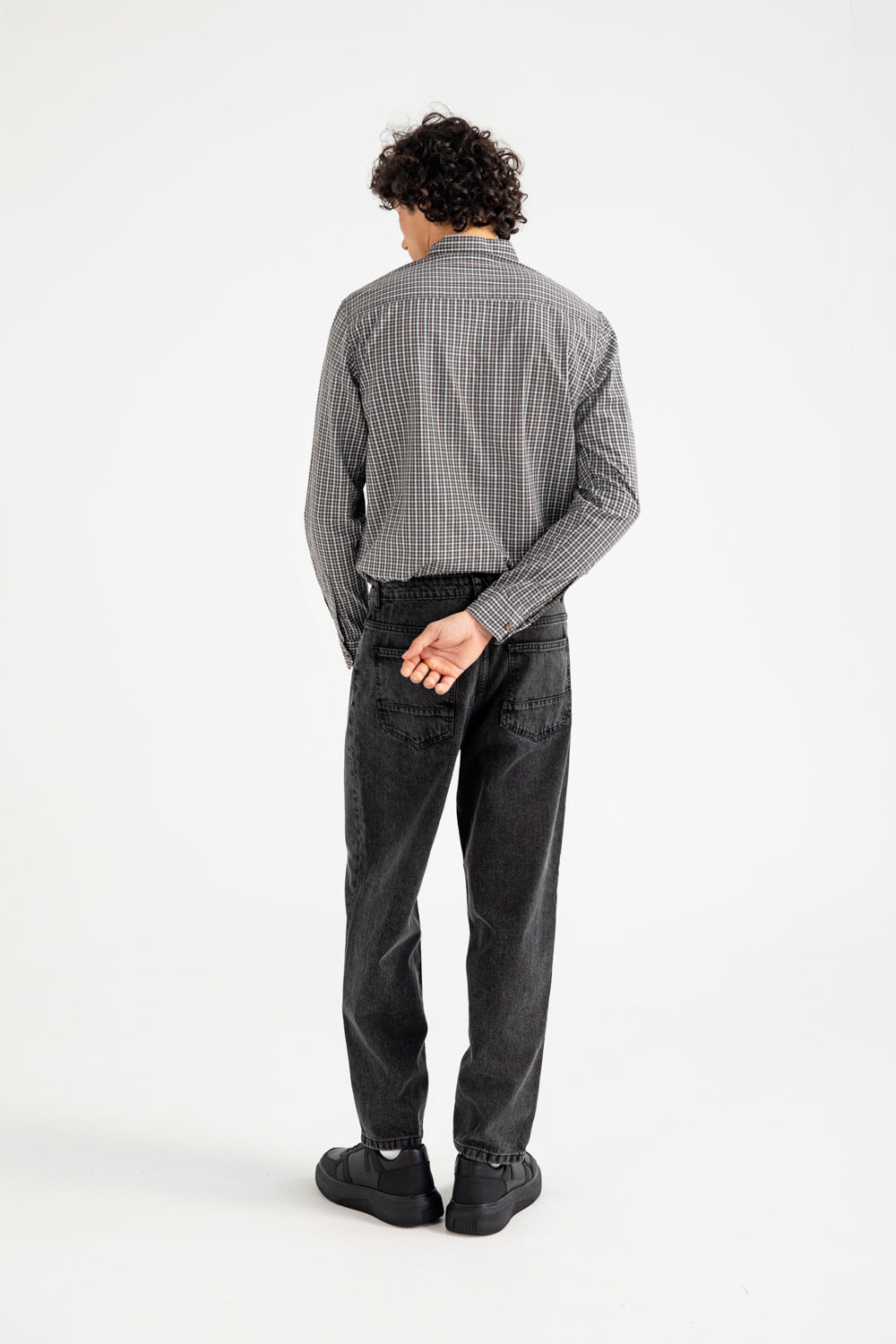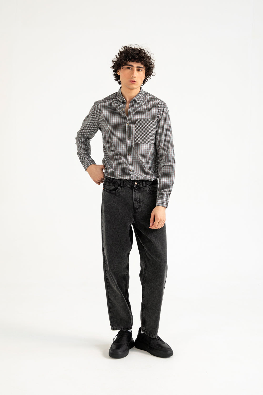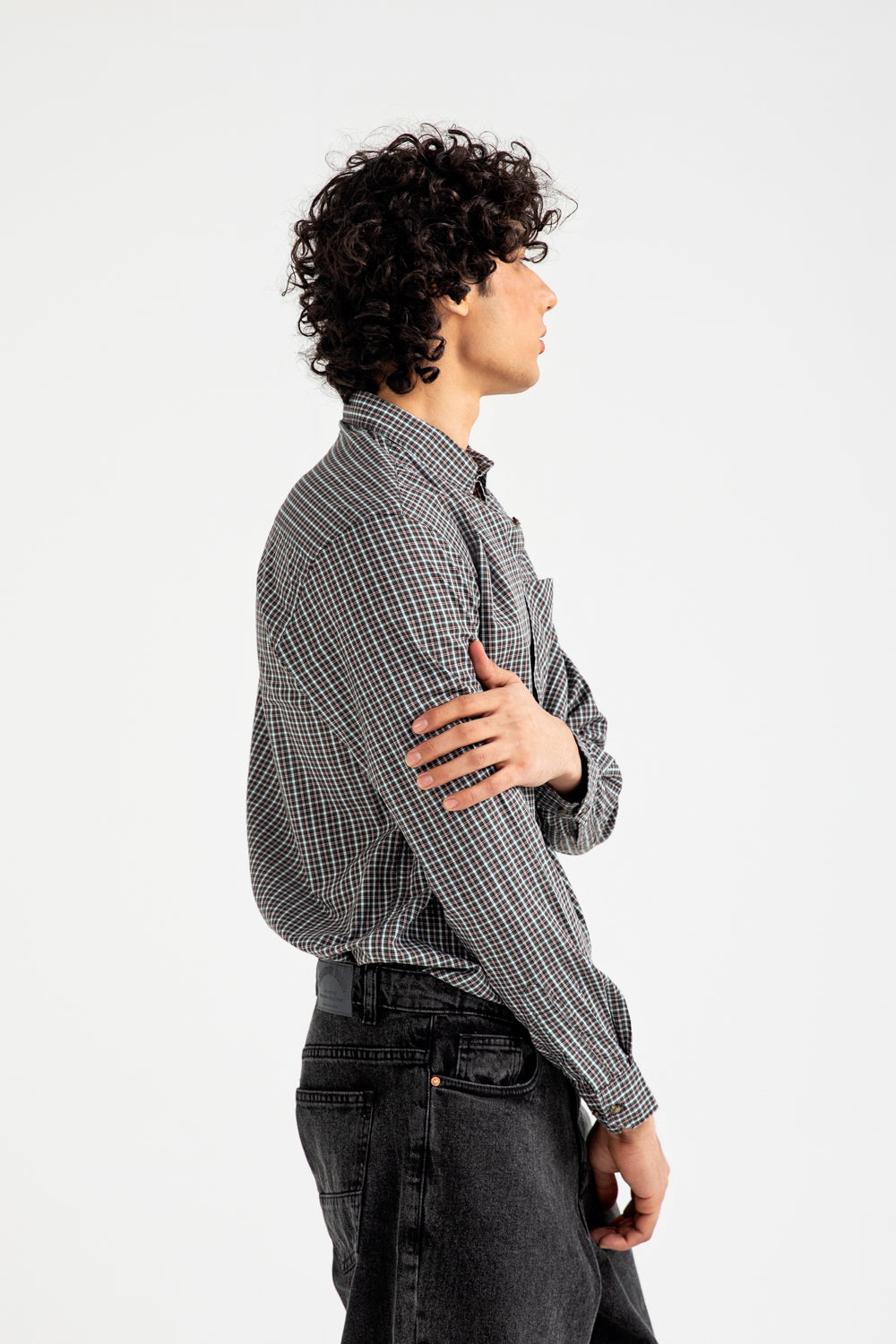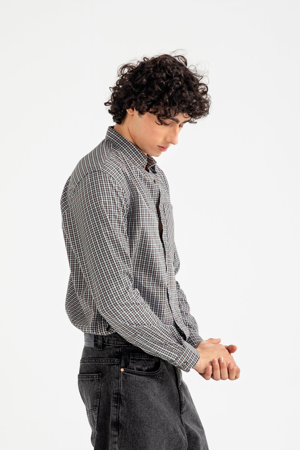 Brown cotton shirt with a checkered pattern, finished with brown buttons and a left chest pocket.