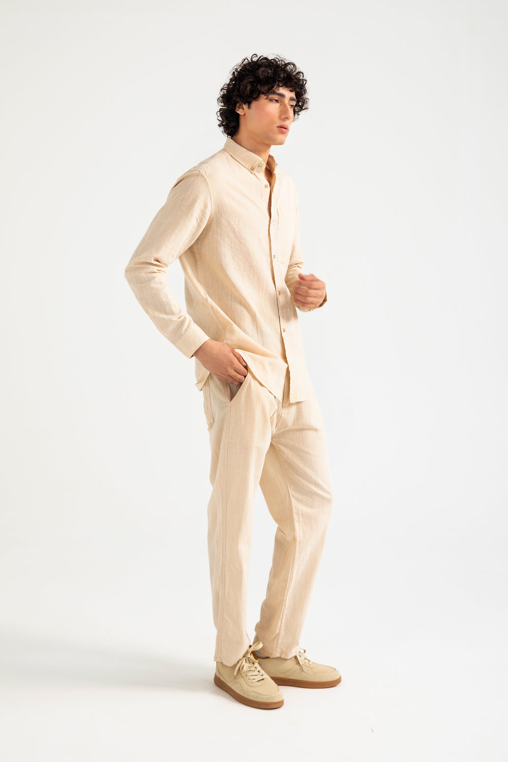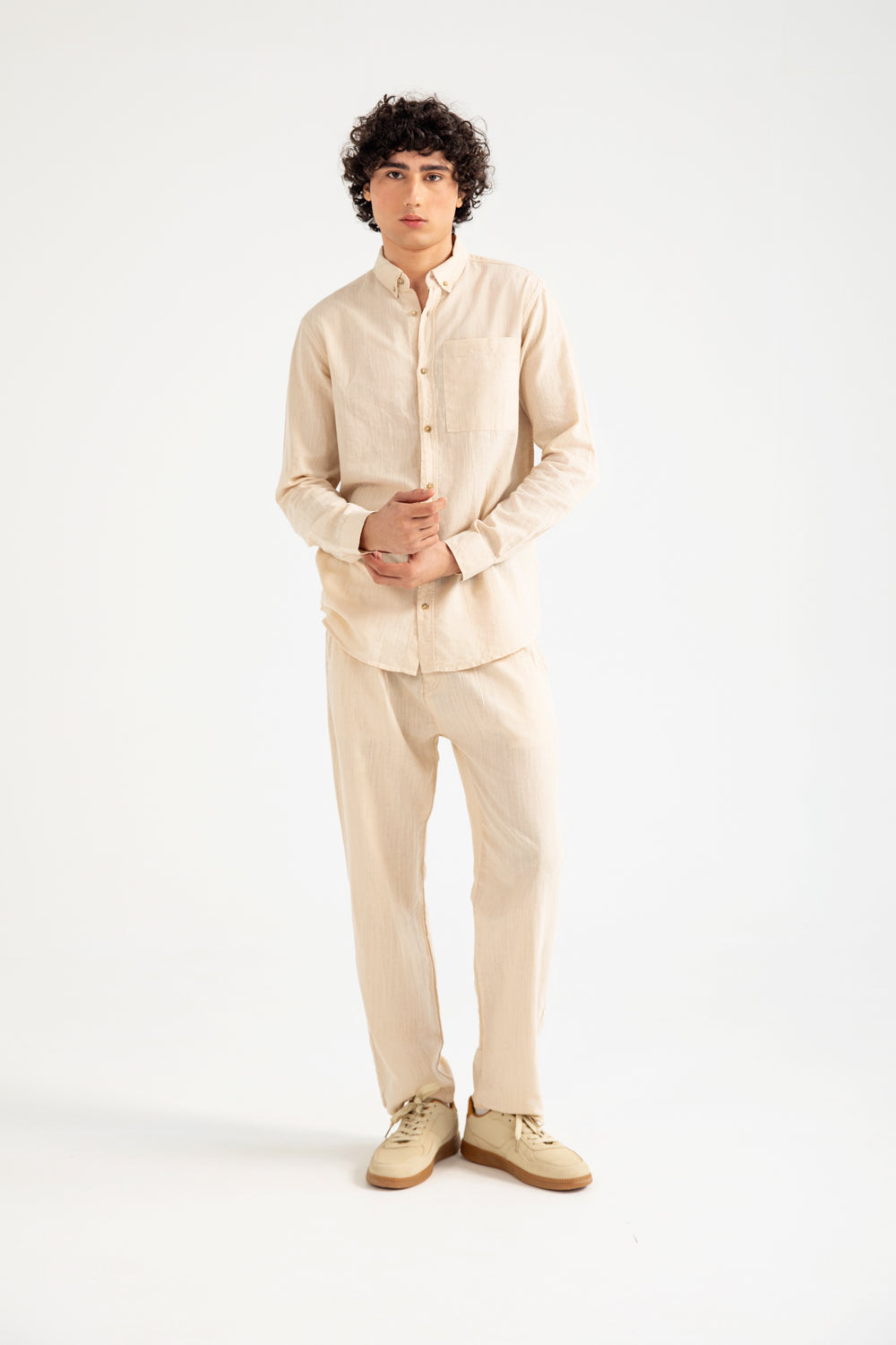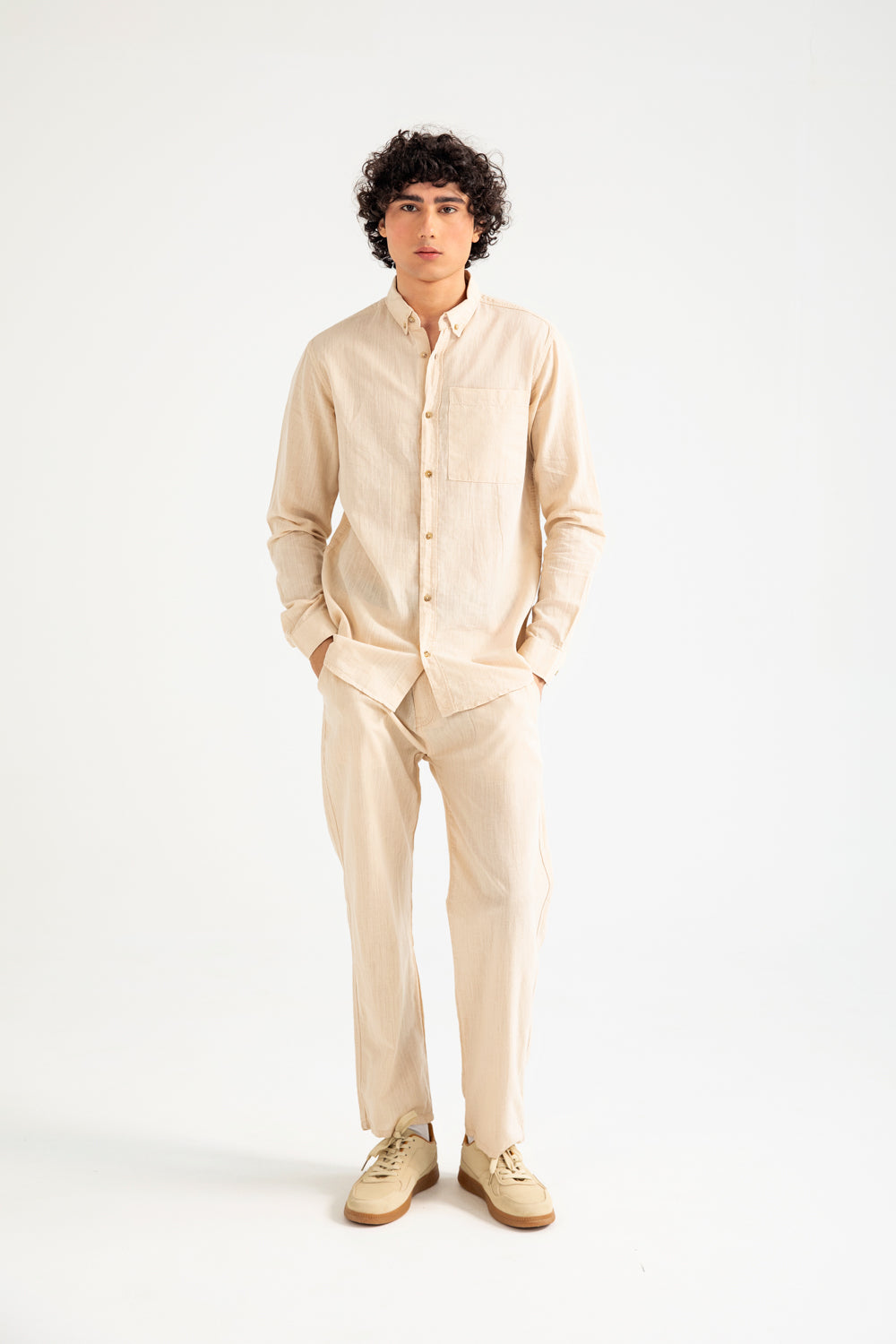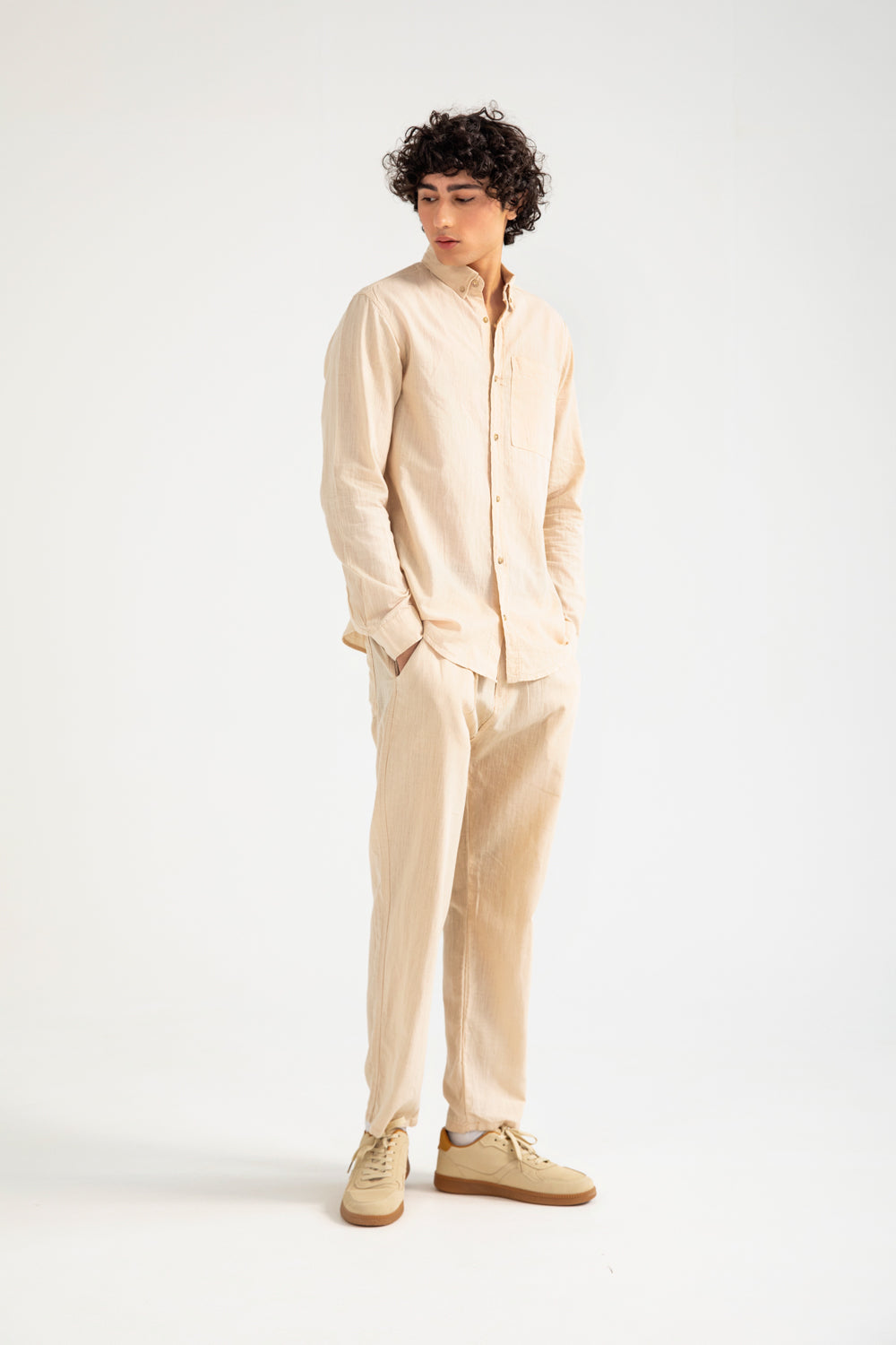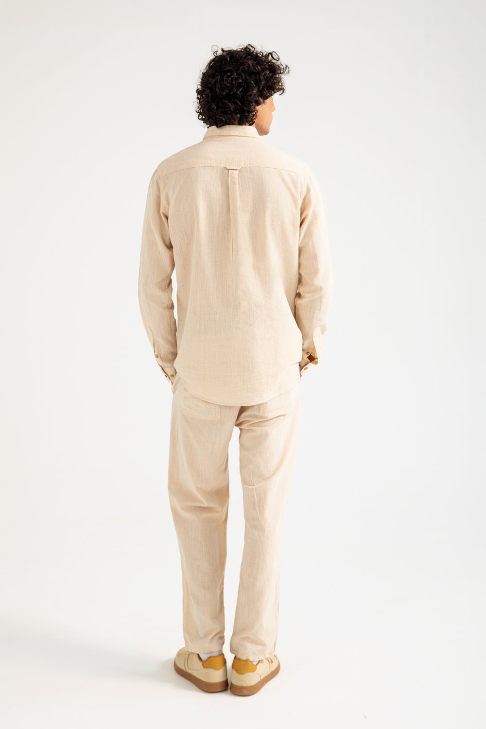 Beige shirt in a cotton linen blend, detailed with light brown buttons, full length sleeves, and a left chest pocket.