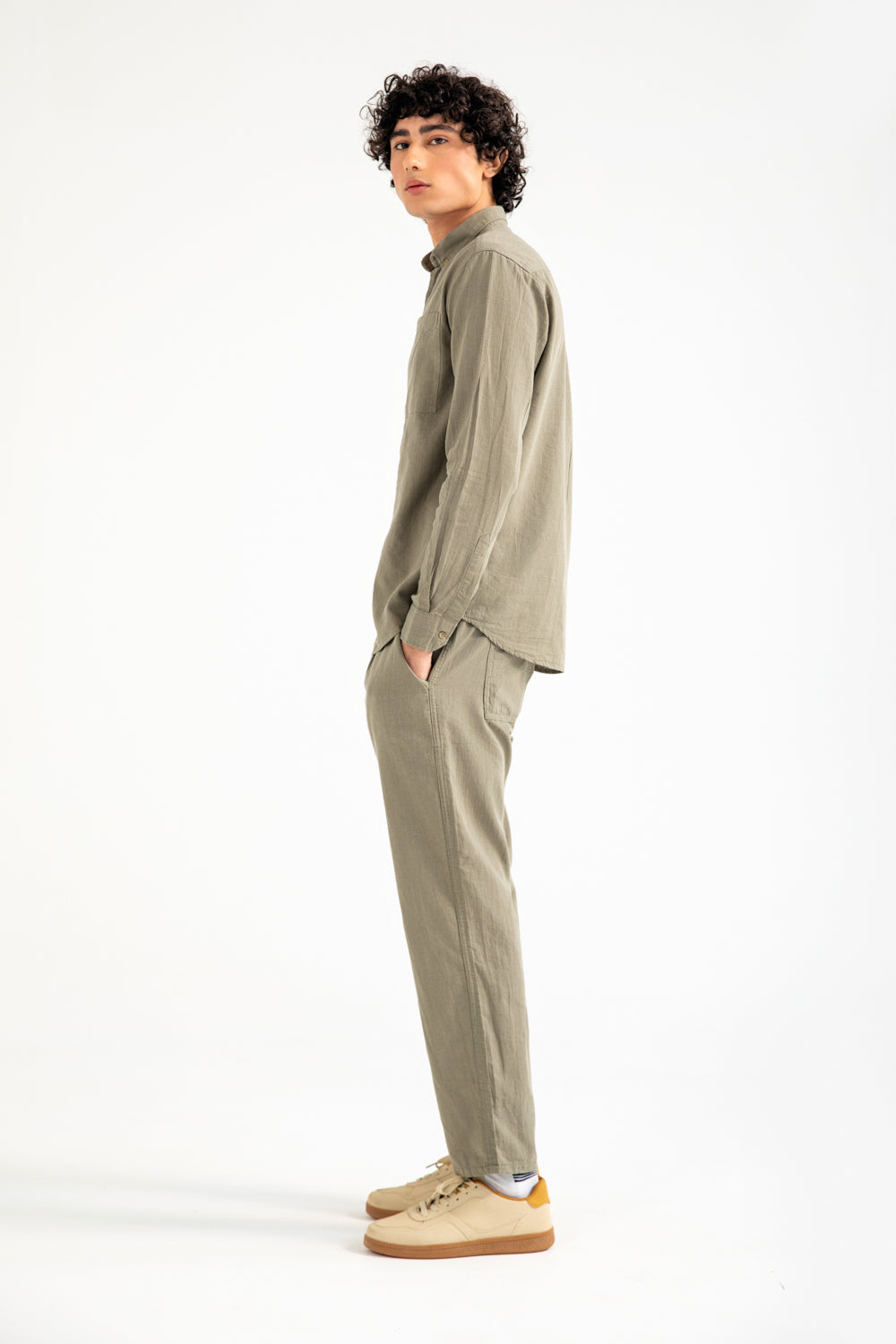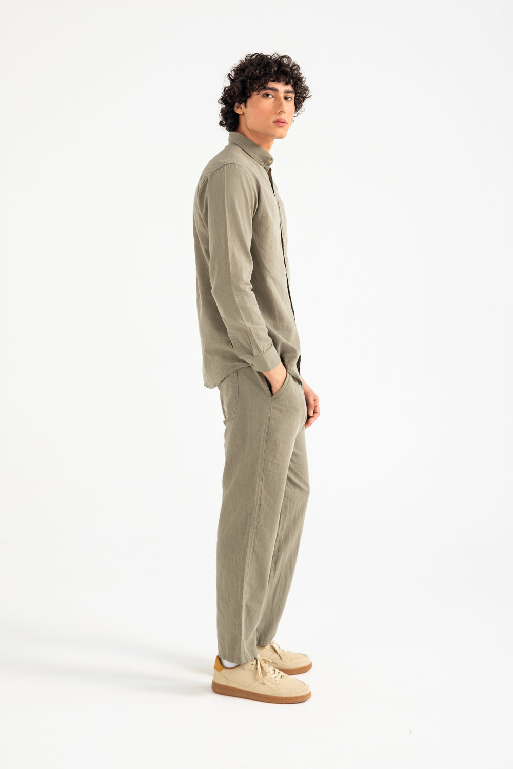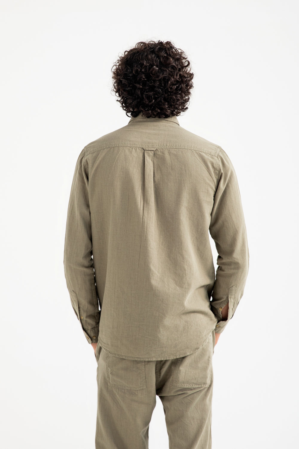 Stone colored shirt in a cotton linen blend, detailed with light brown buttons, full length sleeves, and a left chest pocket.