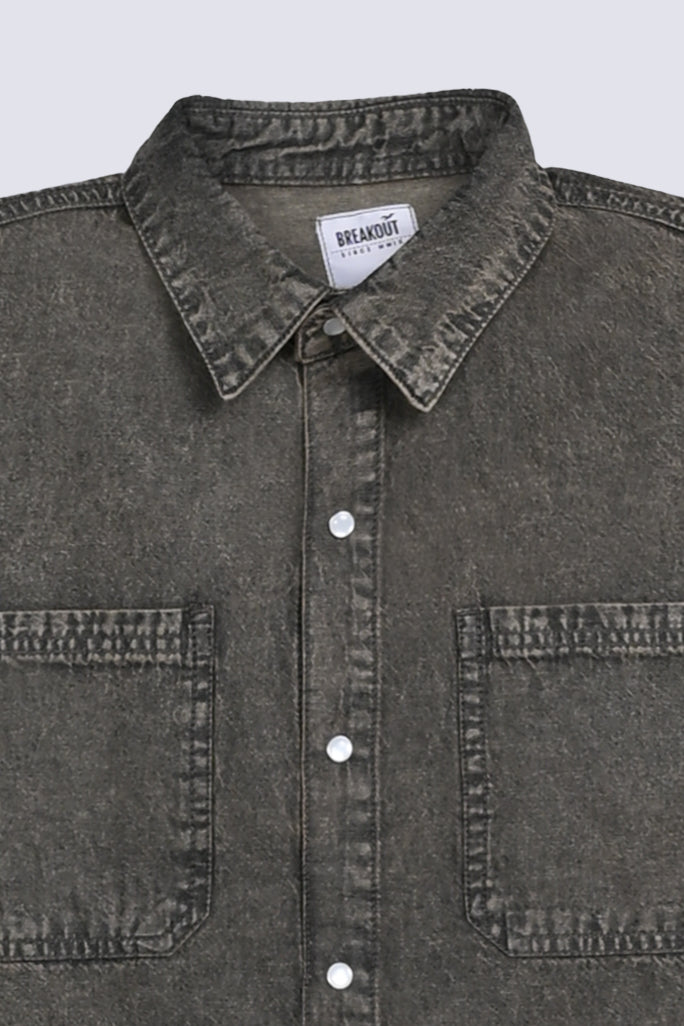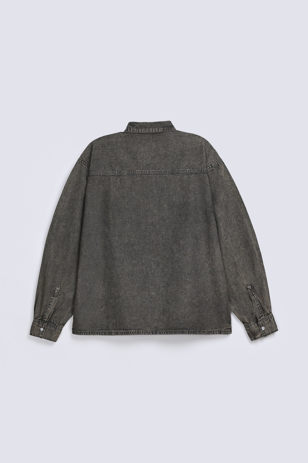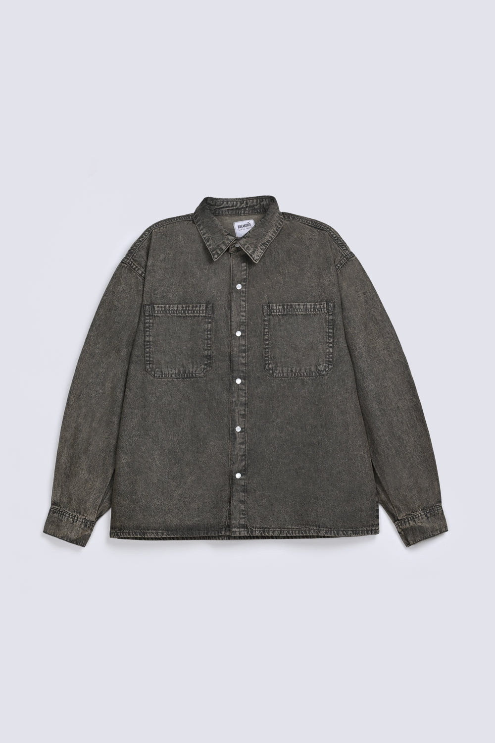 Washed brown denim shirt with a boxy fit, finished with white buttons, dual chest pockets, and full-length sleeves.