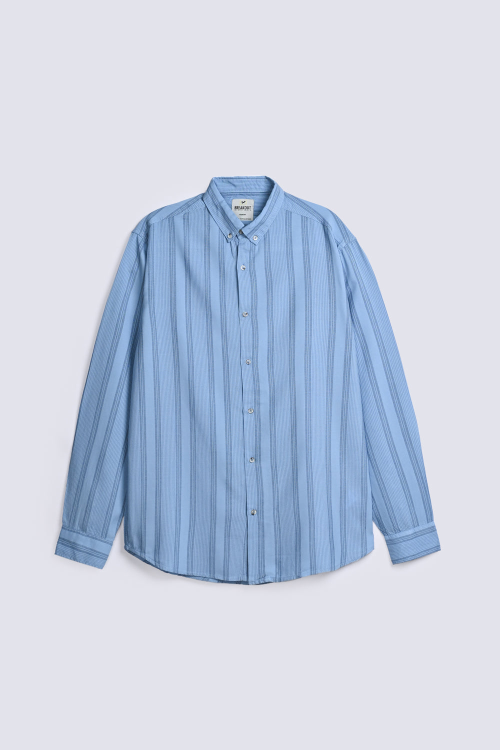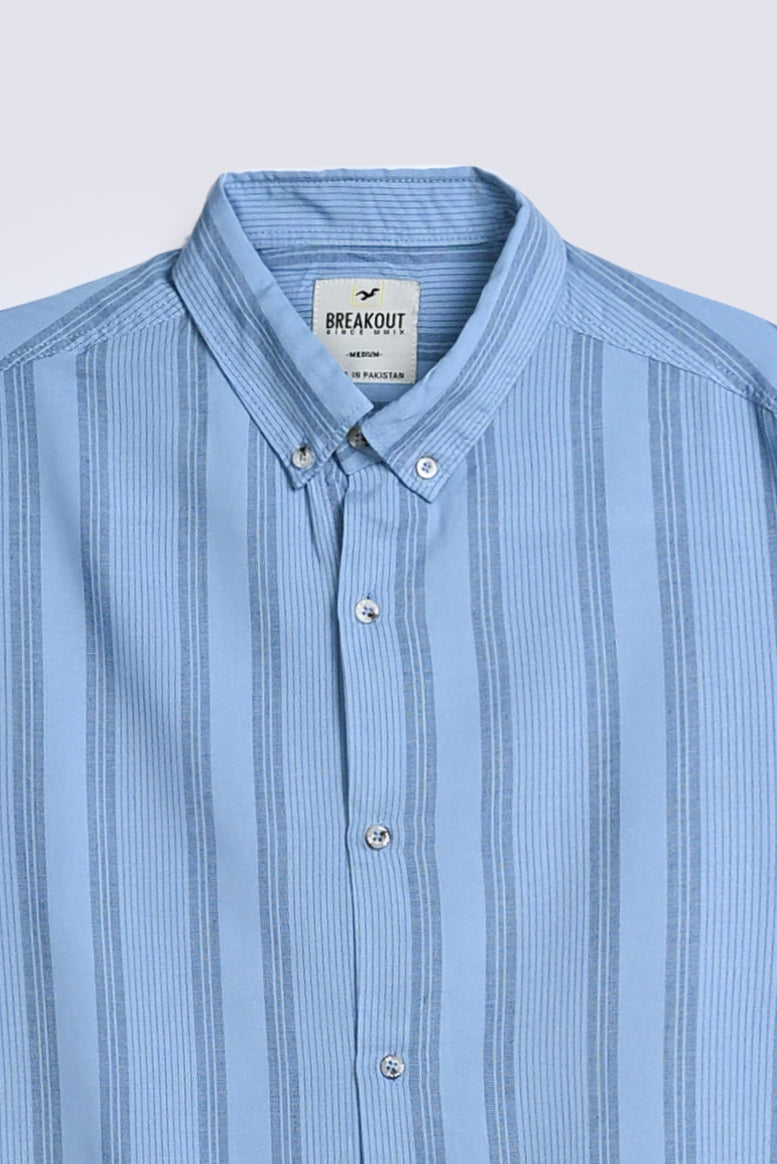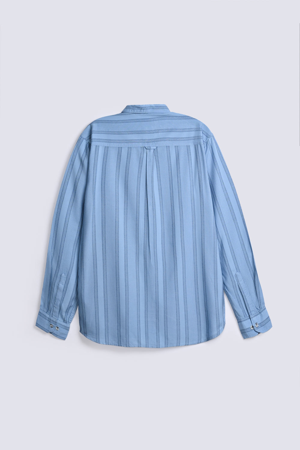 Sky blue viscose shirt with vertical monochrome stripes and a button down front.