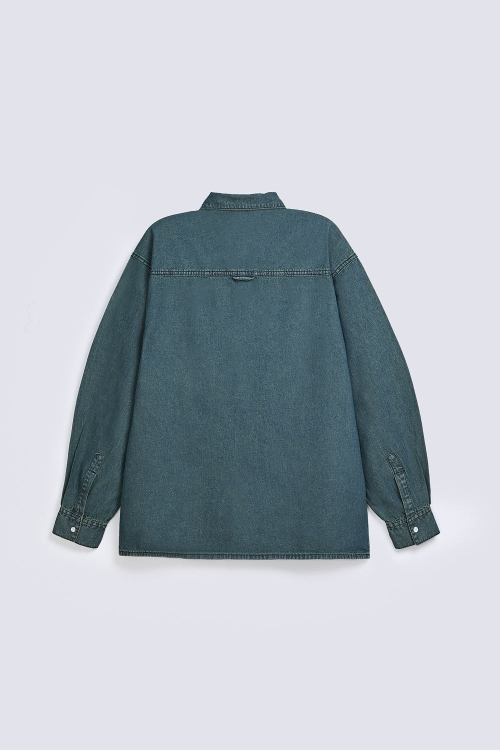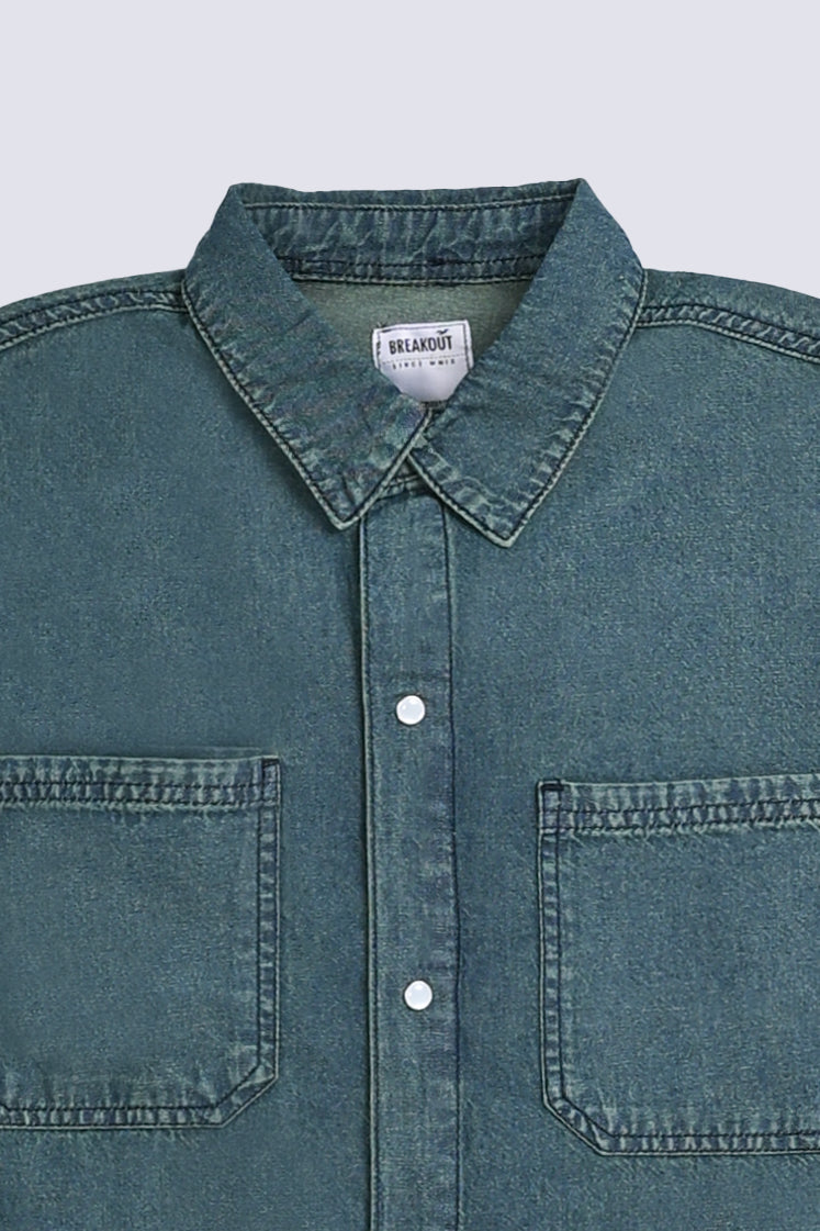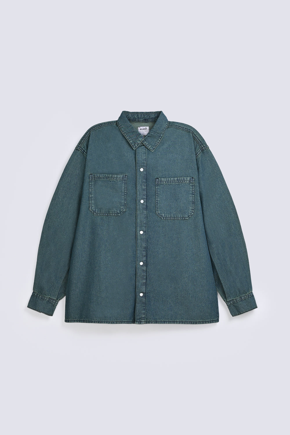 Blue denim shirt with green tint and a boxy fit, finished with white buttons, dual chest pockets, and full-length sleeves.