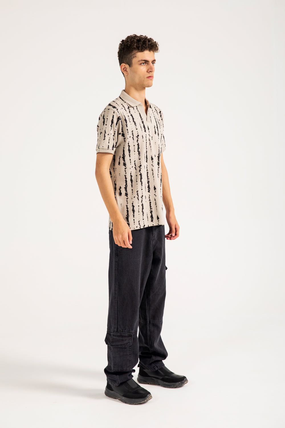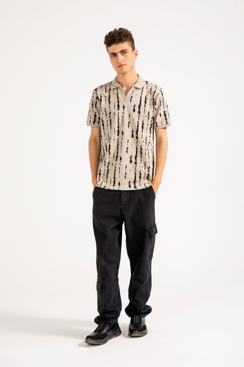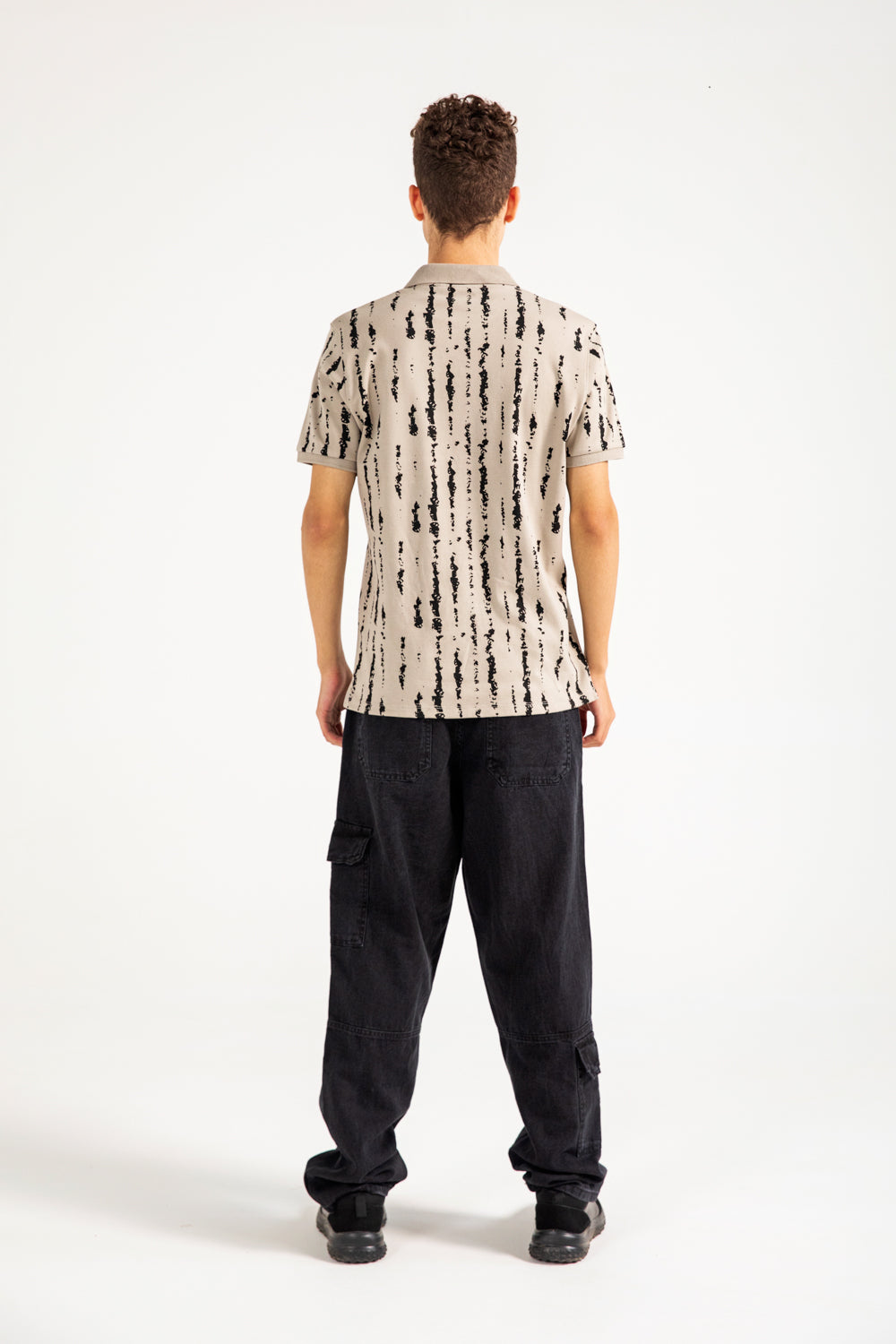 Mouse grey cotton polo with a Johnny collar, featuring an all over abstract black print.