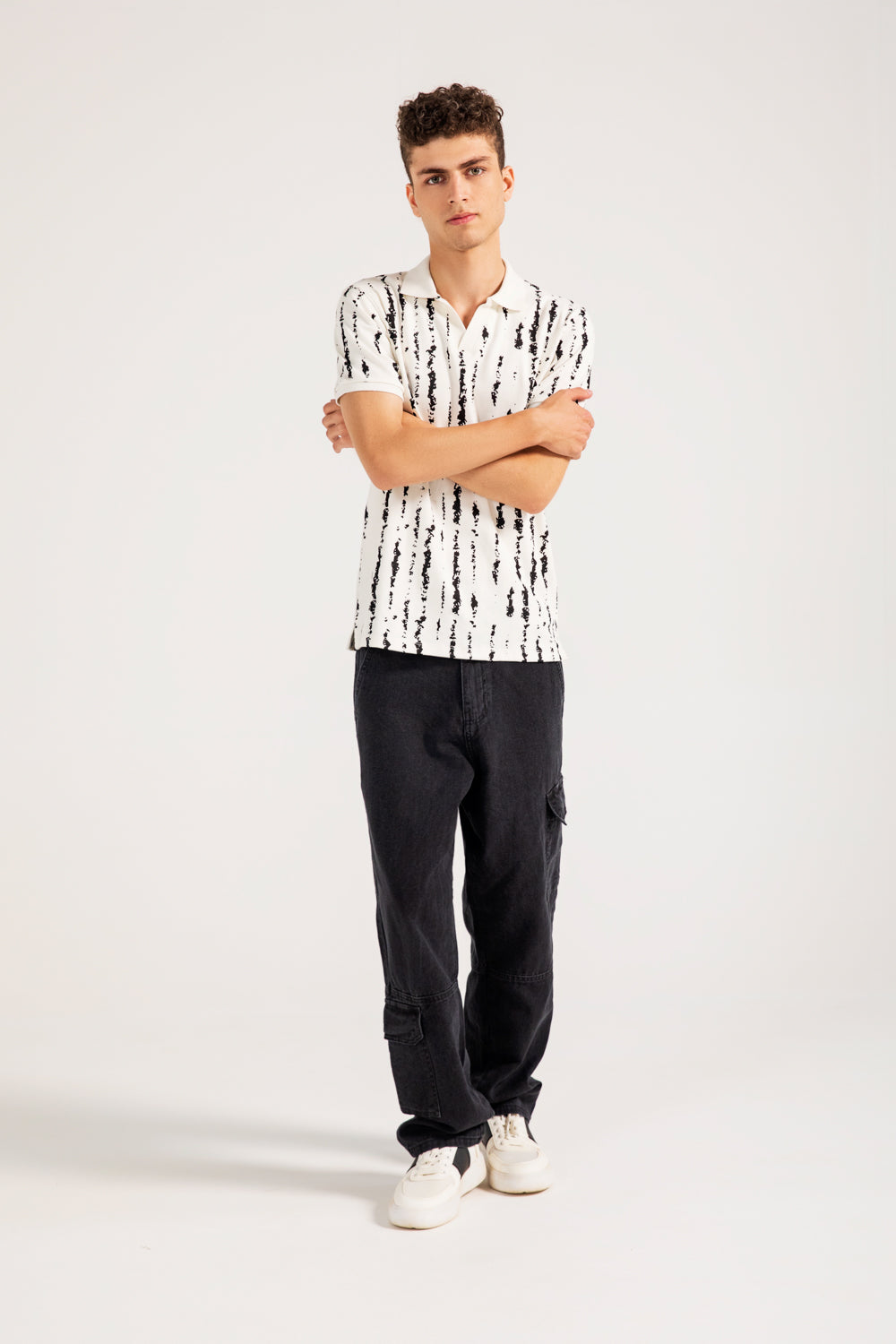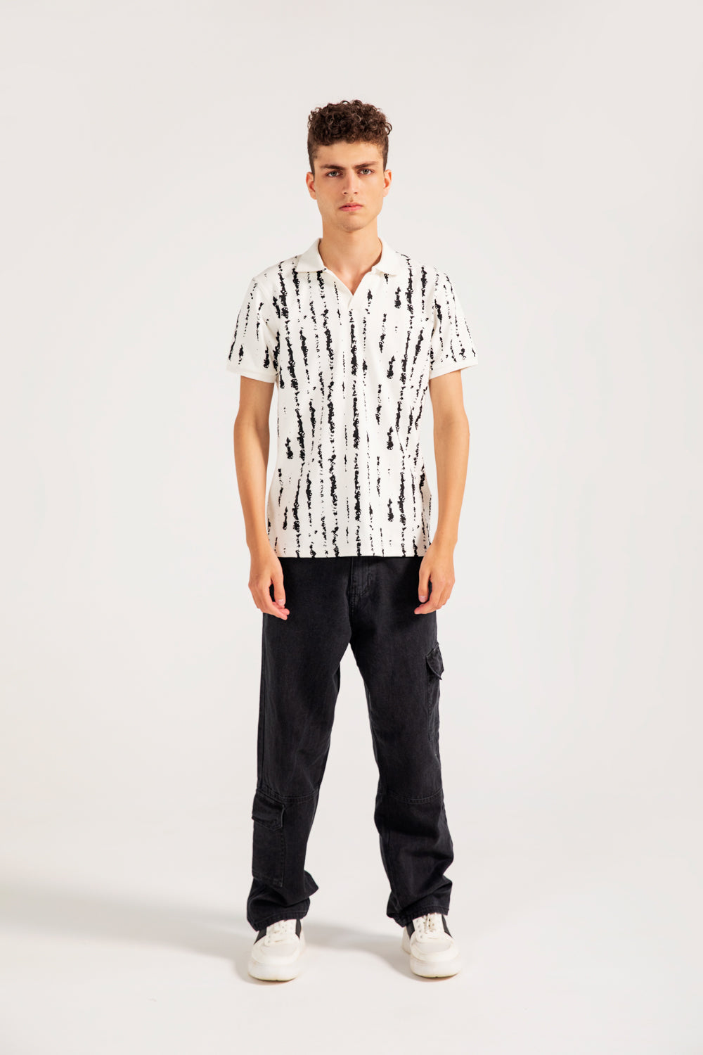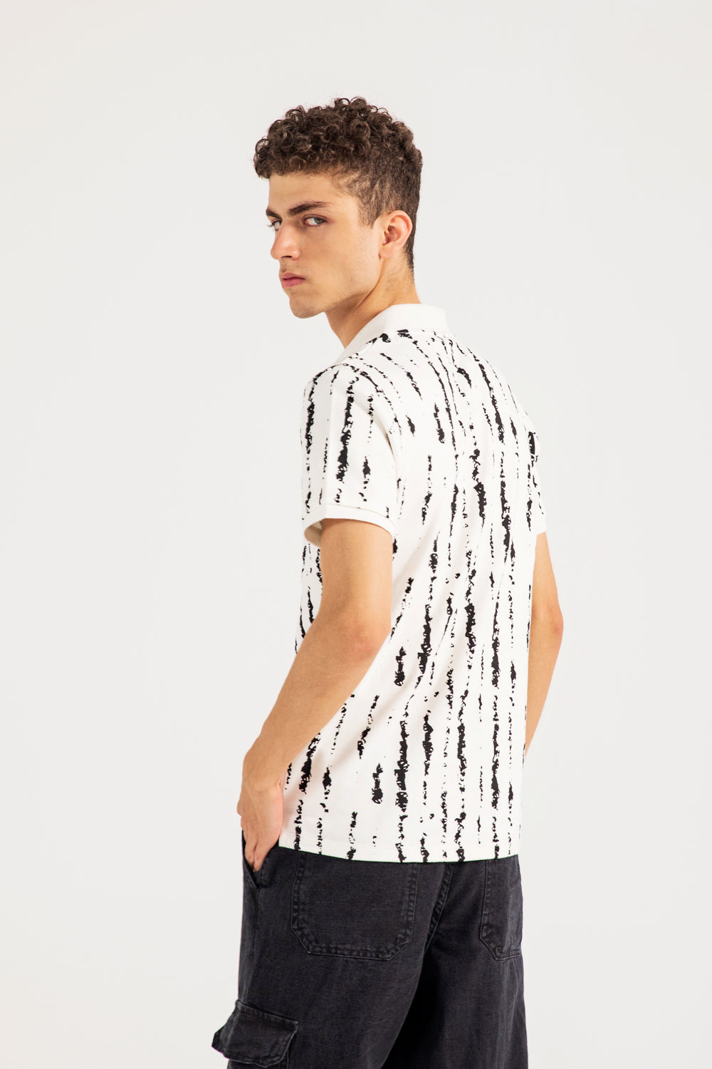 White cotton polo with a Johnny collar, featuring an all over abstract black print.