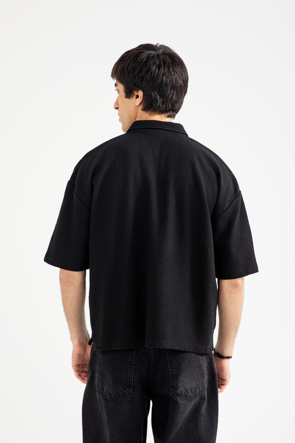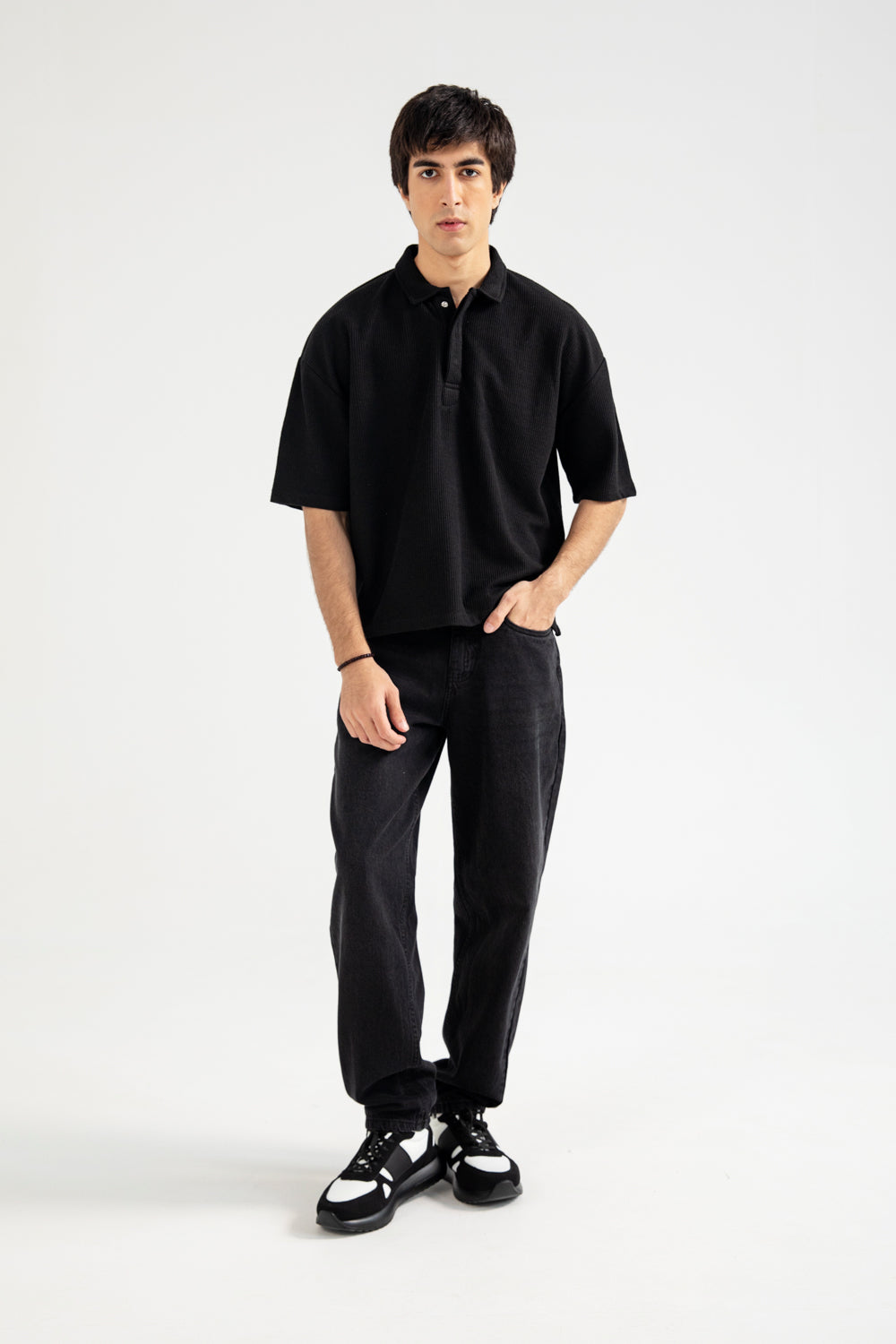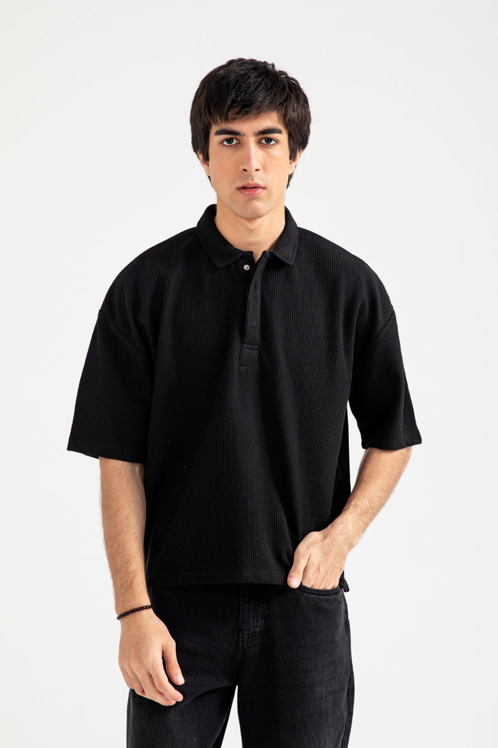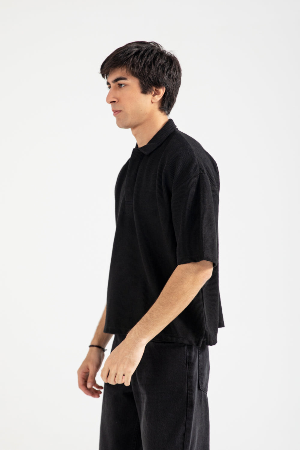 Black polo in a soft cotton synthetic blend with a boxy fit, featuring a hidden placket and a plain finish.