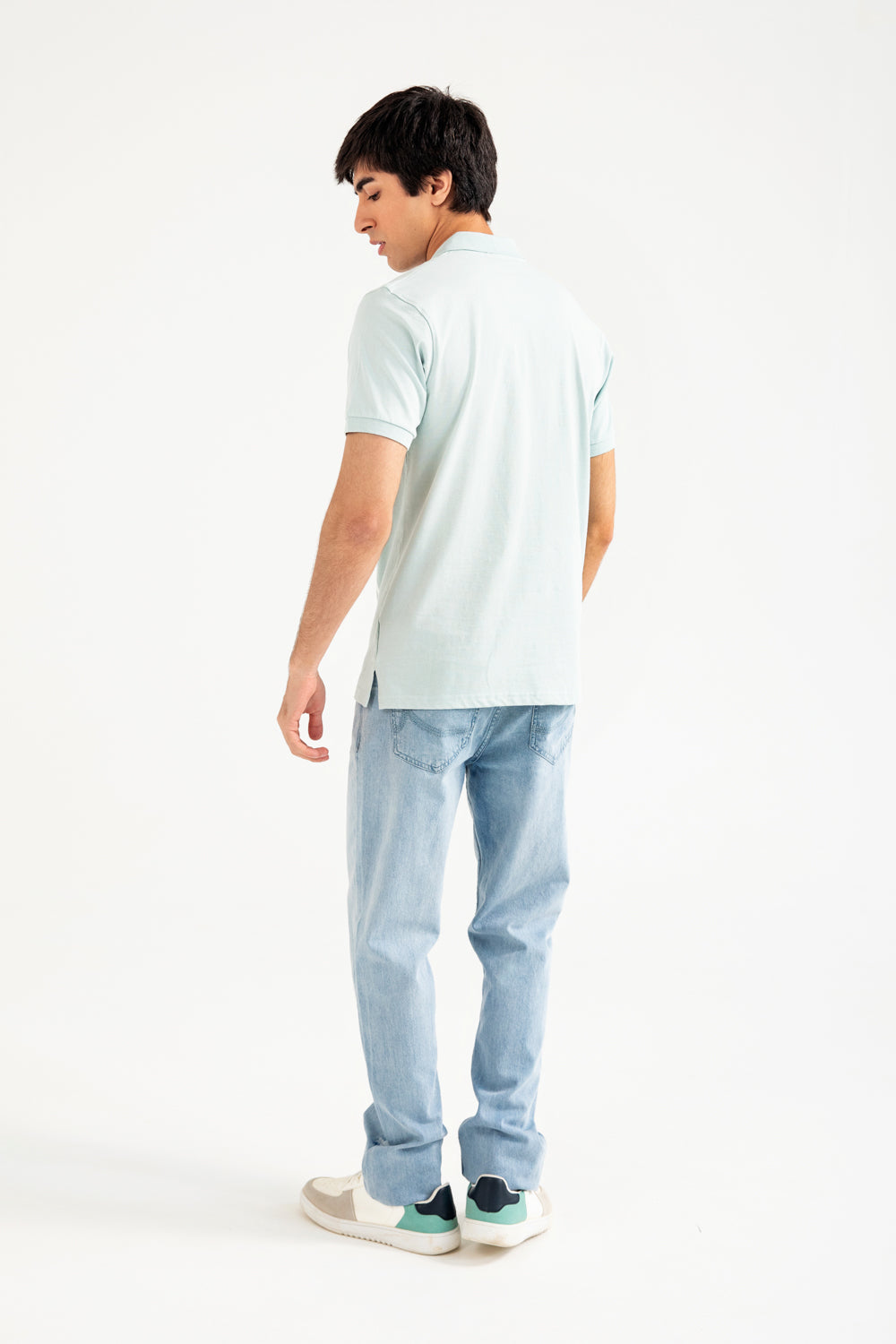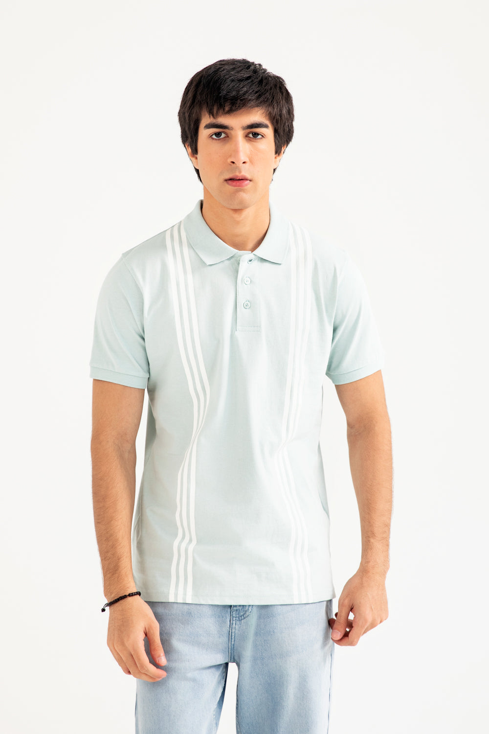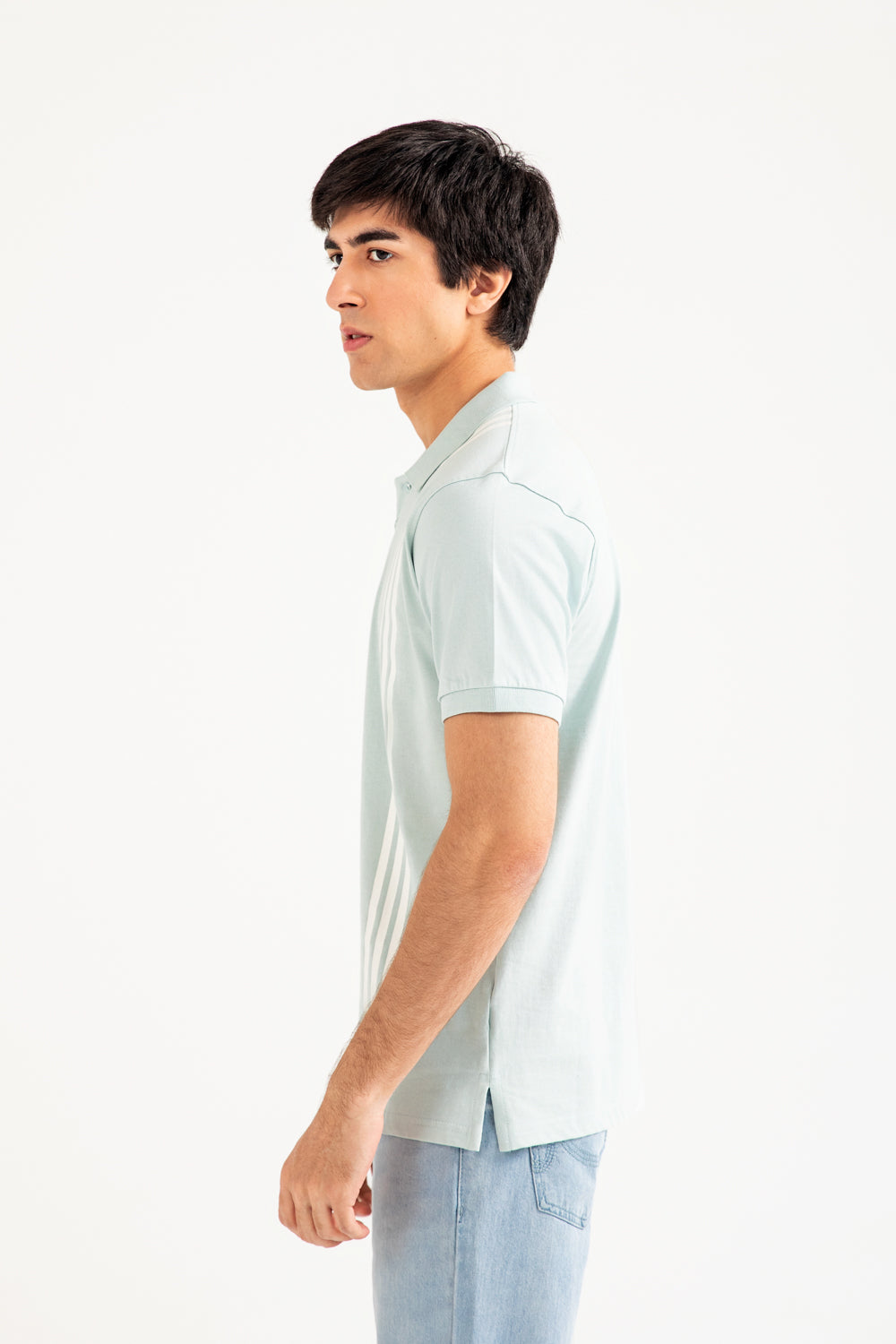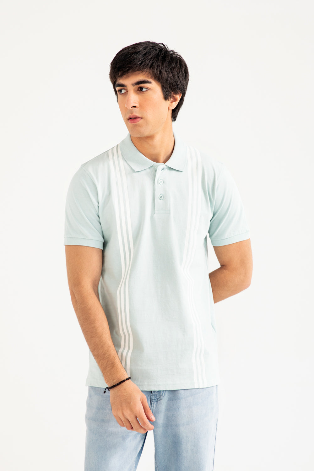Baby blue cotton polo with white vertical stripes, finished with matching buttons.