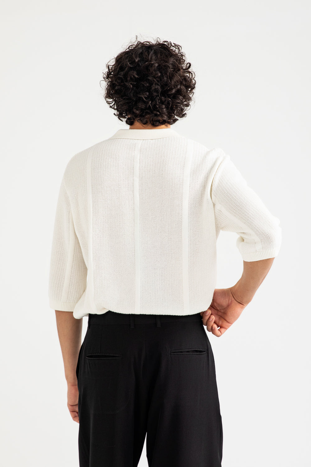 Off-white cotton knitted polo in a relaxed baggy fit, designed with a Johnny collar and three quarter sleeves.