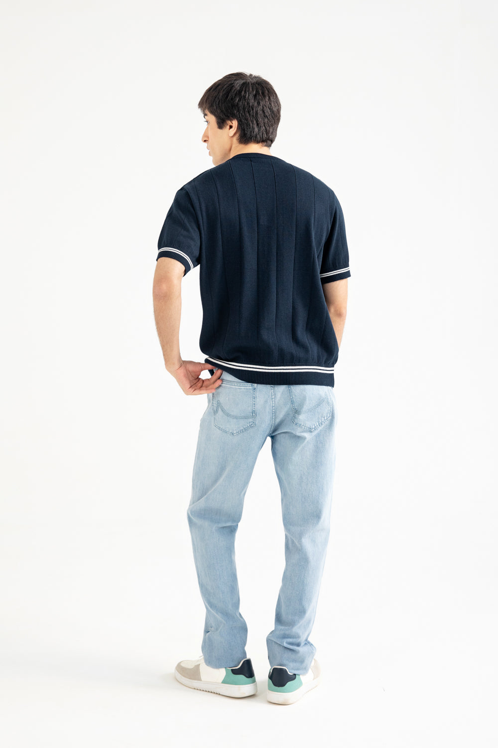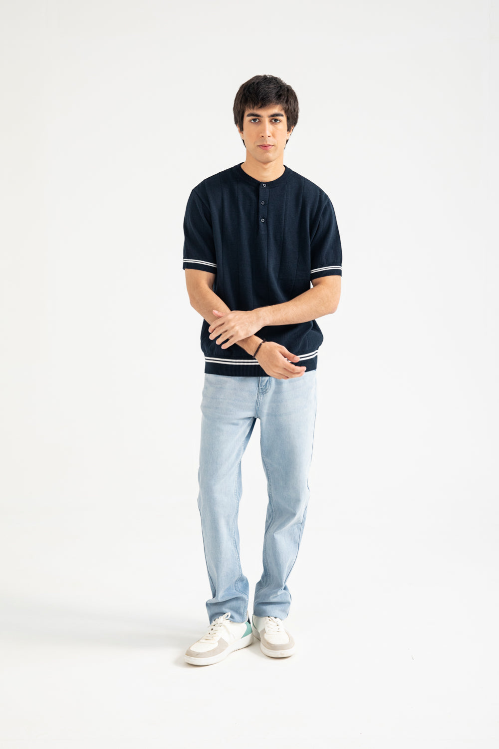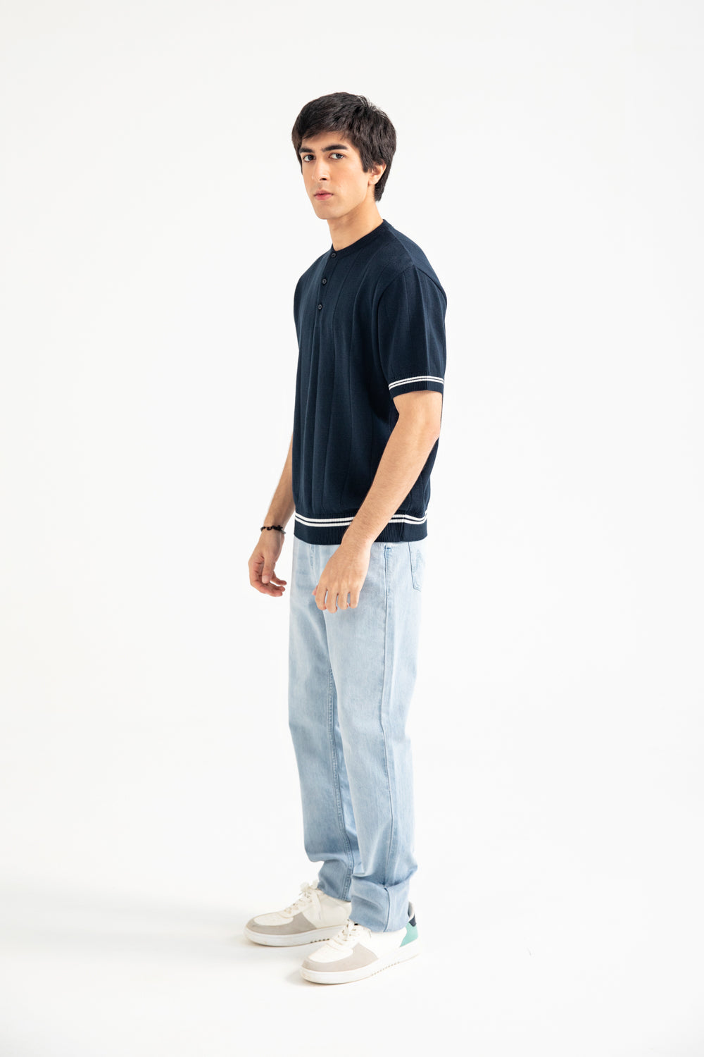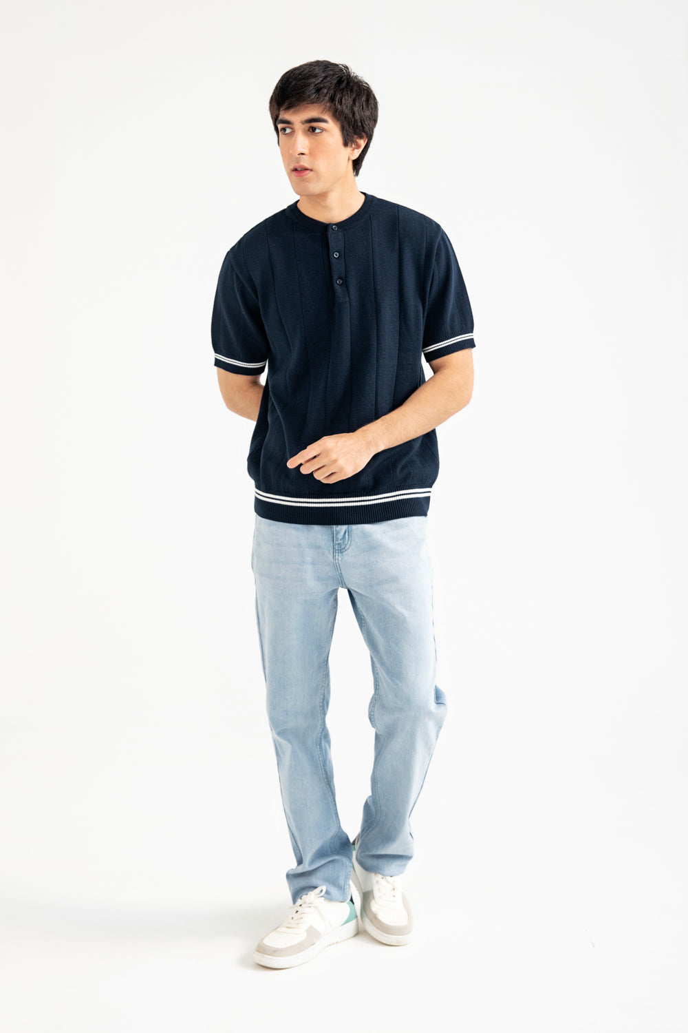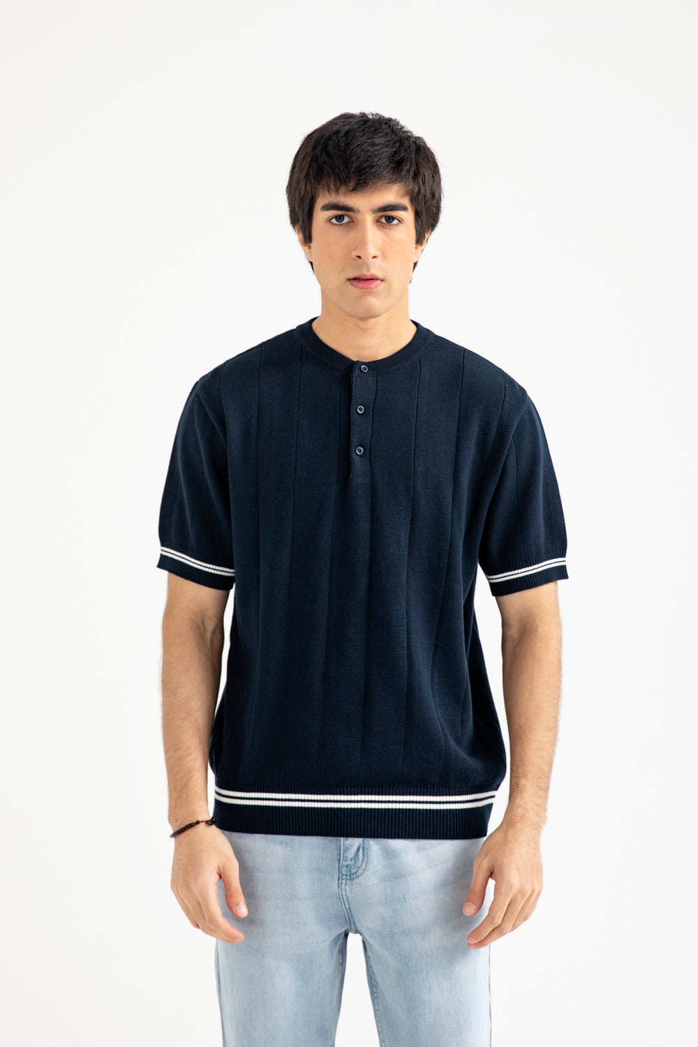 Navy knitted Henley with a vertical striped texture, finished with matching buttons.