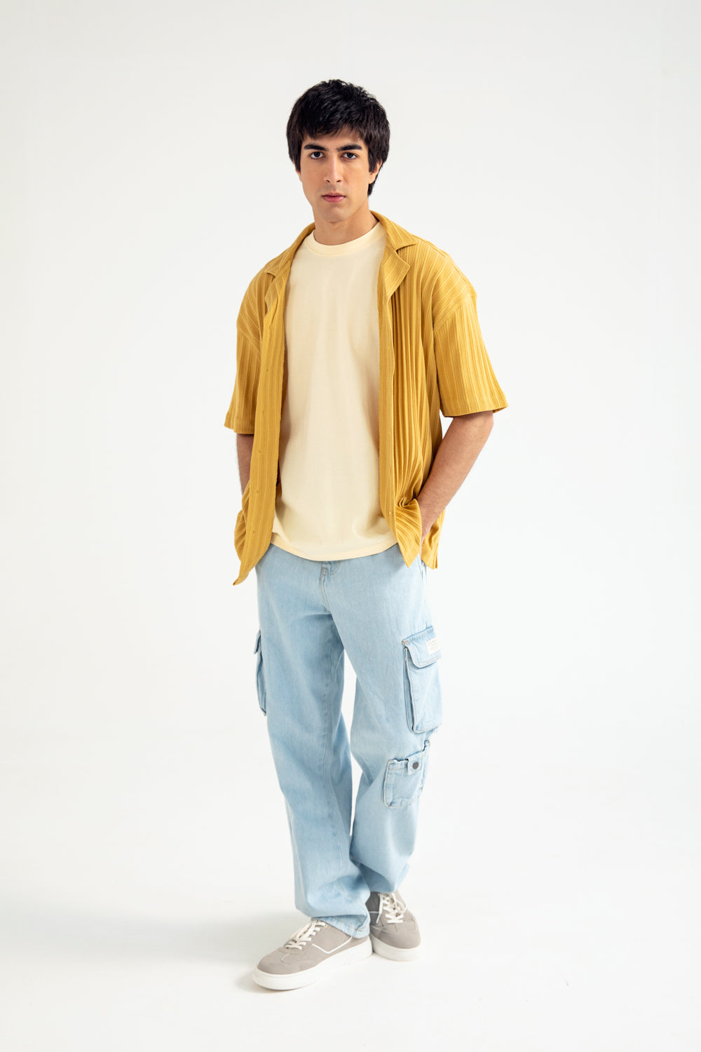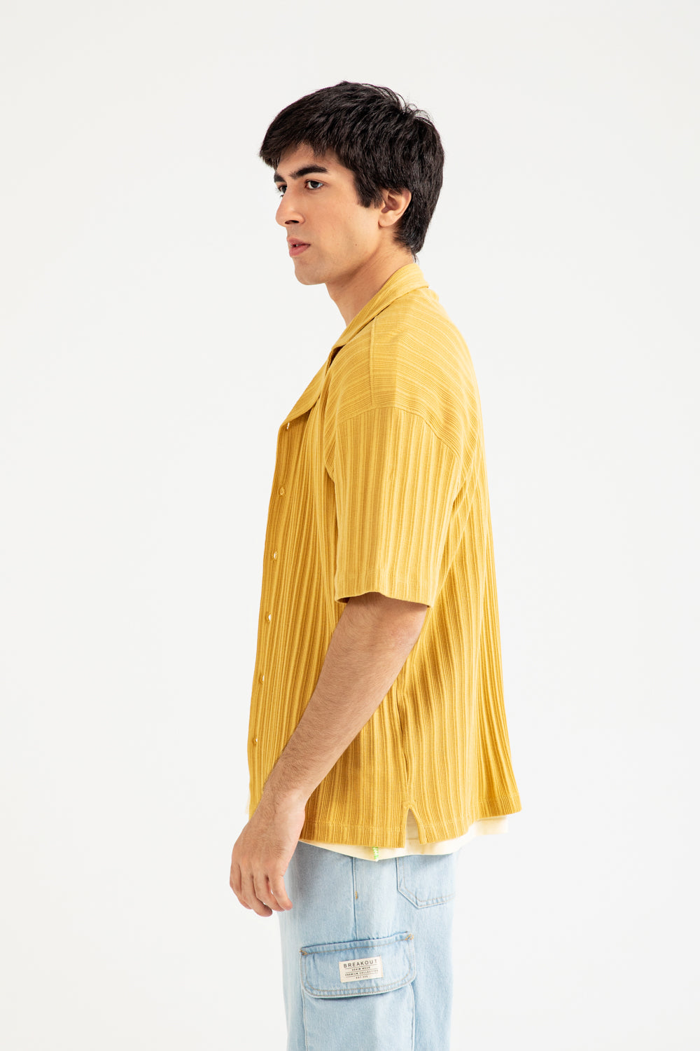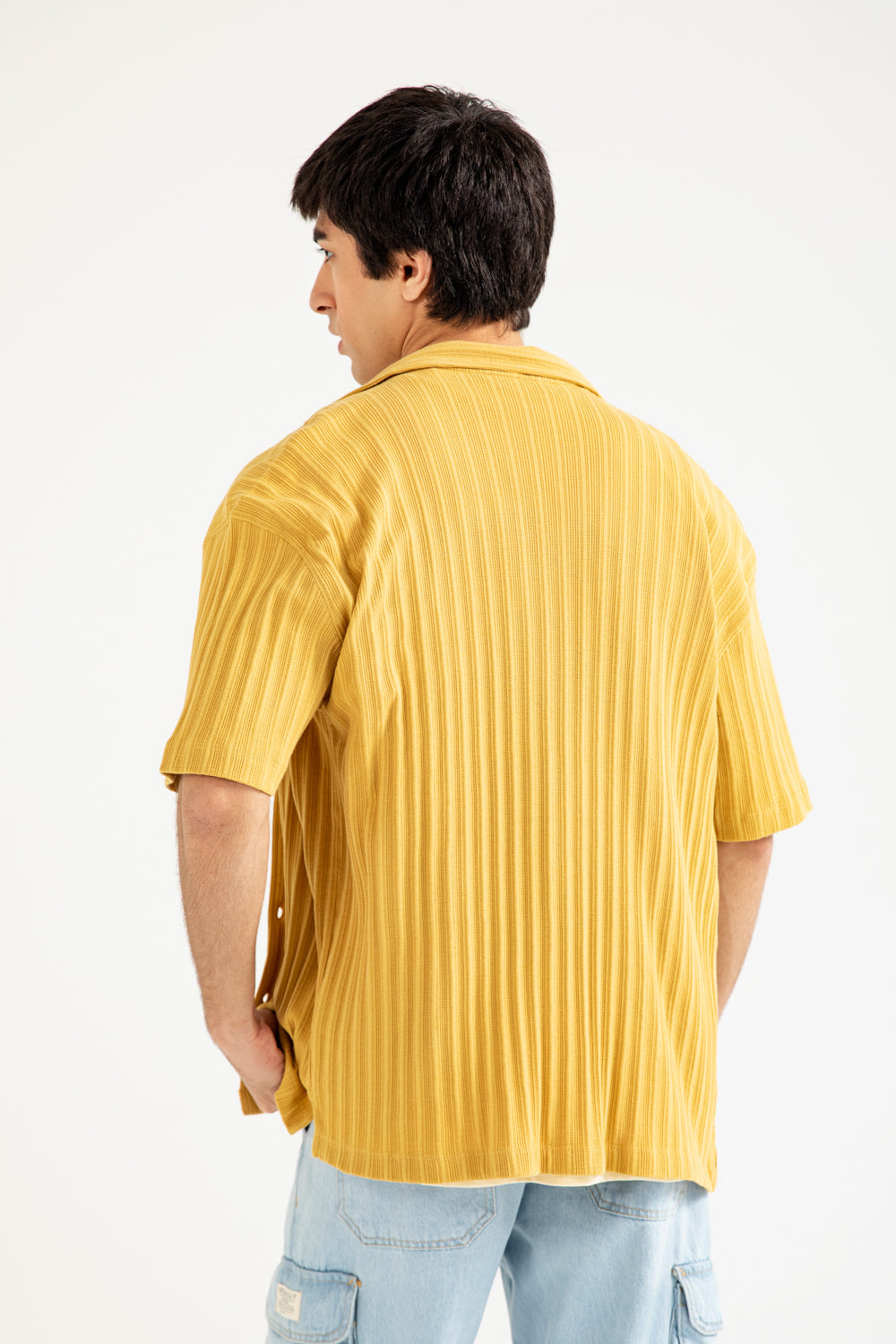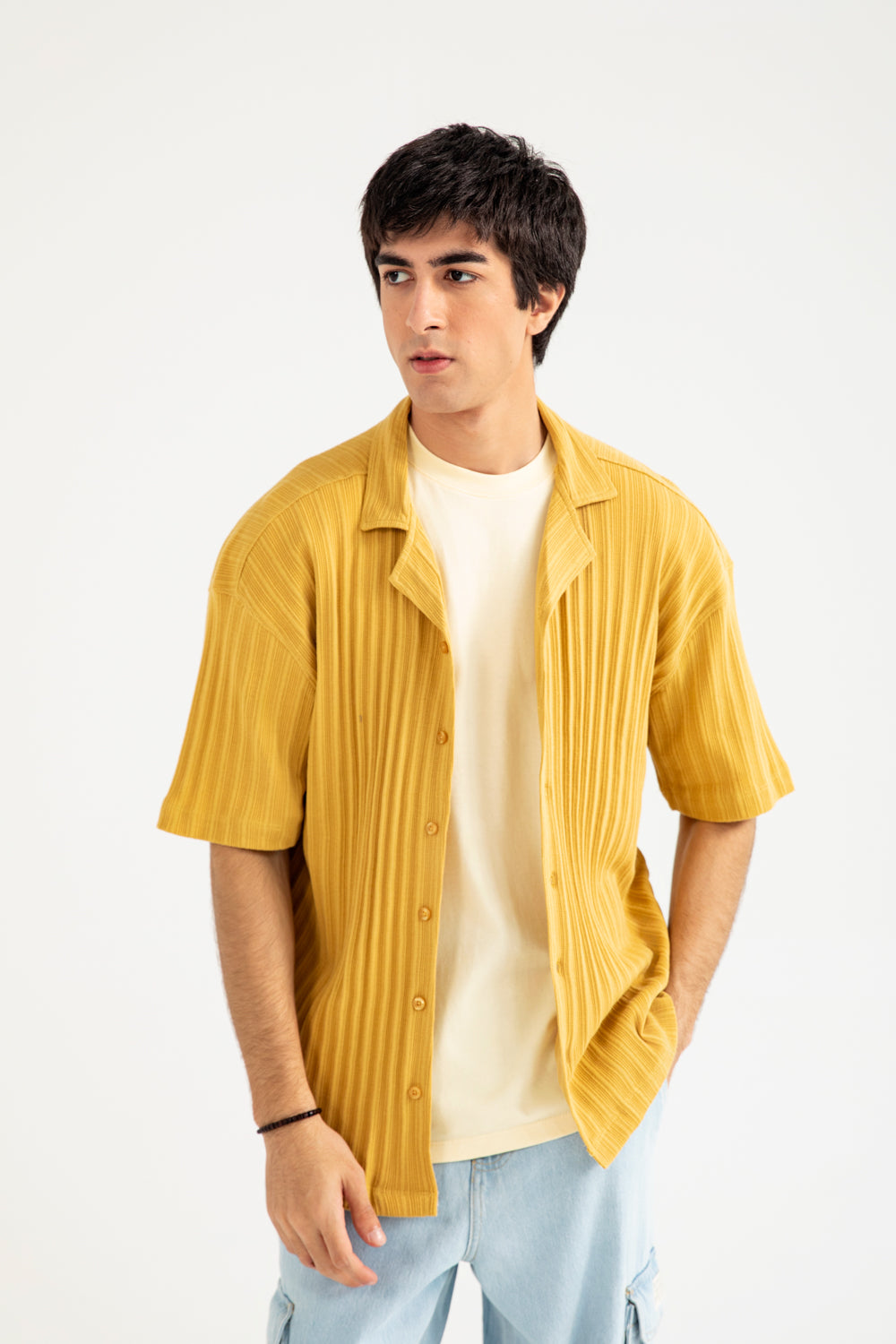 Crafted from cotton with a textured finish, this mustard polo features a relaxed baggy fit, a laid back resort collar, and matching buttons for a clean and coordinated look.