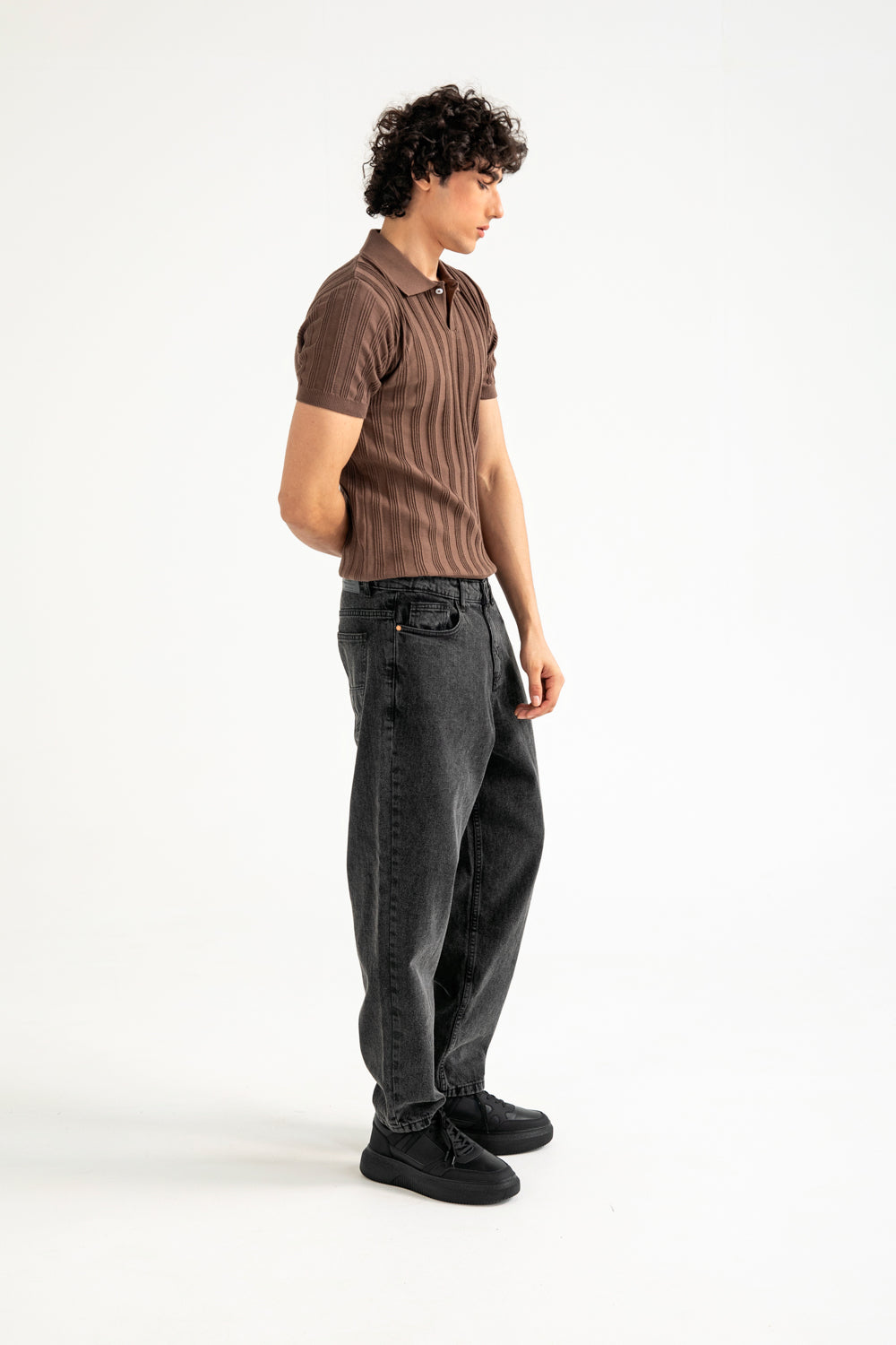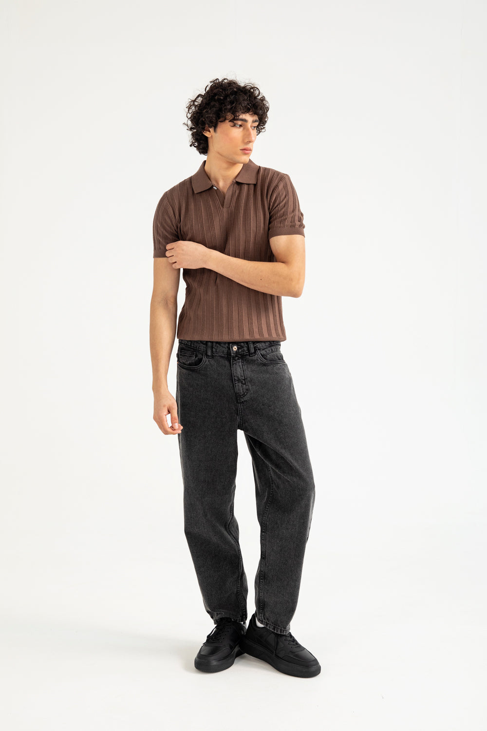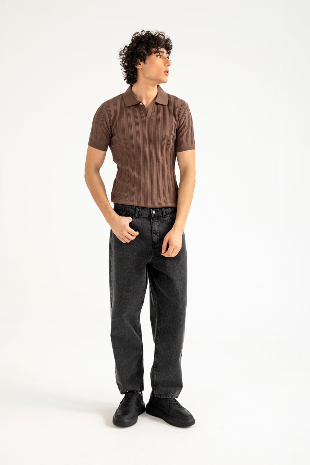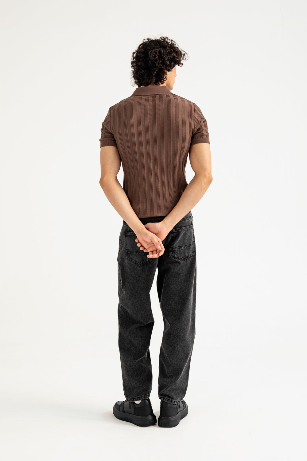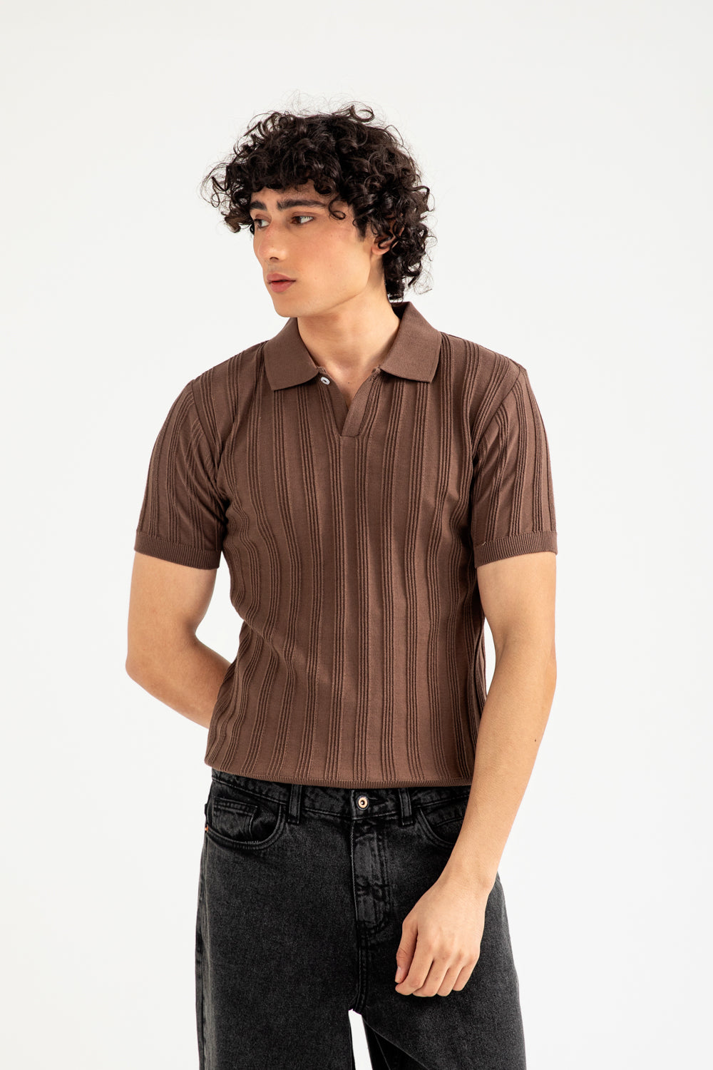 Brown knitted polo with a vertical striped texture, finished with a single white button and ribbed hem and sleeves.