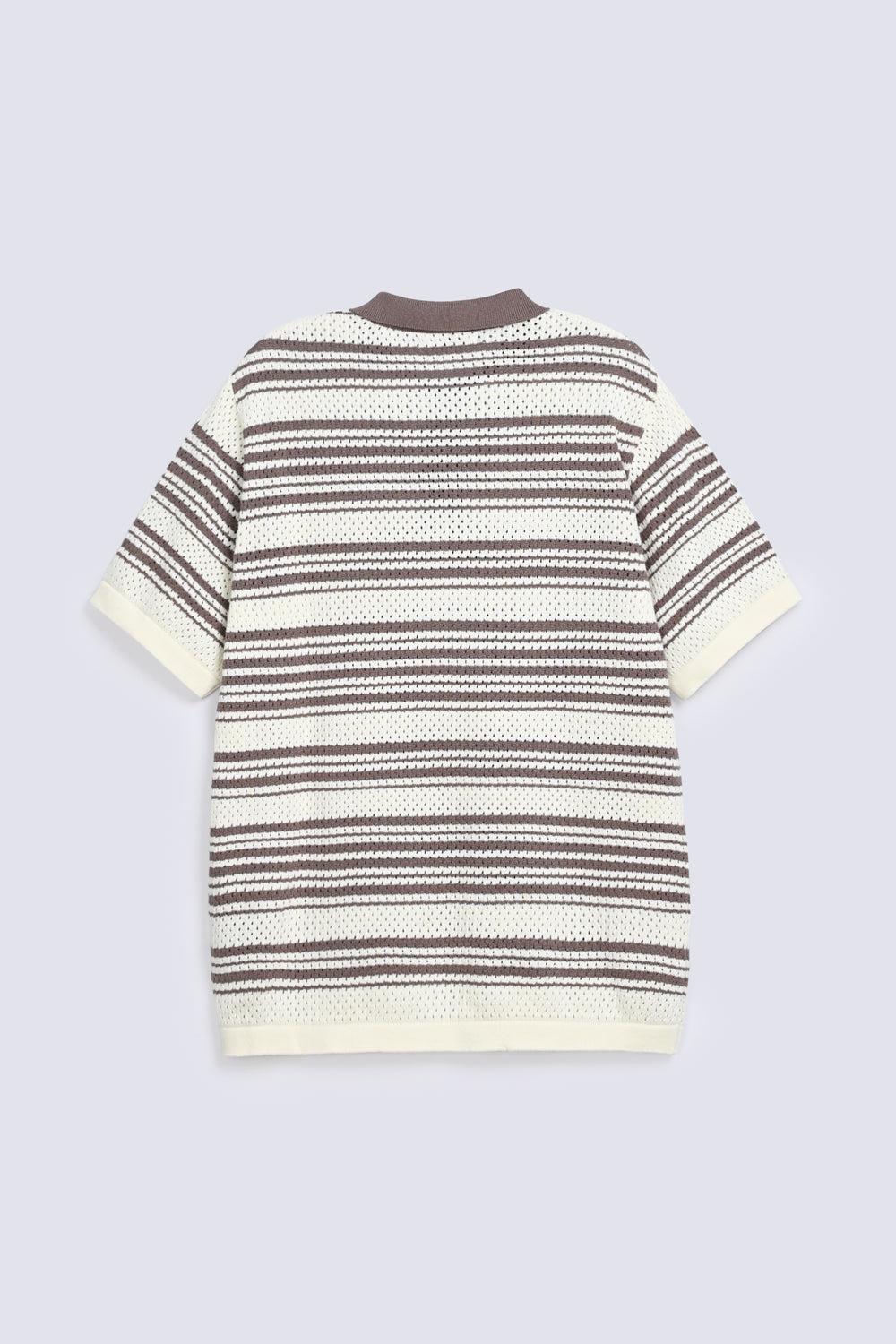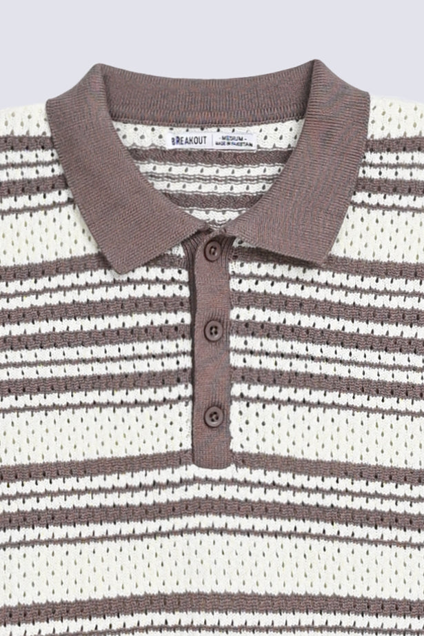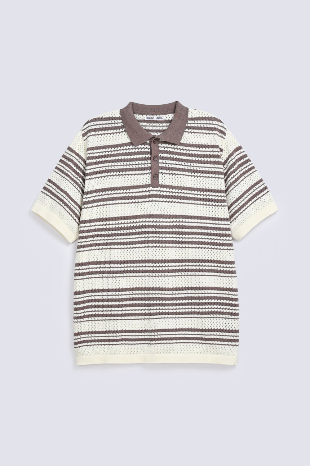 Soft knit polo with horizontal brown stripes over an off-white base. Finished with a neat collar and matching brown buttons.