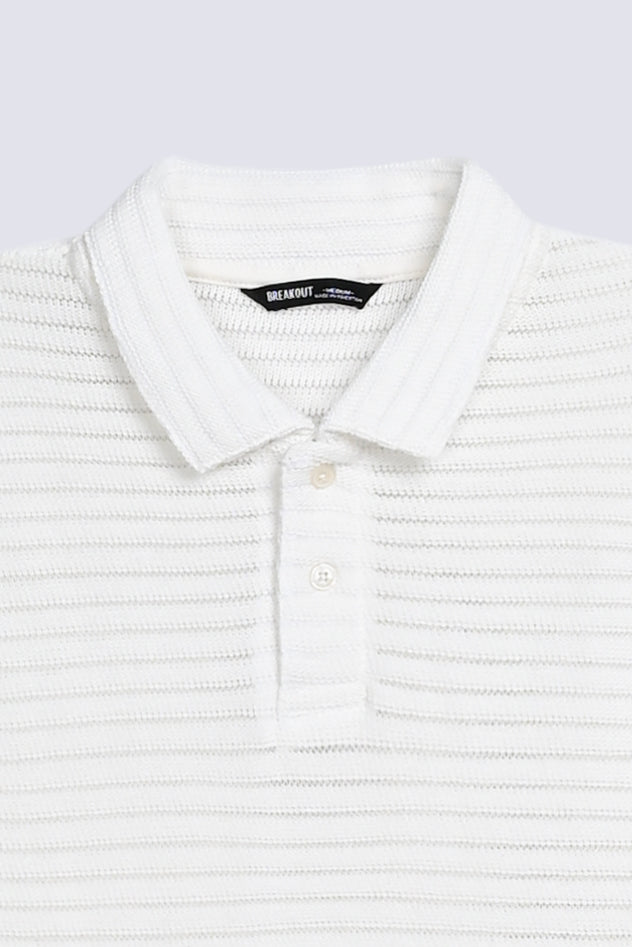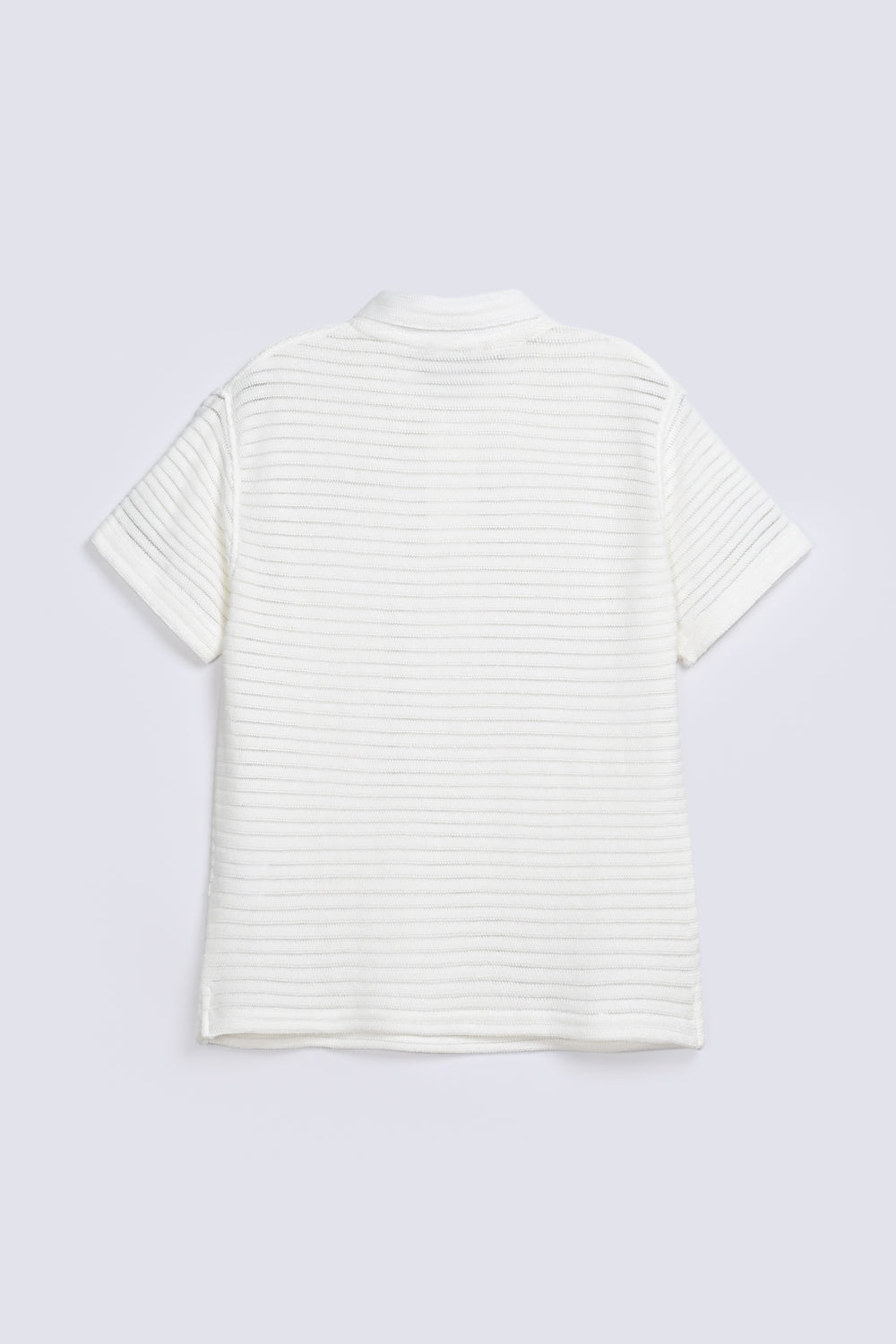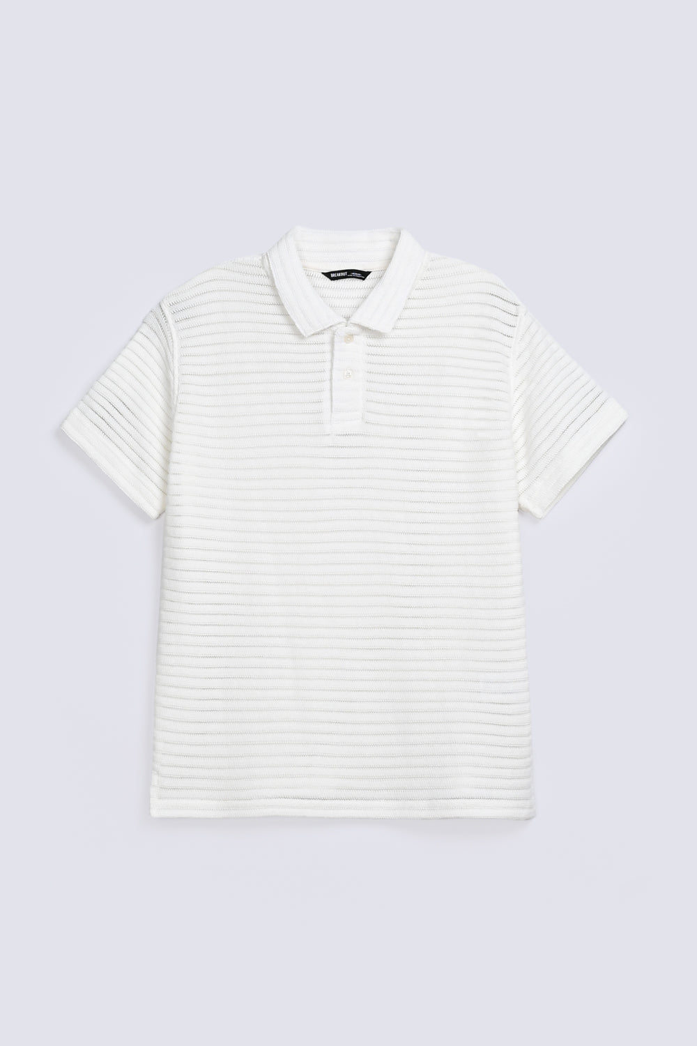 Cotton-synthetic summer blend polo in an off-white shade, designed with a horizontal striped texture. Finished with a classic collar and two matching buttons.