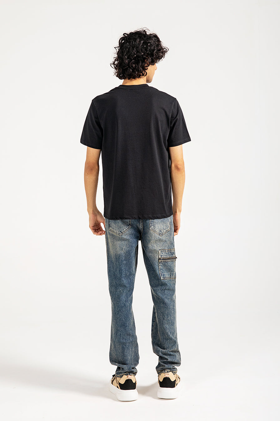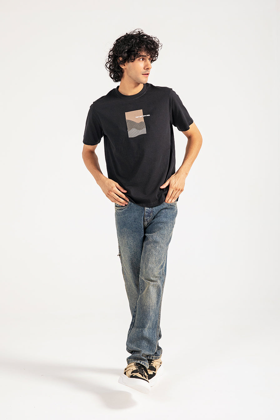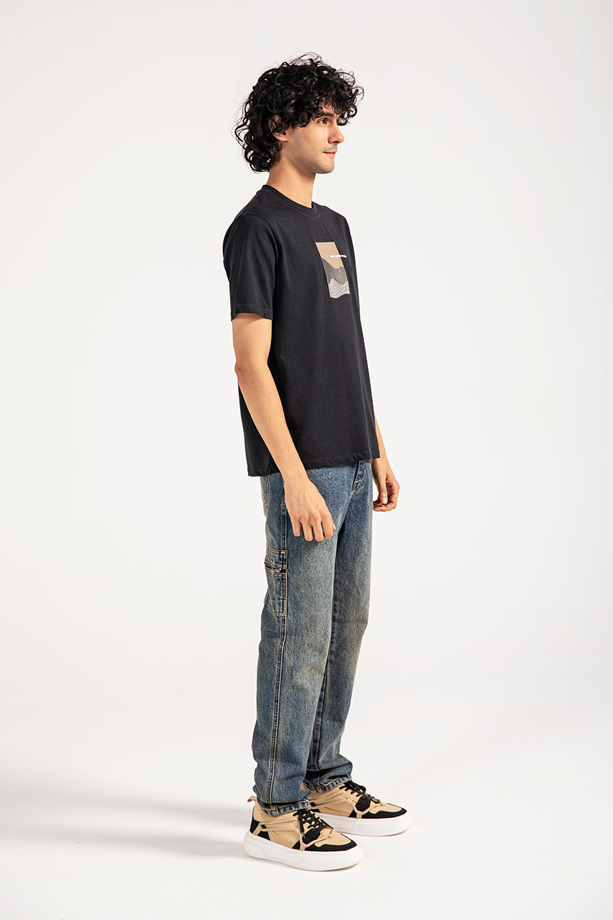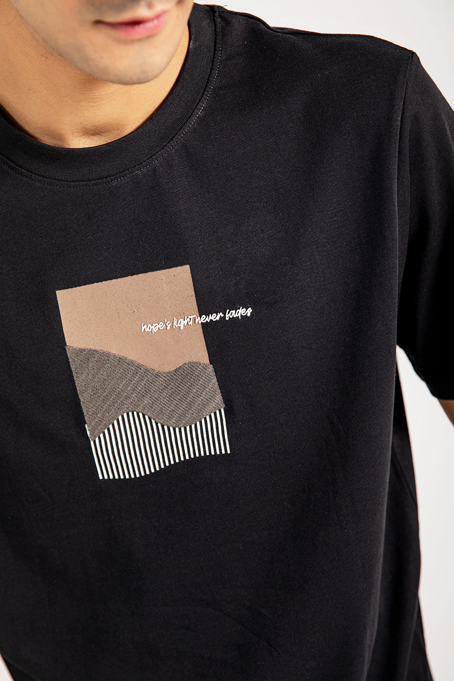 Black cotton tee featuring minimal abstract artwork at the center front, combining embroidery and print for a textured finish.