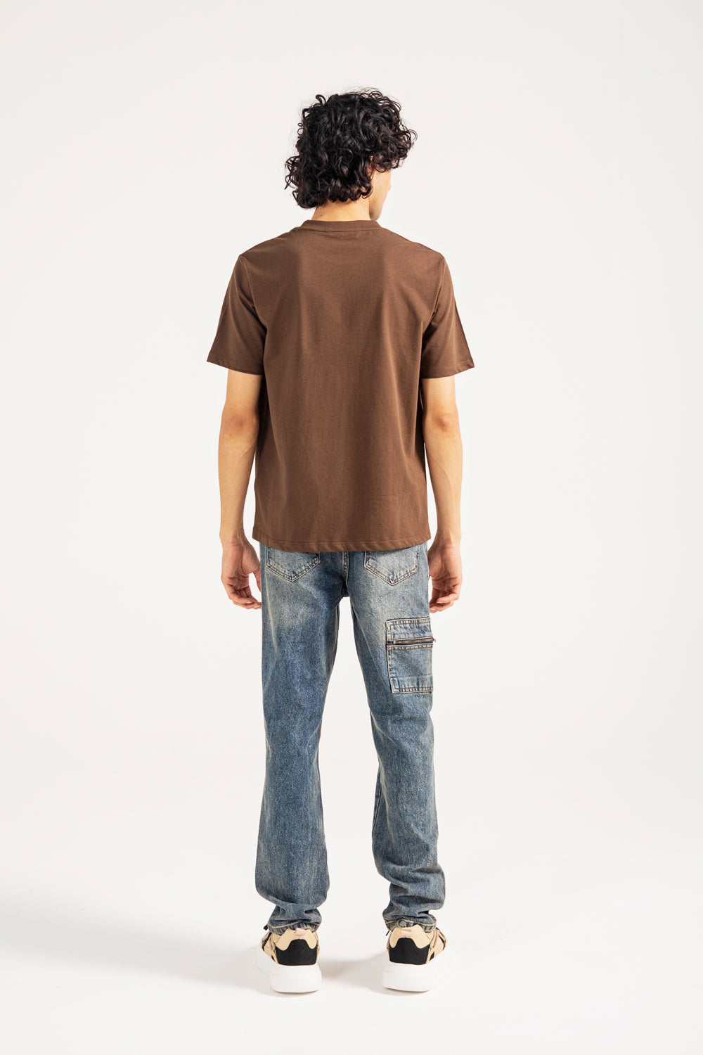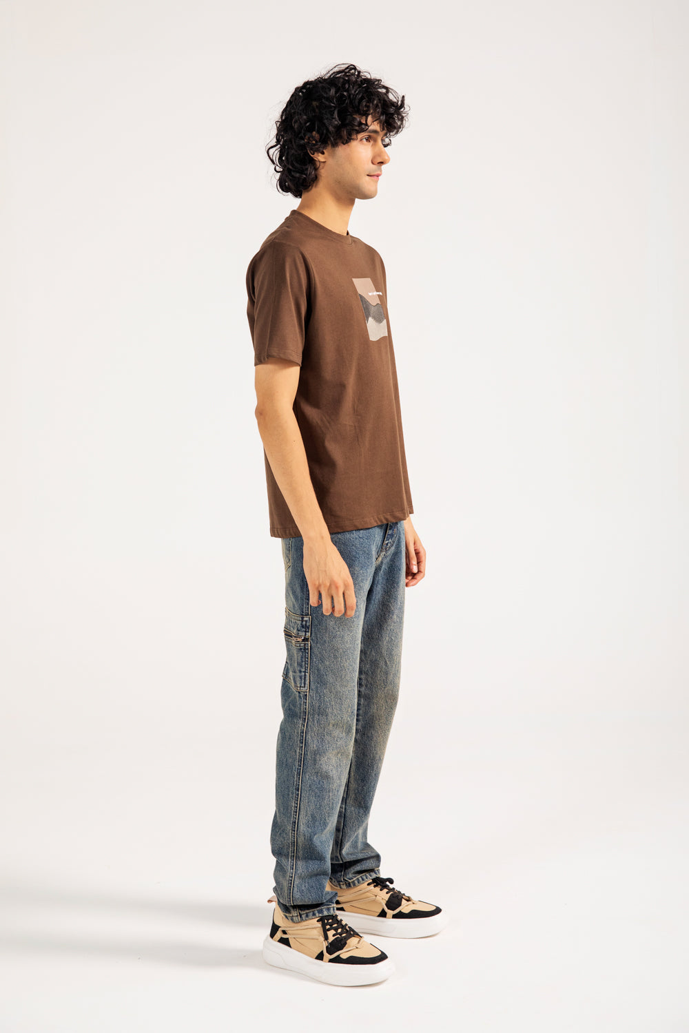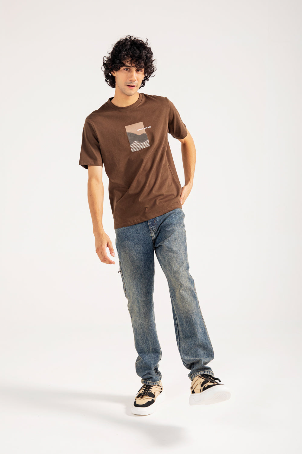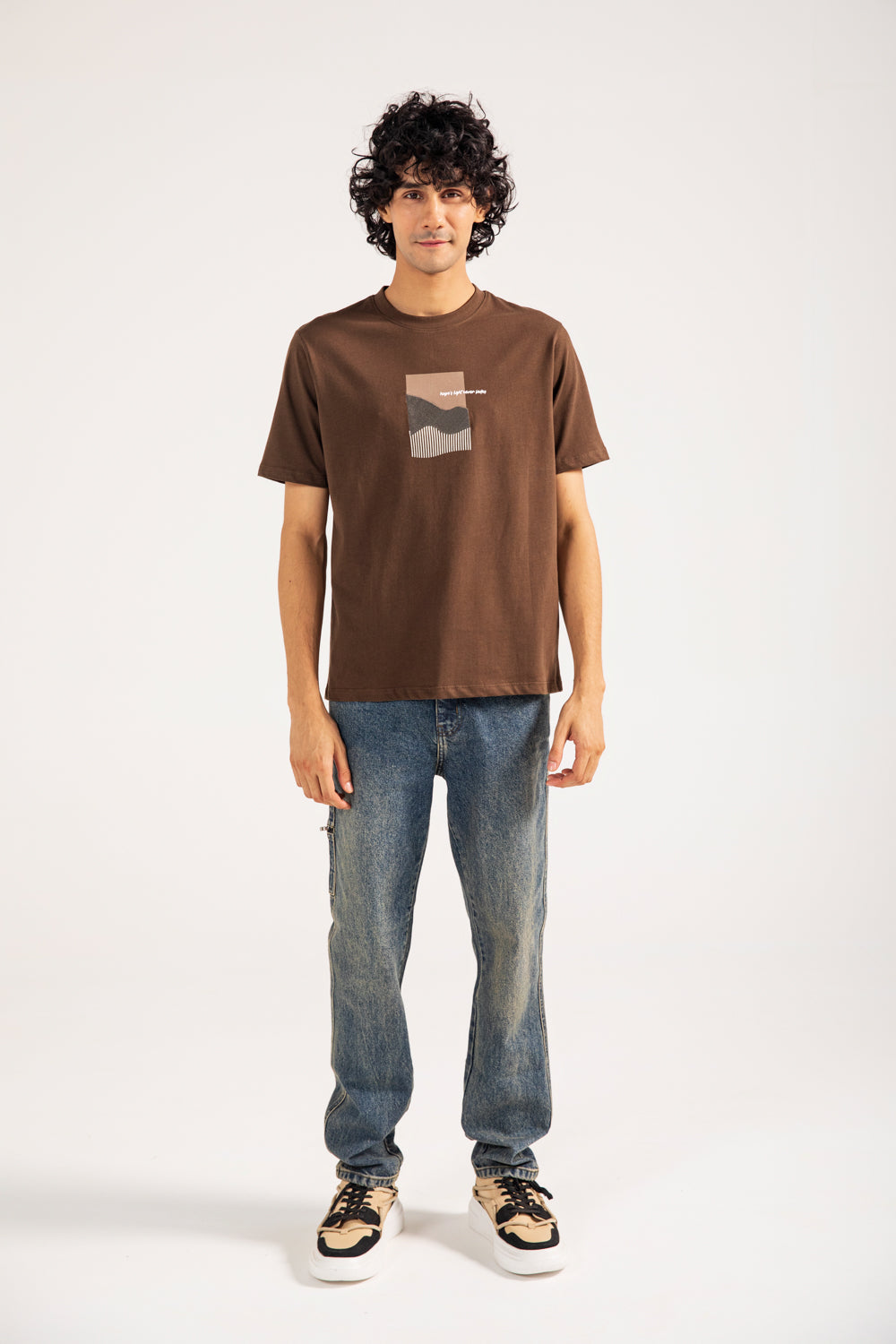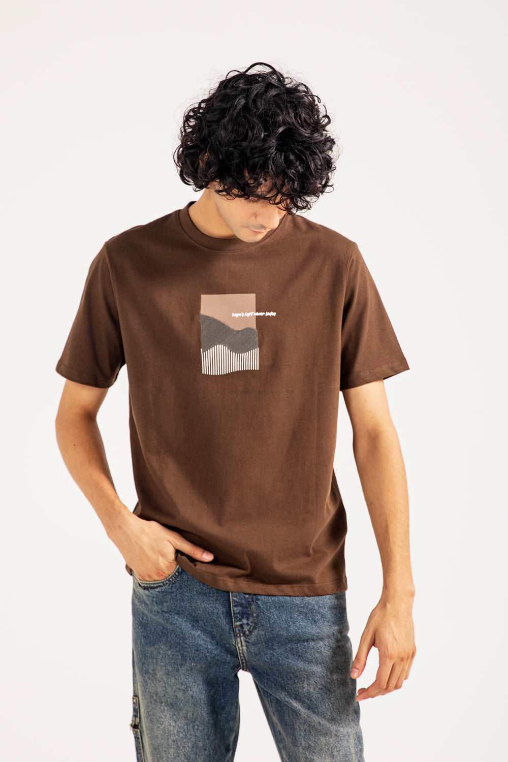 Brown cotton tee featuring minimal abstract artwork at the center front, combining embroidery and print for a textured finish.