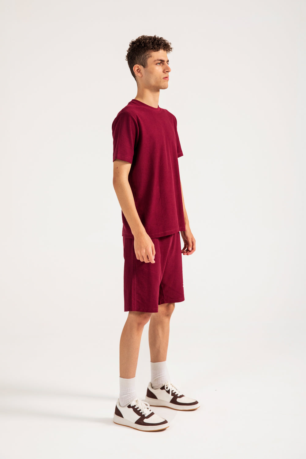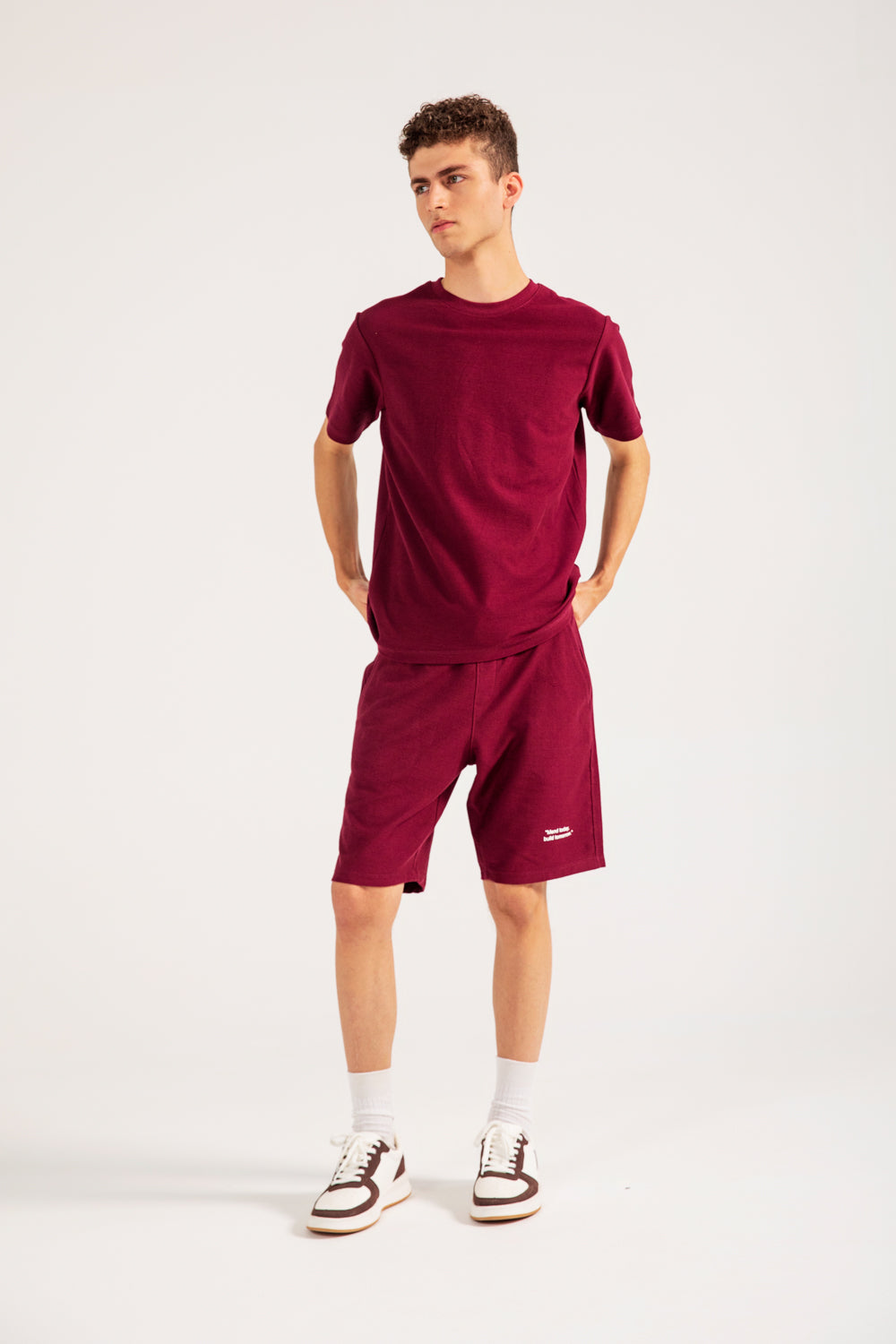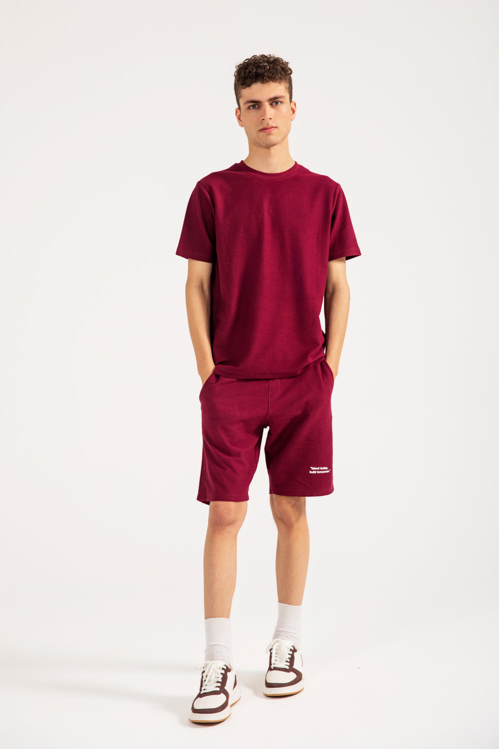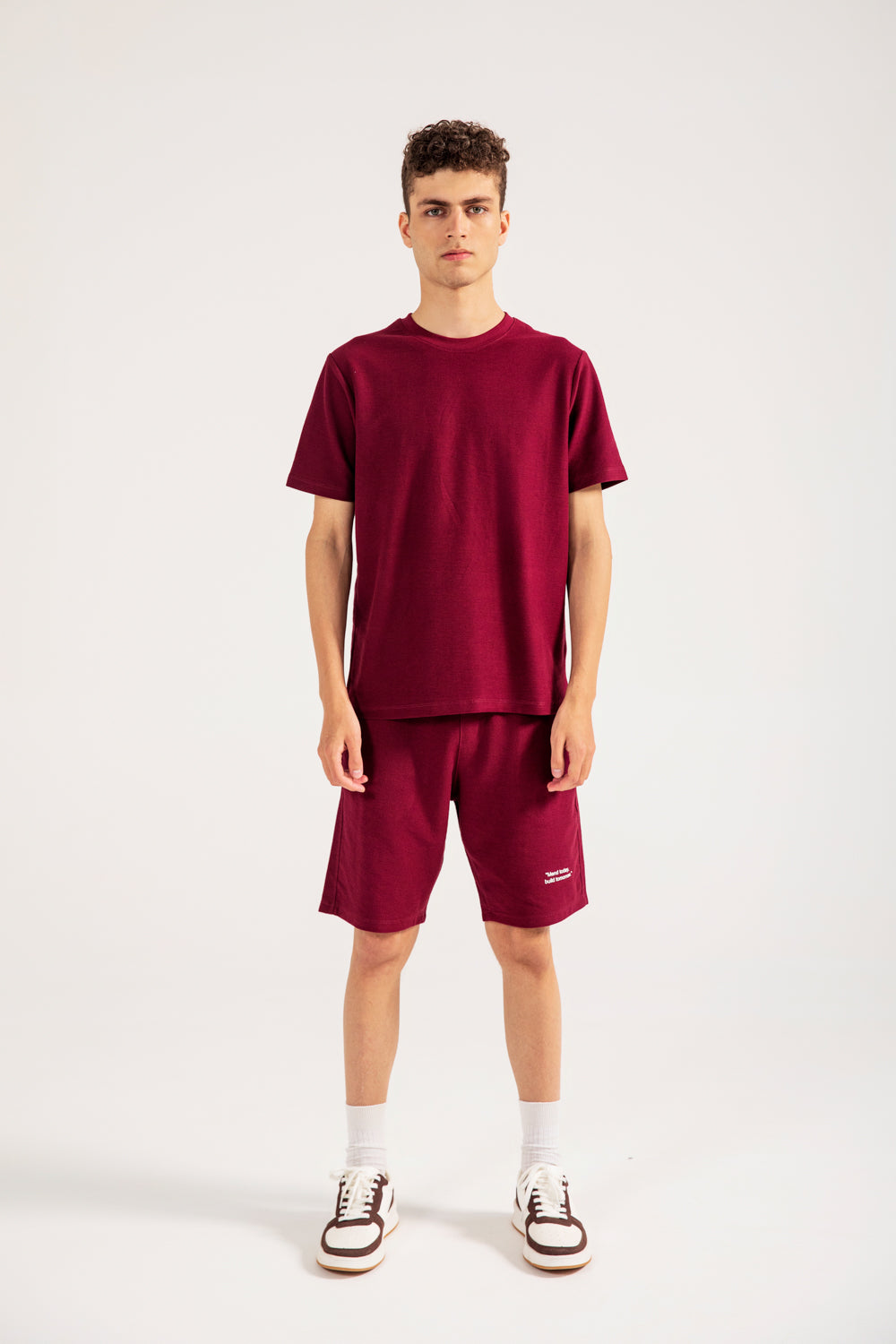 Graphic tee in burgundy, crafted from cotton with a clean front and contrasting black printed patches on the back.