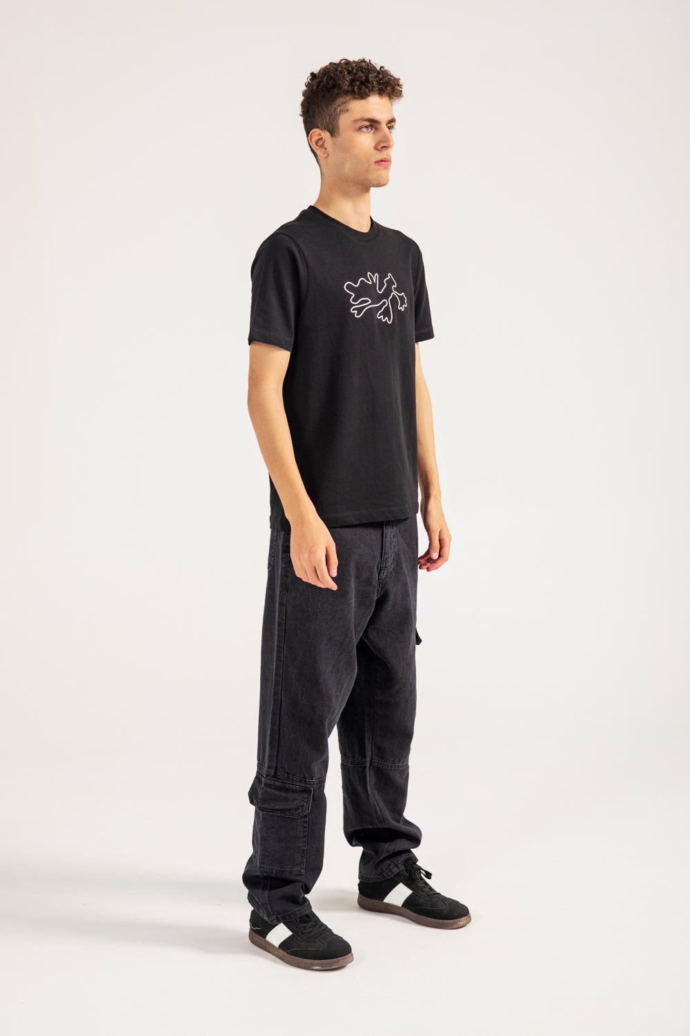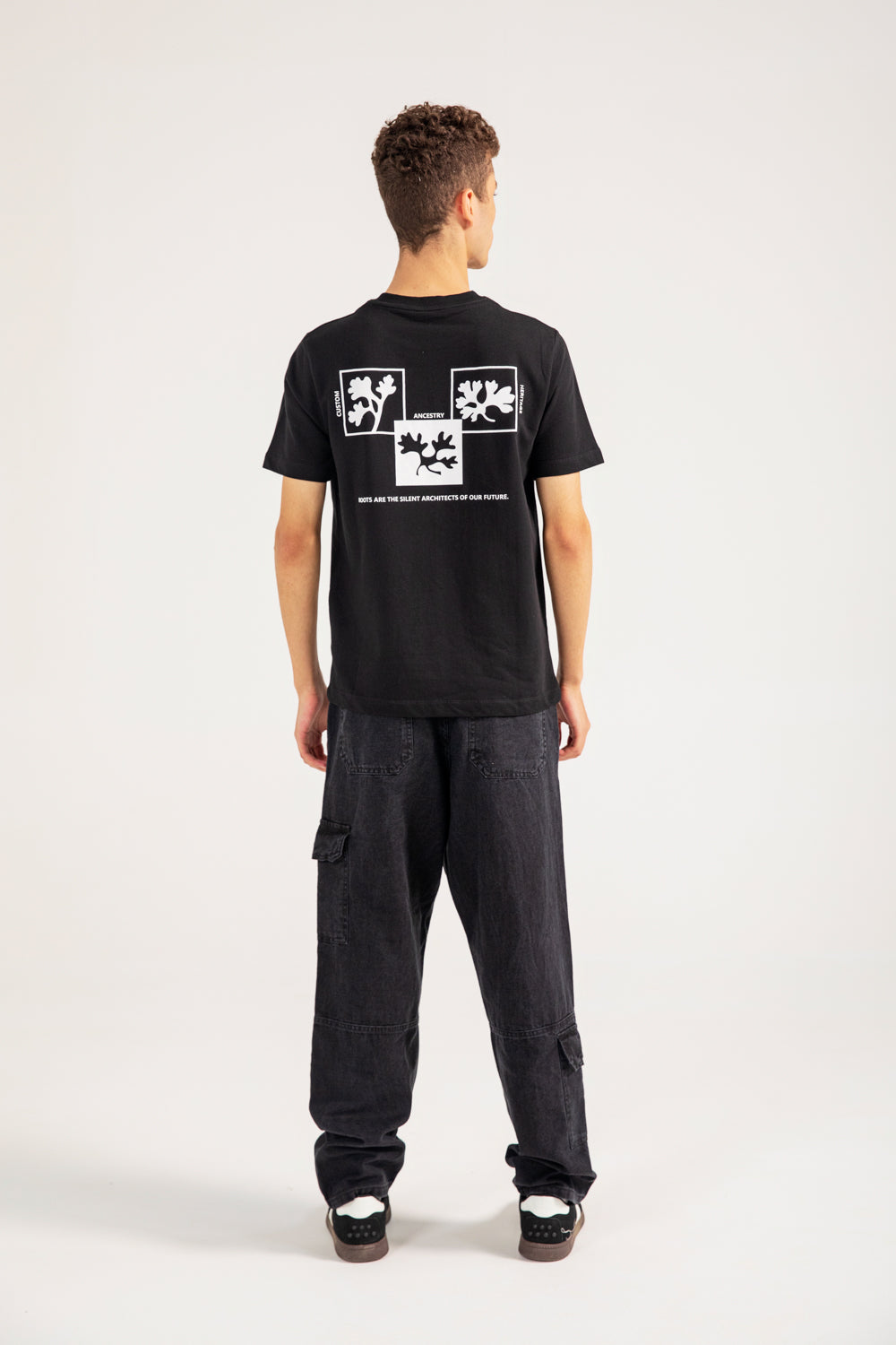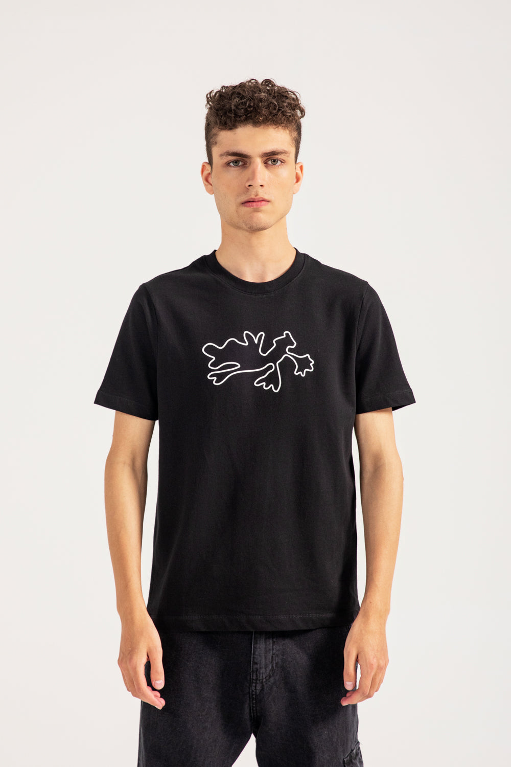 Cotton tee with a white abstract print on the front and a larger related graphic on the back.