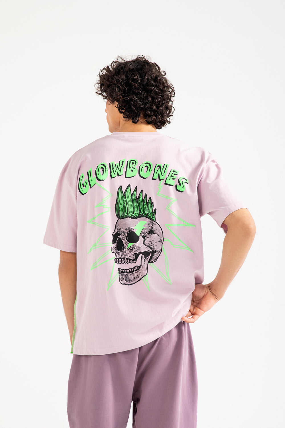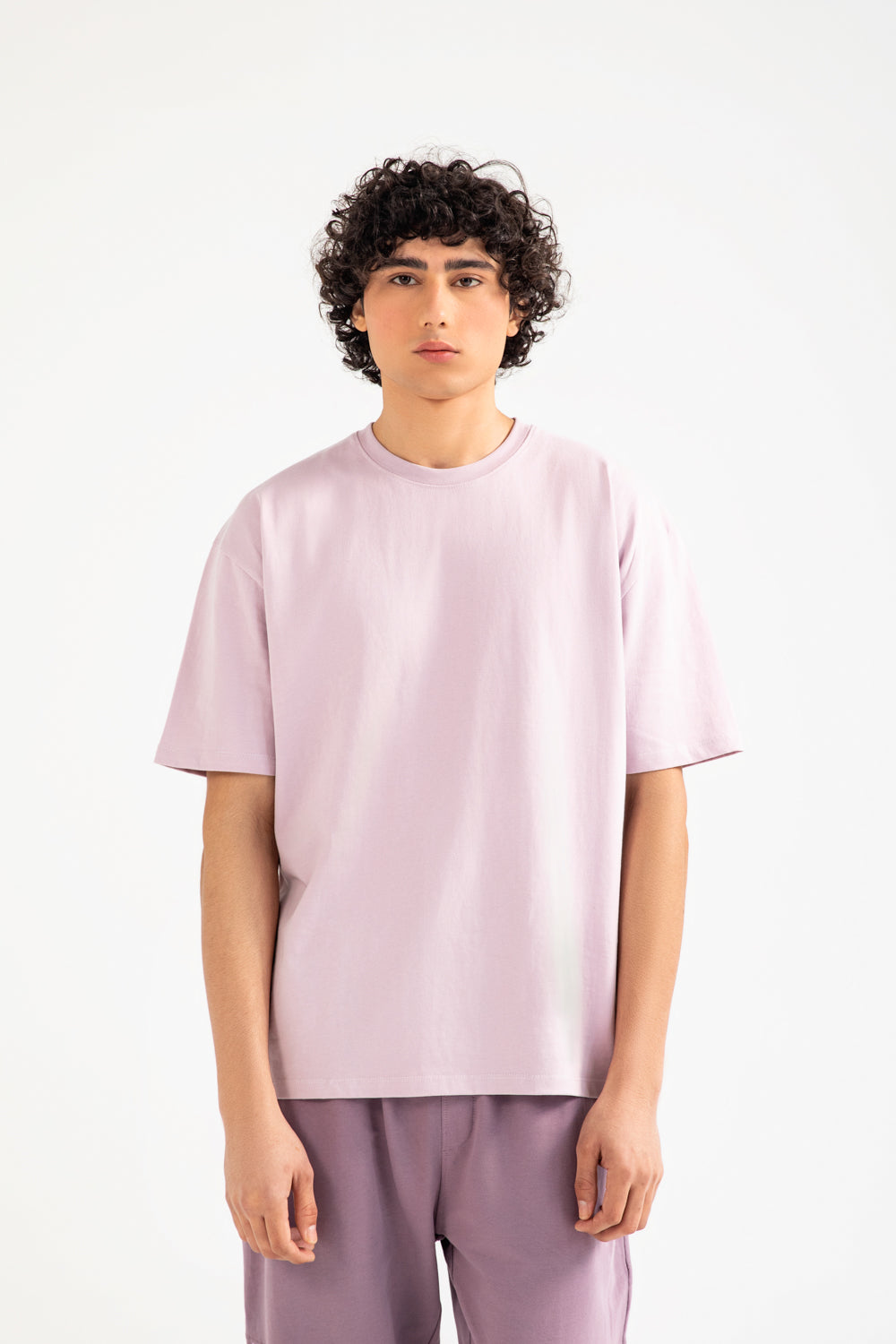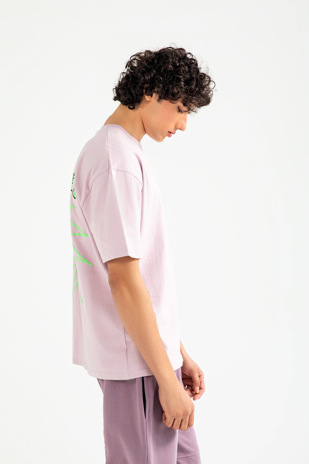 Lavender cotton tee in a relaxed baggy fit, featuring a plain front and a large graphic print on the back.