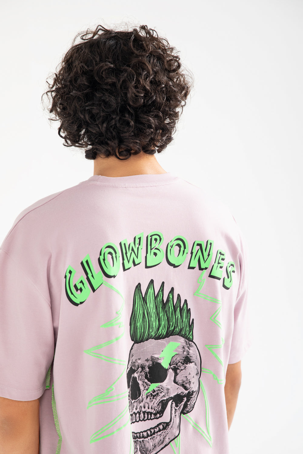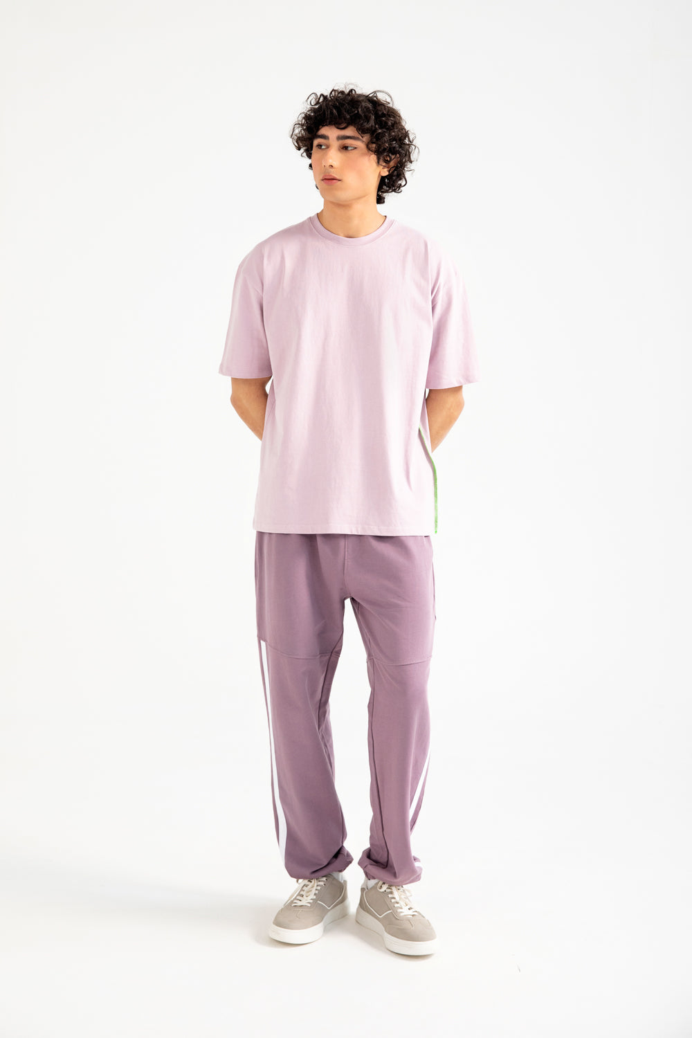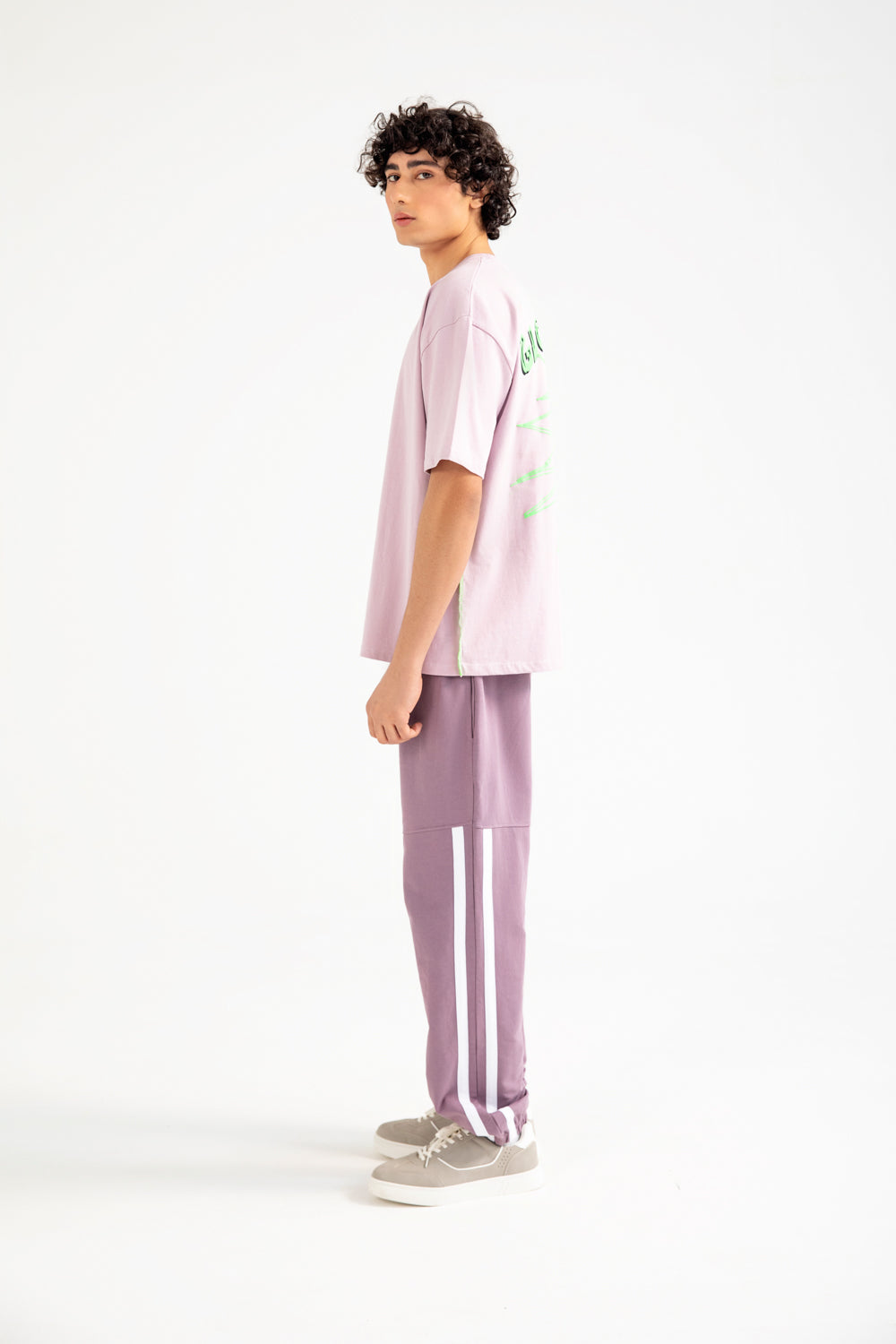 Lavender cotton tee in a relaxed baggy fit, featuring a plain front and a large graphic print on the back.