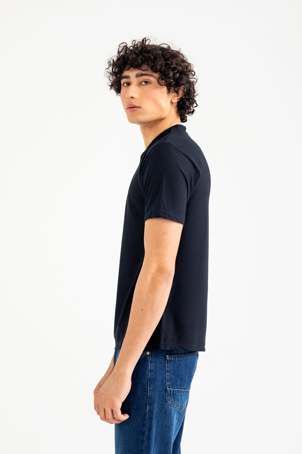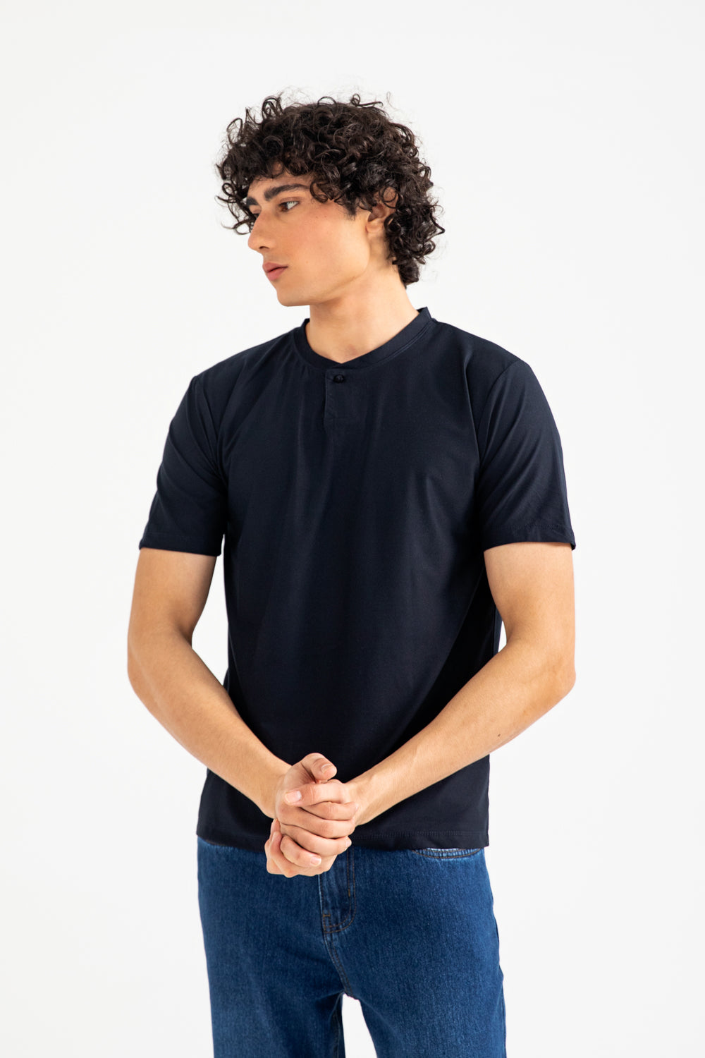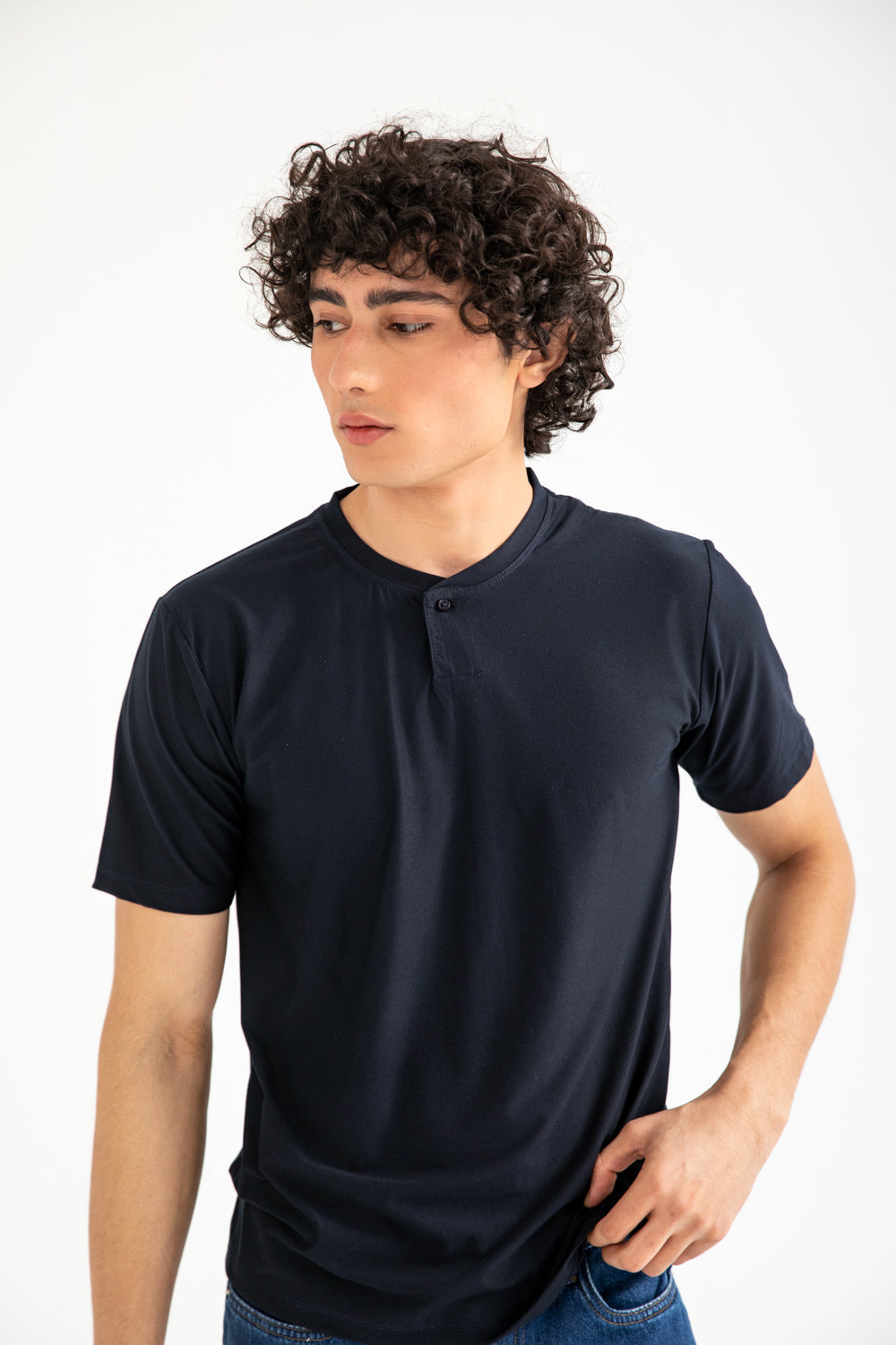 Crafted from a stretchy synthetic blend, this navy Henley tee features a clean design with a single matching button at the neckline.