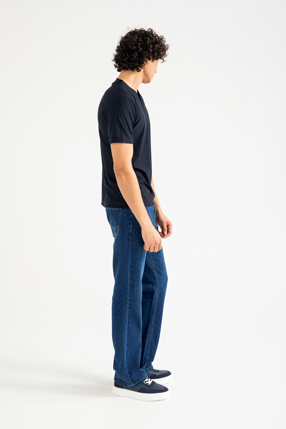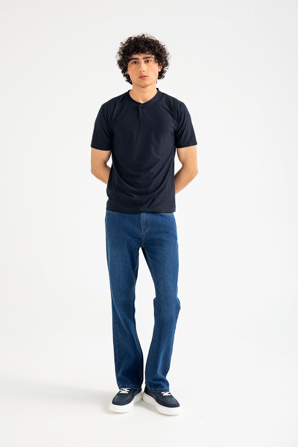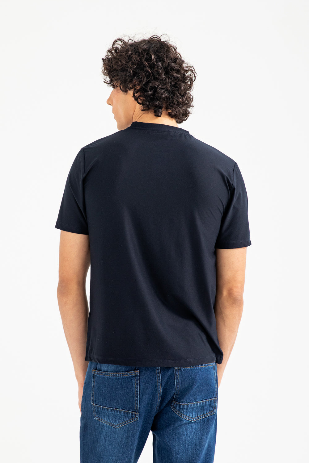 Crafted from a stretchy synthetic blend, this navy Henley tee features a clean design with a single matching button at the neckline.