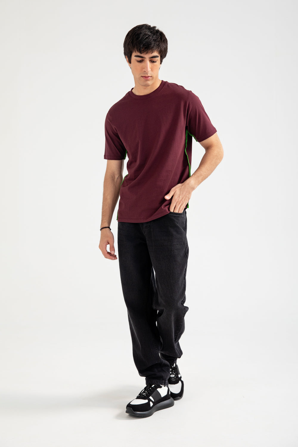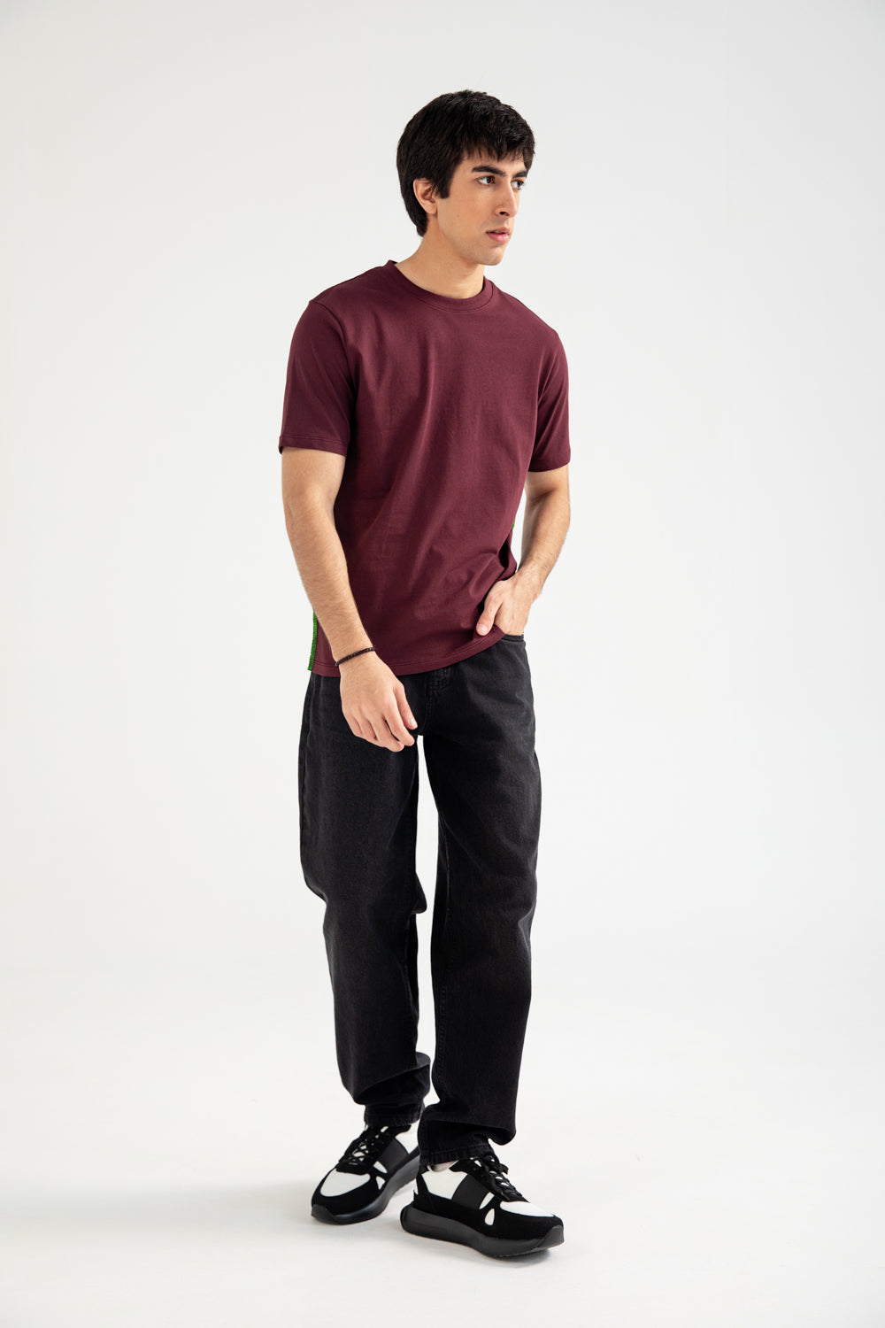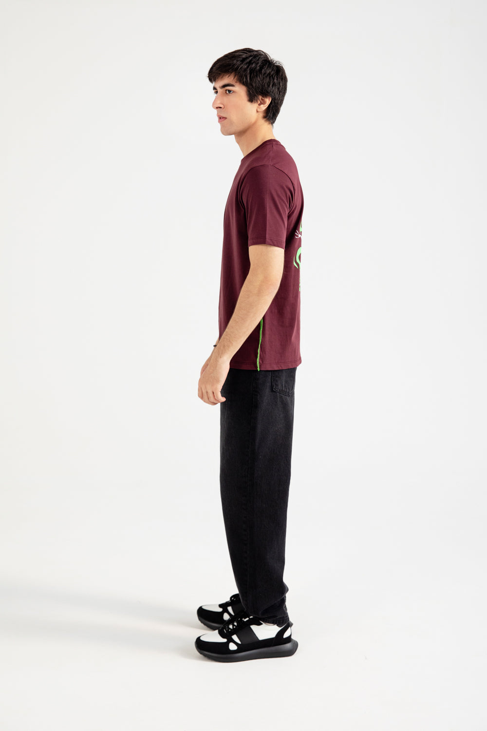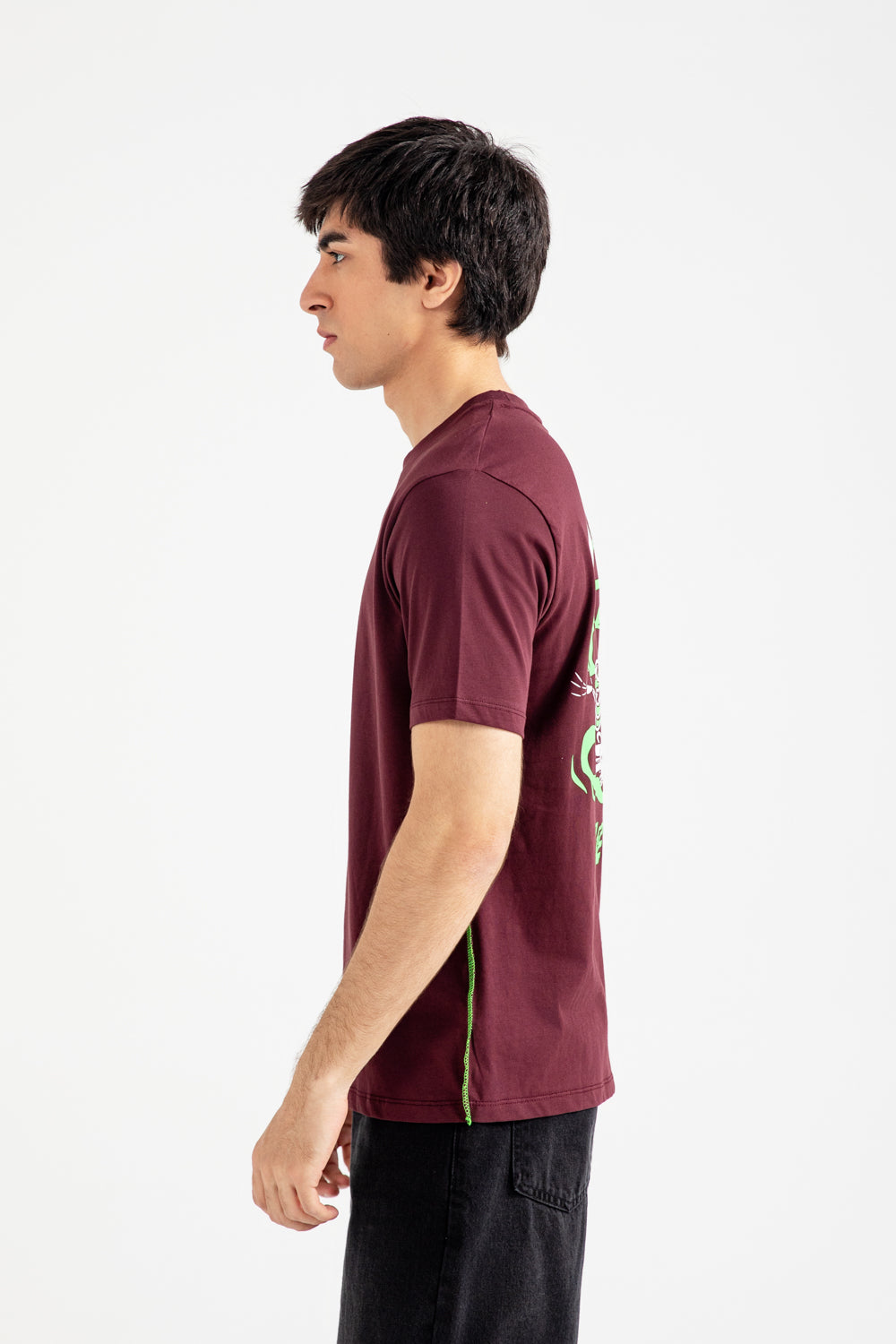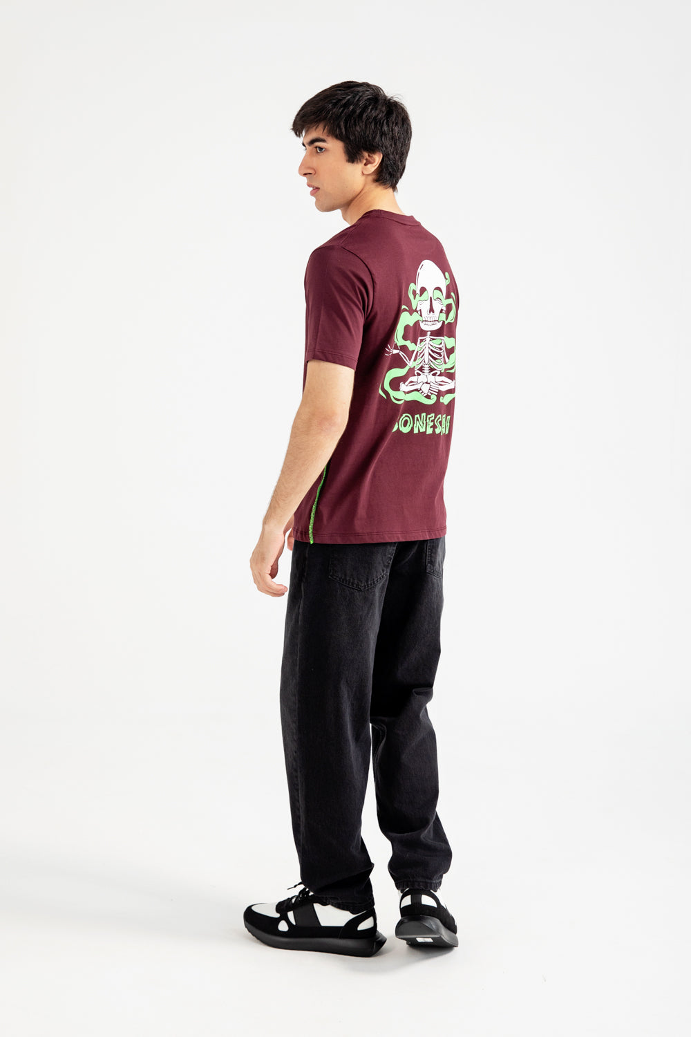 Burgundy cotton tee with a plain front and a large graphic print across the back.