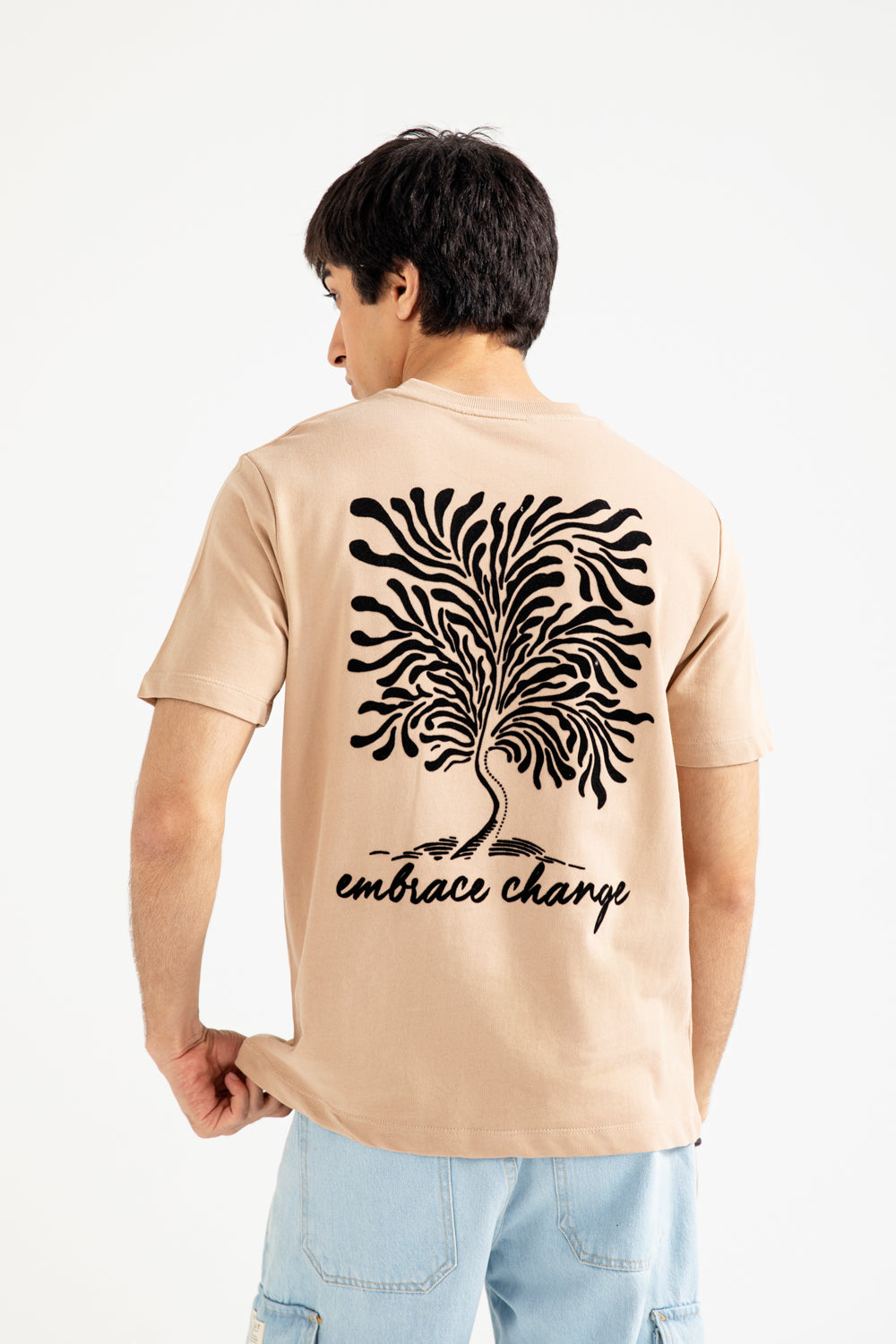 Crafted from cotton terry, this khaki tee features a clean plain front and a bold black flock printed graphic covering the back.