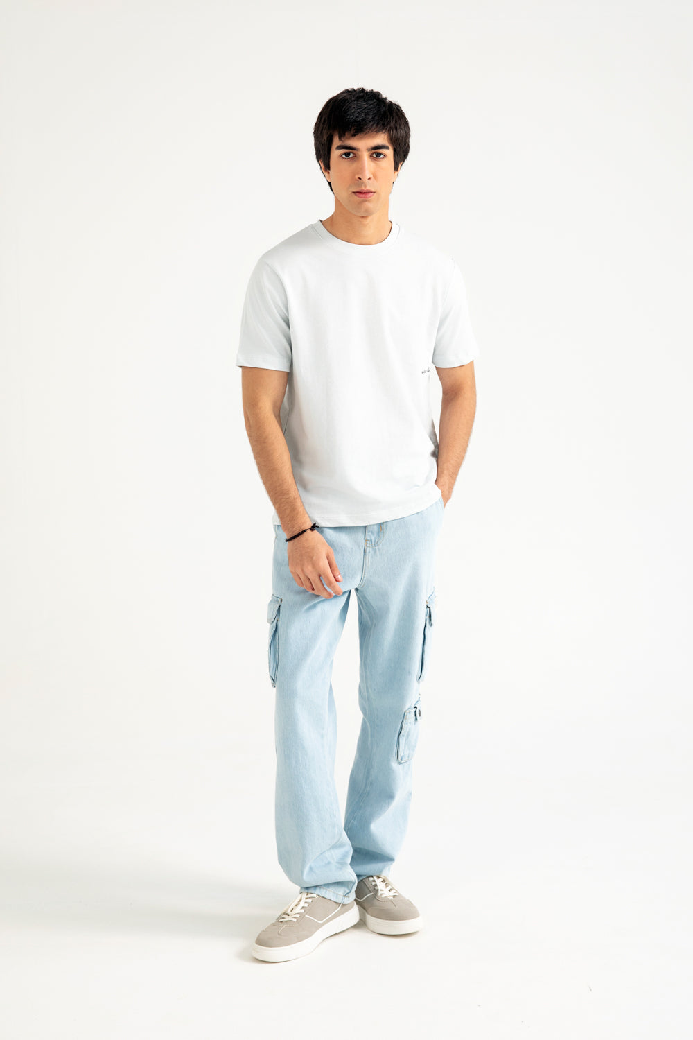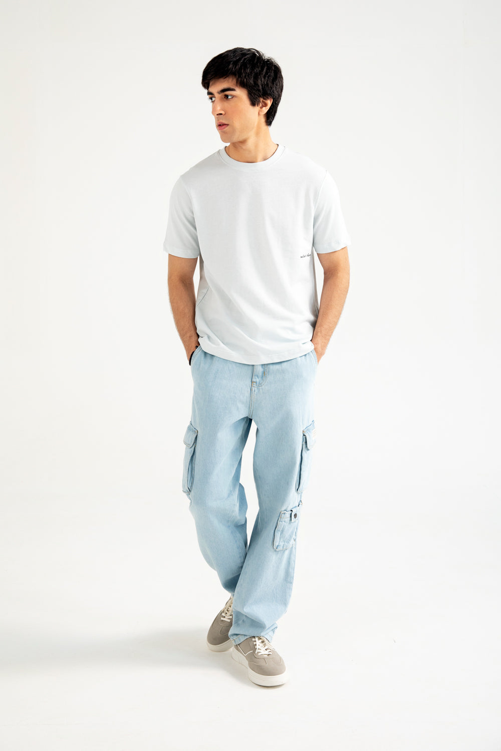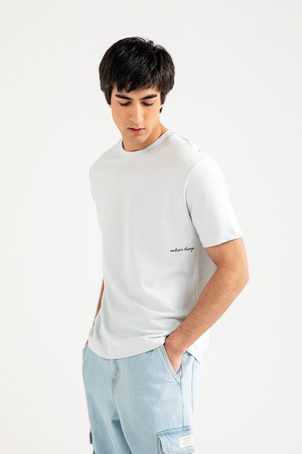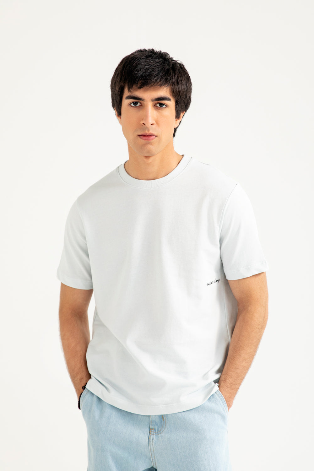 Crafted from cotton terry, this light grey tee features a clean plain front and a bold black flock printed graphic covering the back.